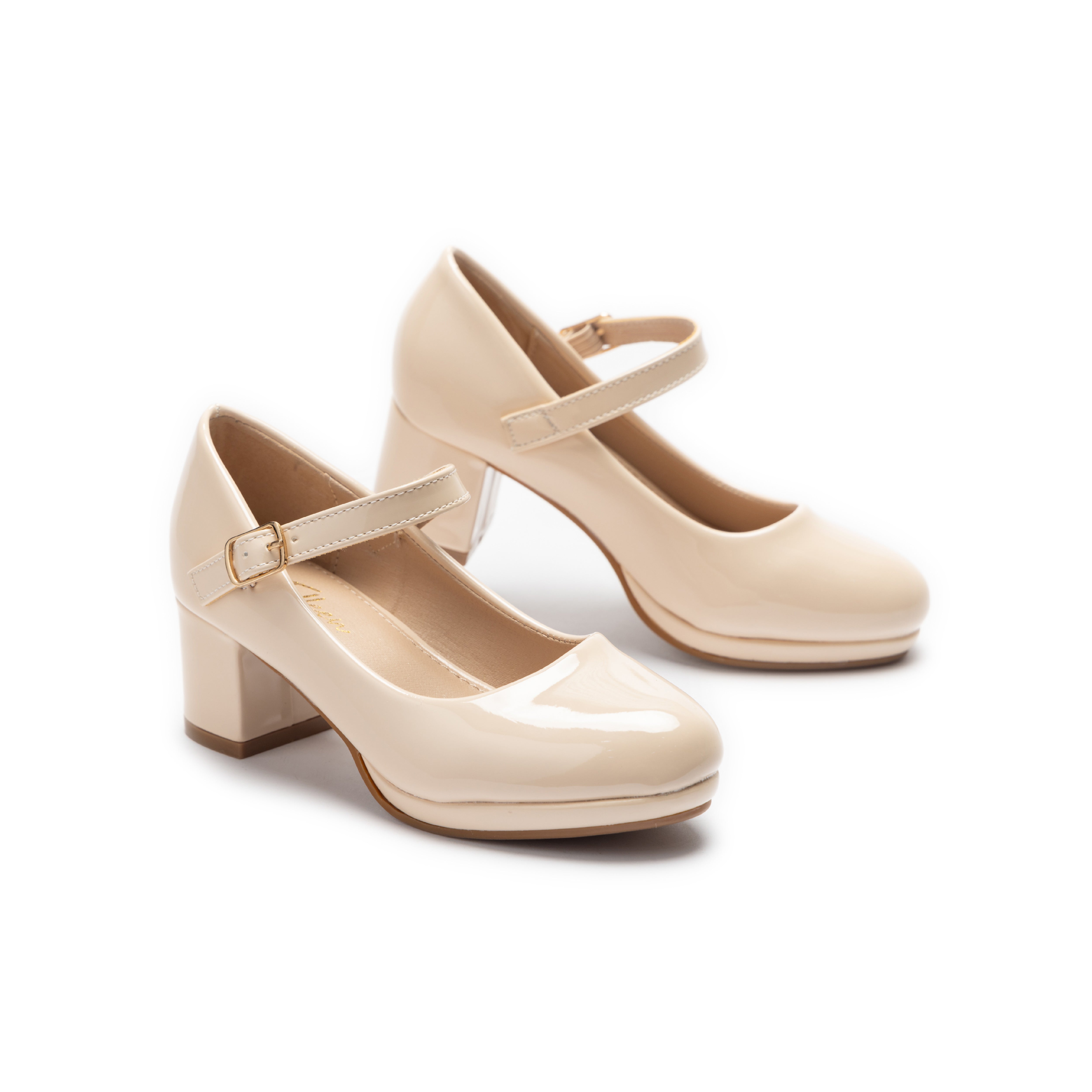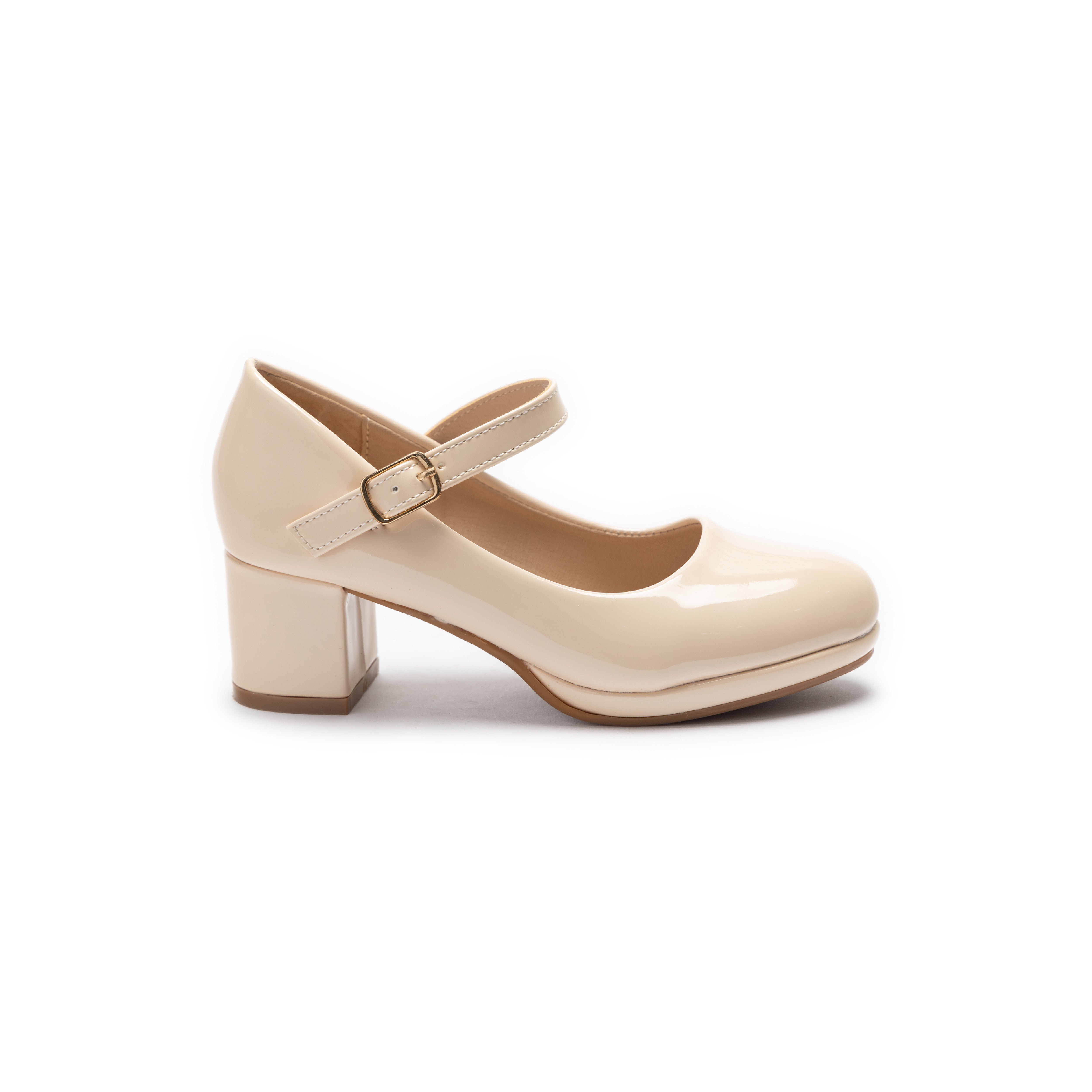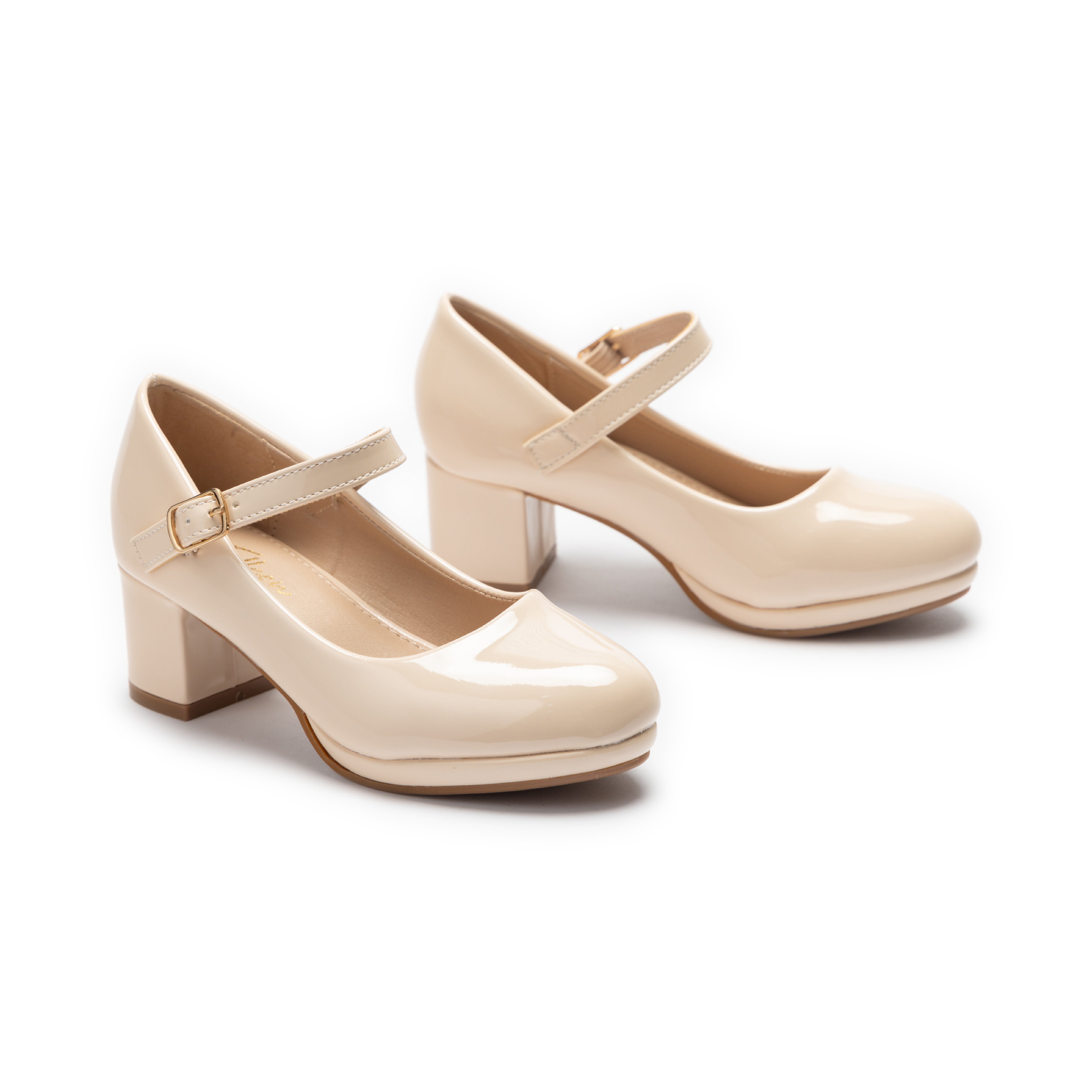 The Aurelia shoes bring timeless elegance with their glossy patent finish, rounded toe, and gold-buckle strap. A mid-height block heel adds comfort and sophistication, making them versatile for both formal and semi-formal occasions.