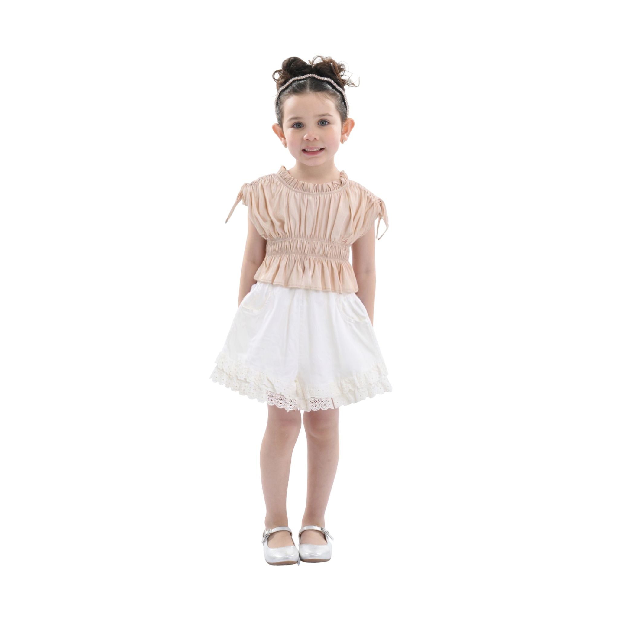 Made from soft, breathable fabric, it’s designed for all-day comfort—ideal for both dressy moments and everyday fun. A lovely blend of classic tones and girly charm, this outfit is as versatile as it is adorable.