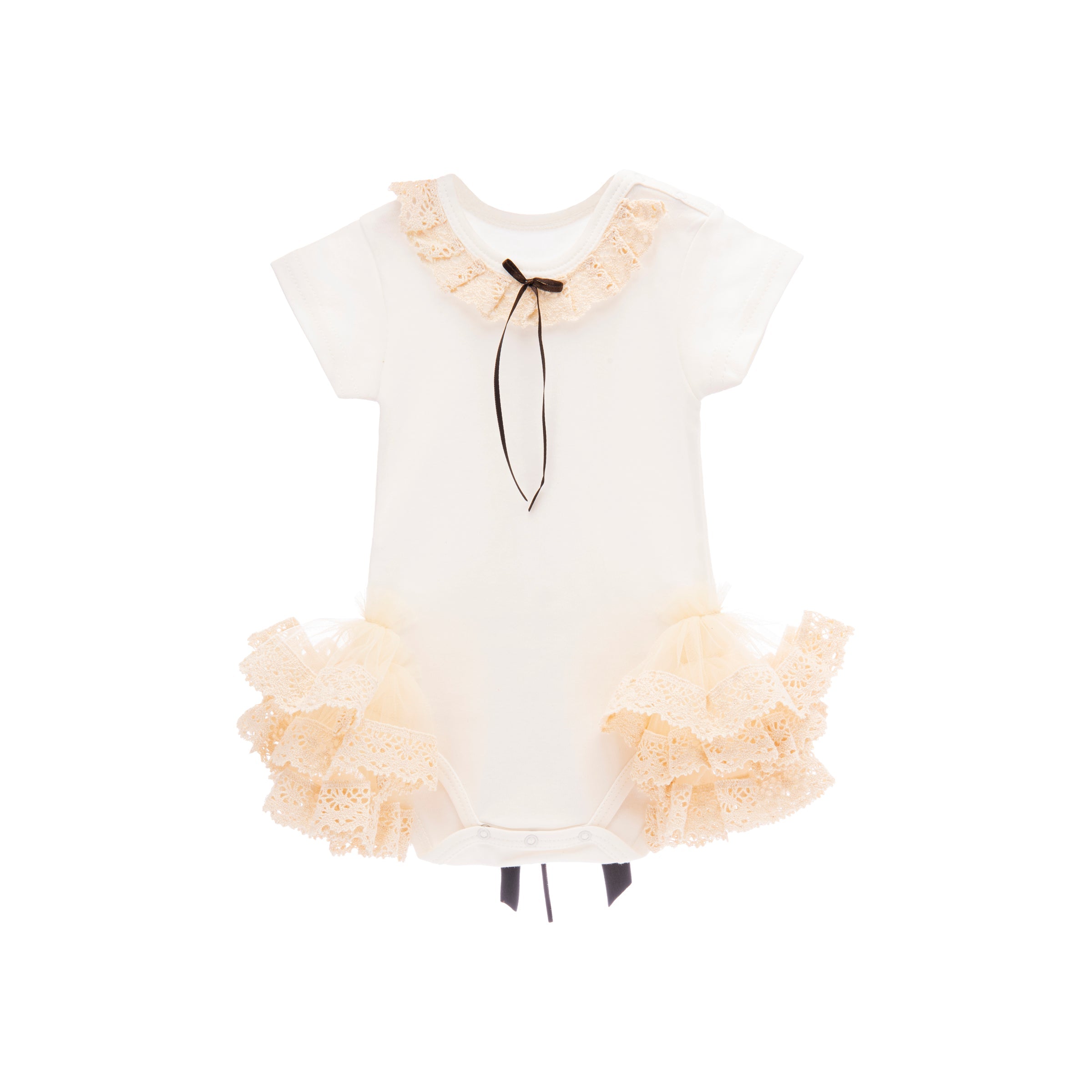 Beige ruffled babysuit tulle dress for baby girls from Tulleen. Featuring a white short sleeve babysuit with beige tulle ruffled collar, beige ruffle tulle on the sides and black string bow closure in the back.