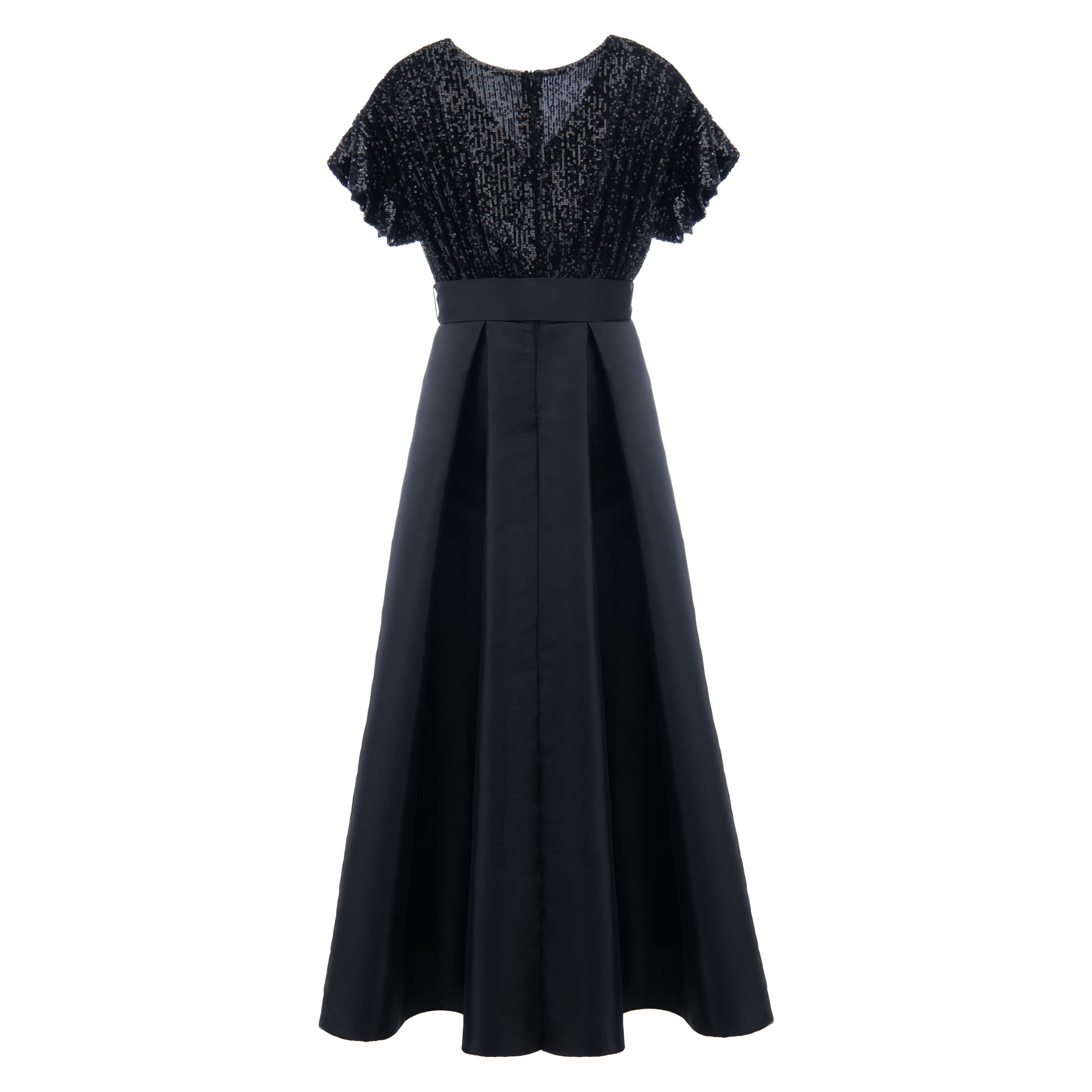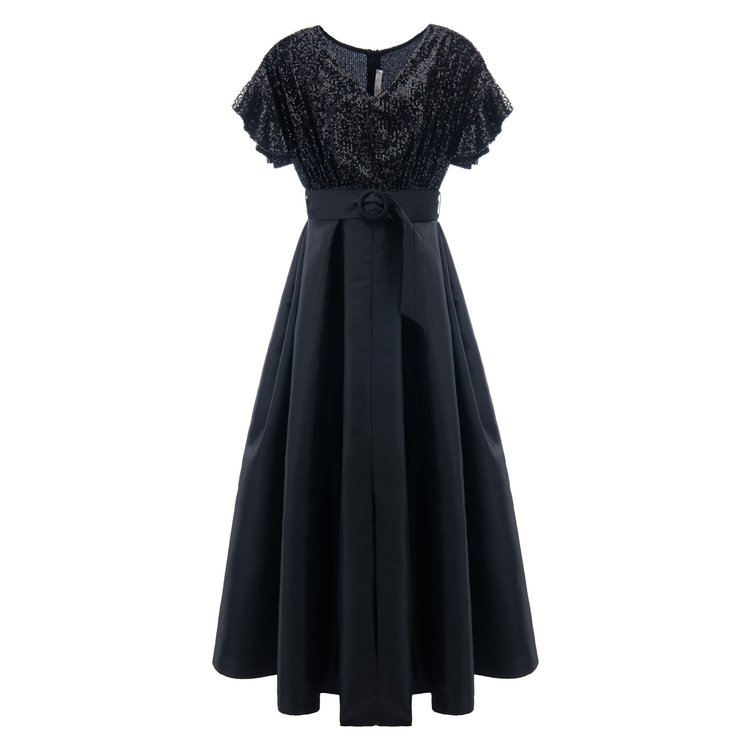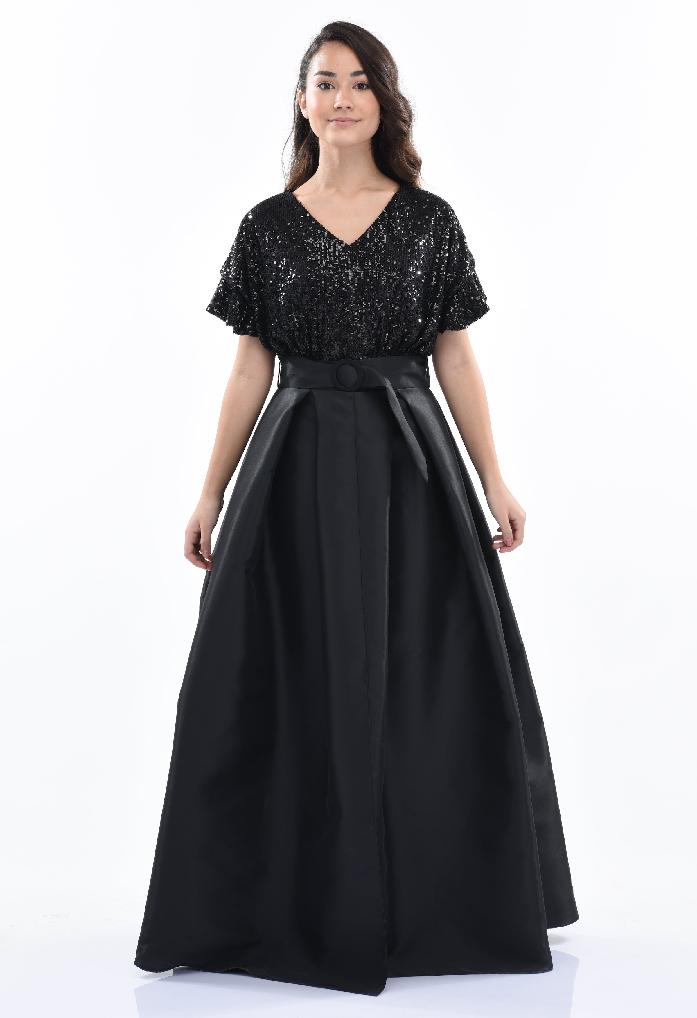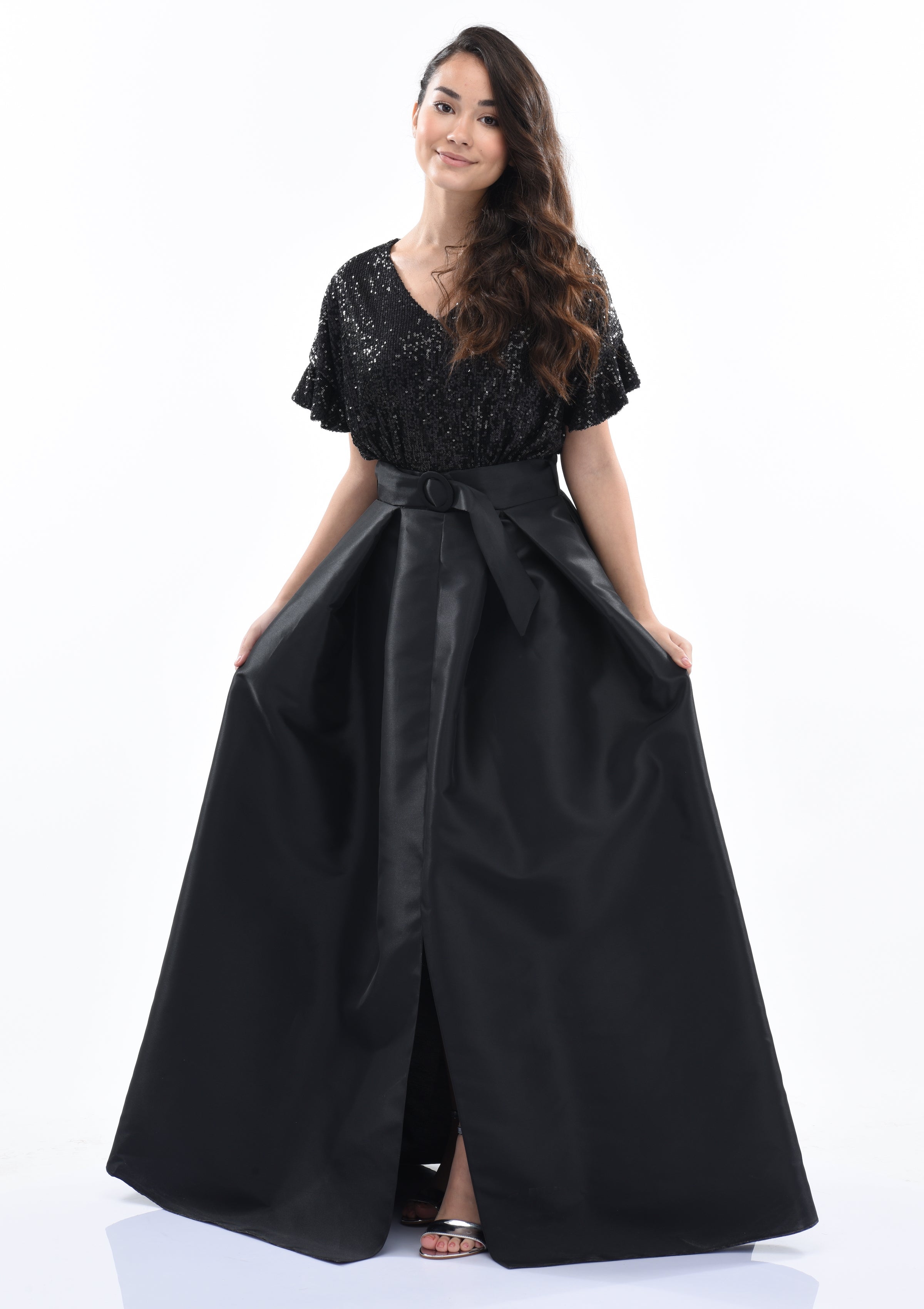 Black Arcola glimmer tulle gown for junior girls from Tulleen. A formal and fashionable glimmered bodice design, ruffle sleeves, black belt and lightweight double layered tulle skirt to complete this magnificent piece.