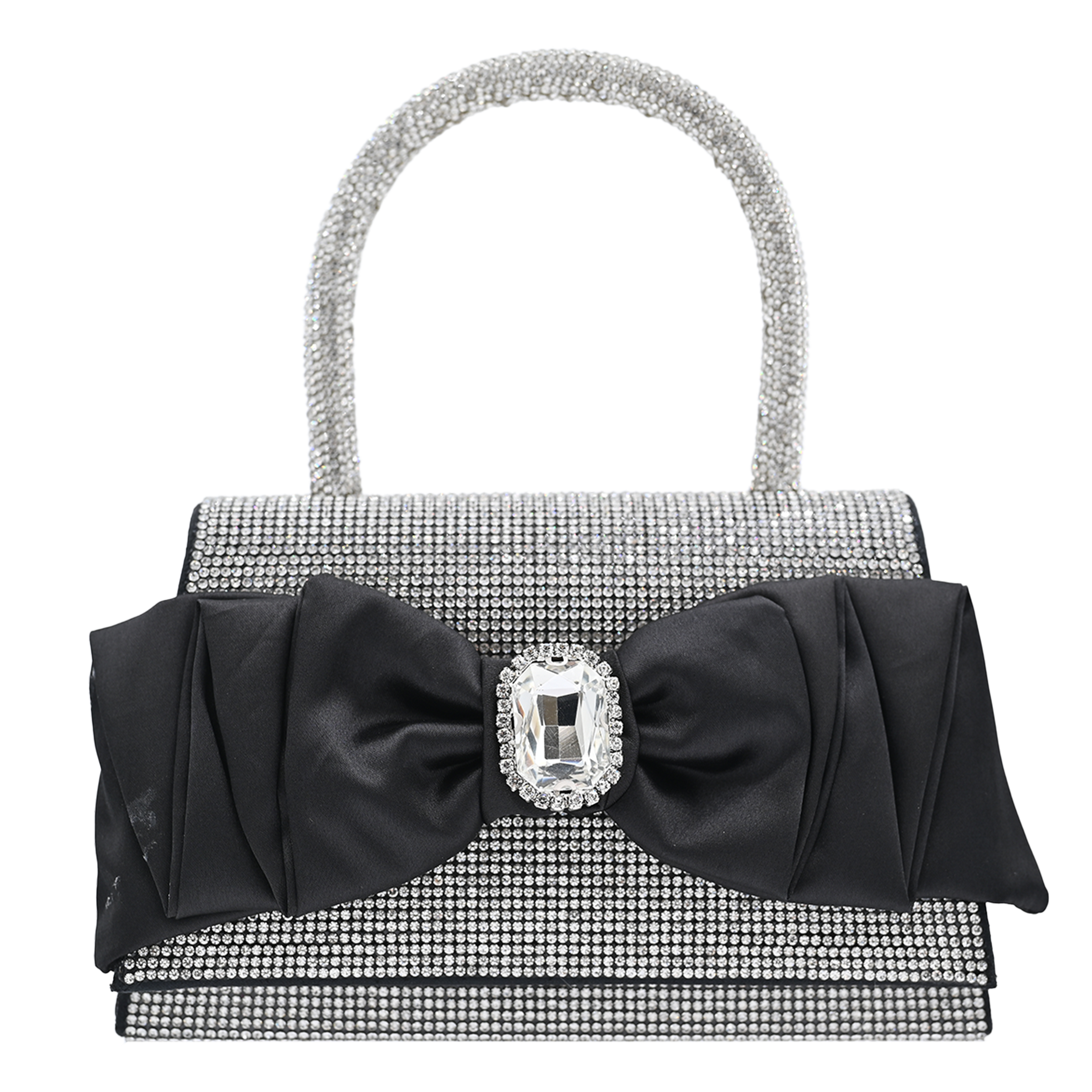 A beautiful black bow, adorned with a sparkling gem at its center, adds a touch of refinement and charm. Designed with practicality and style in mind, this handbag is perfect for carrying small essentials and enhancing any outfit for special occasions.