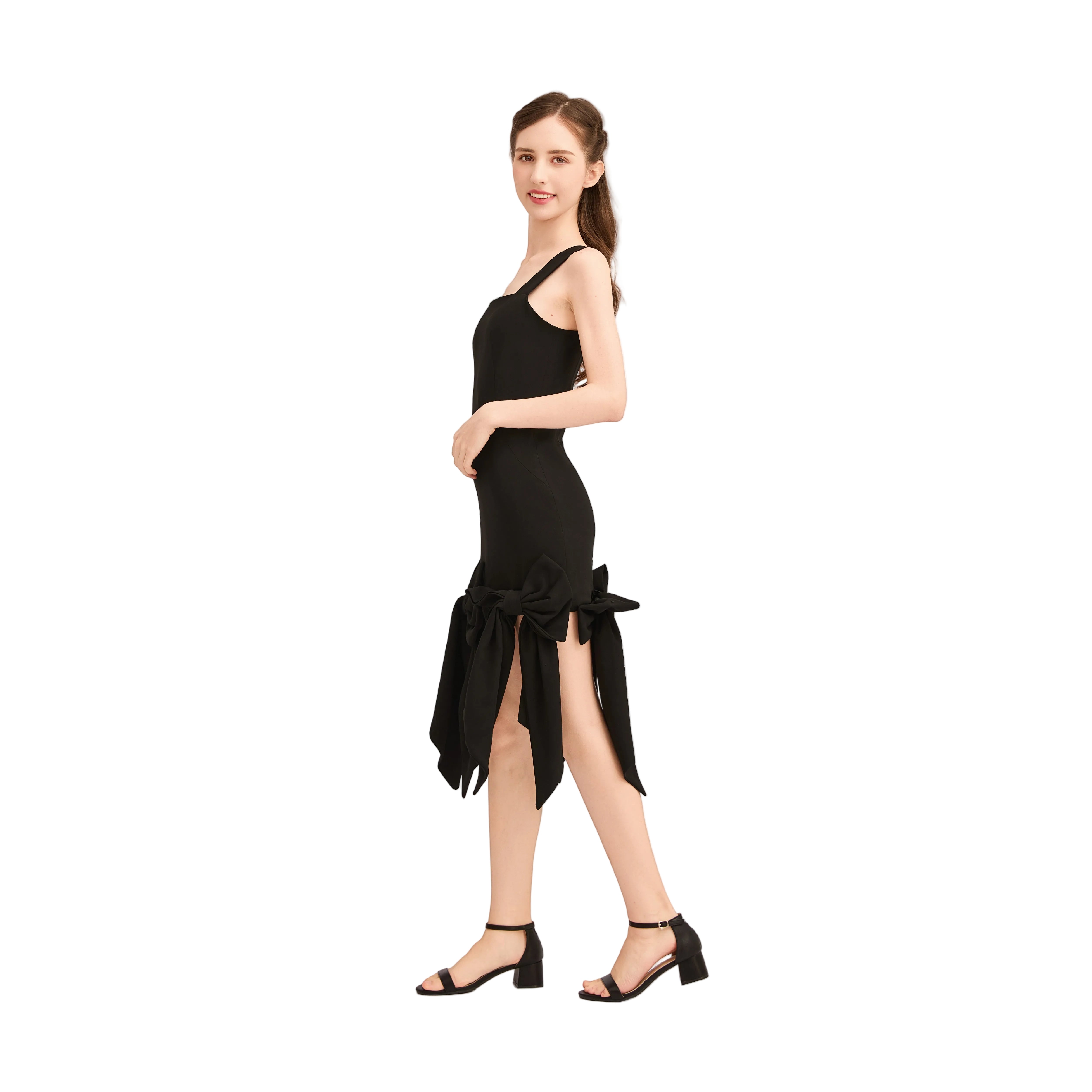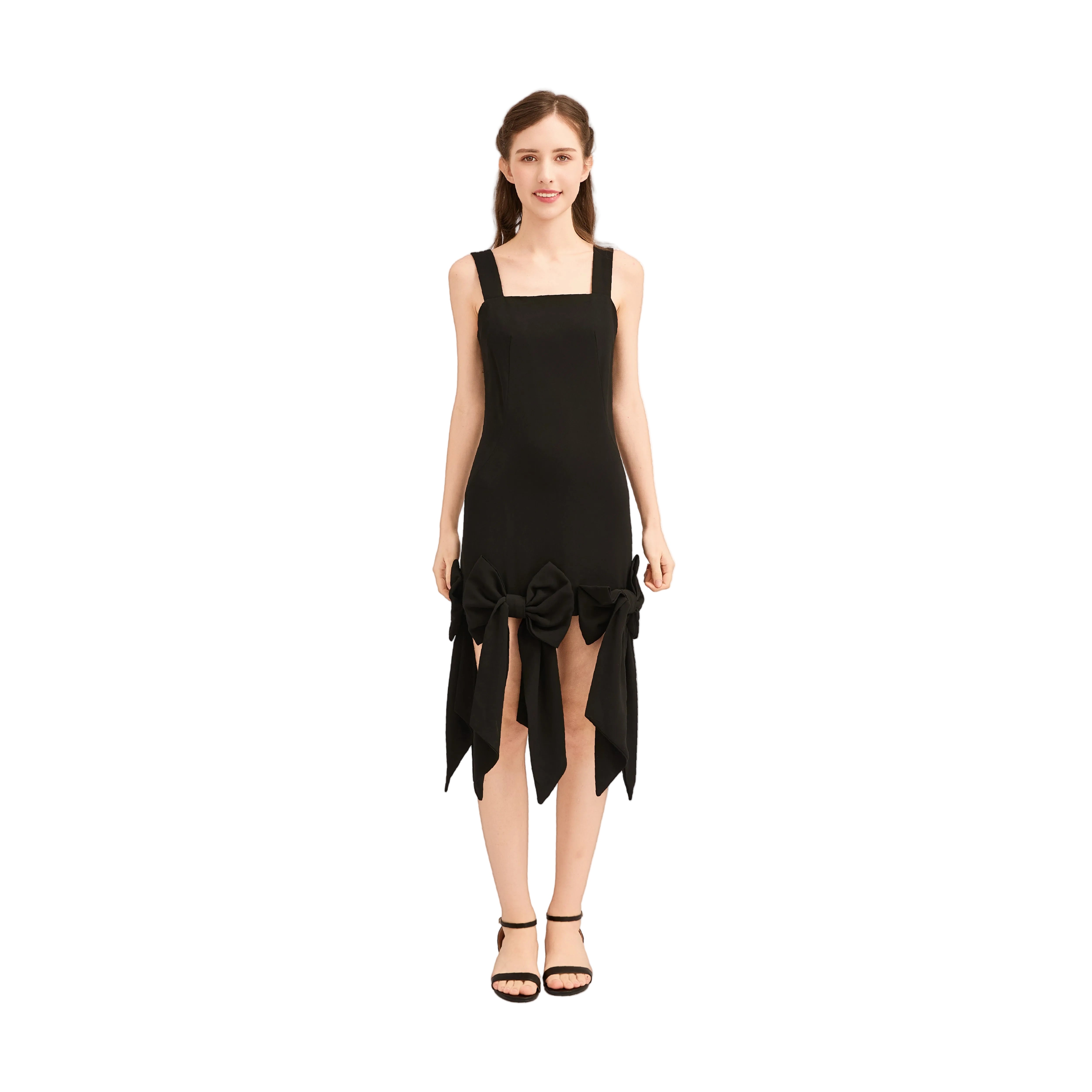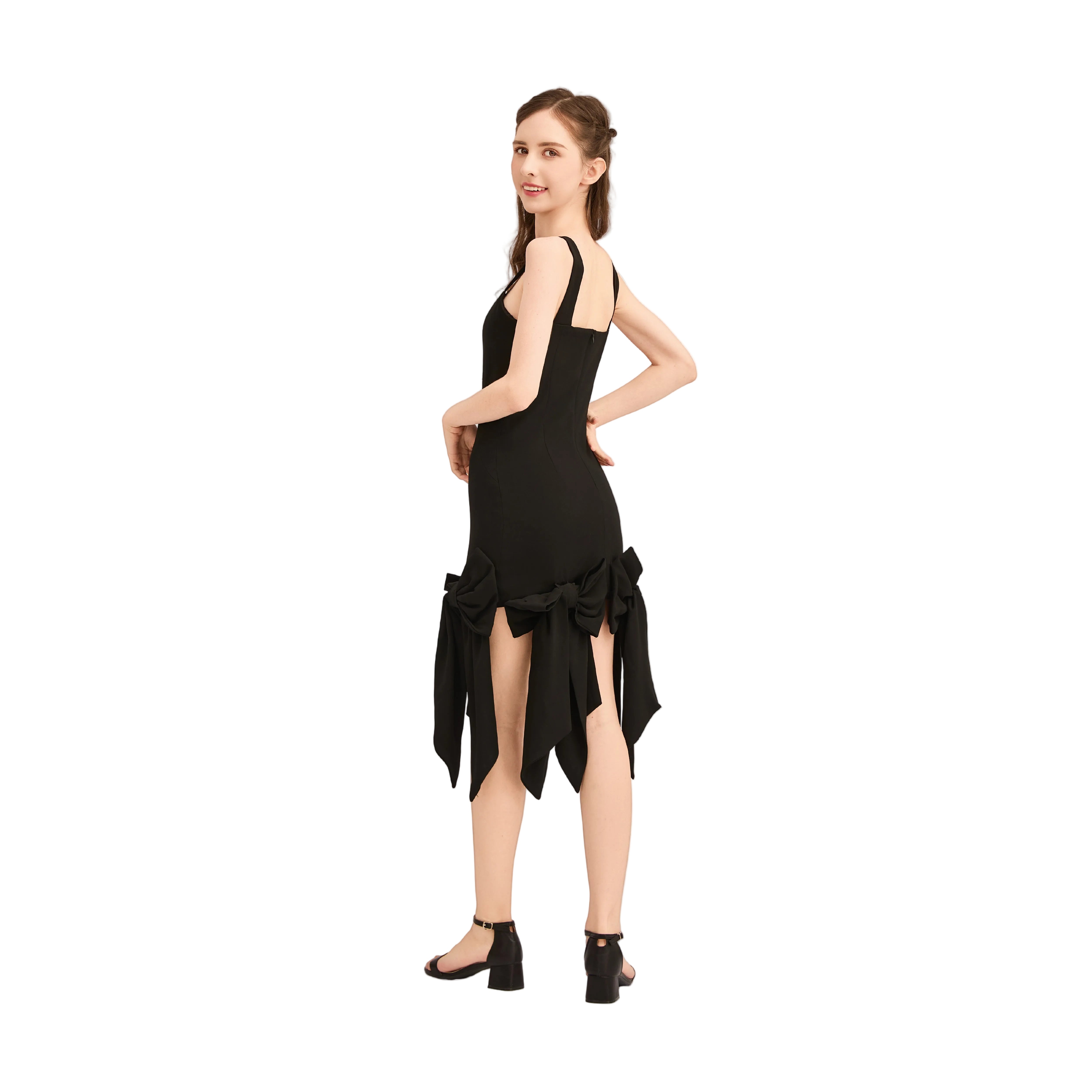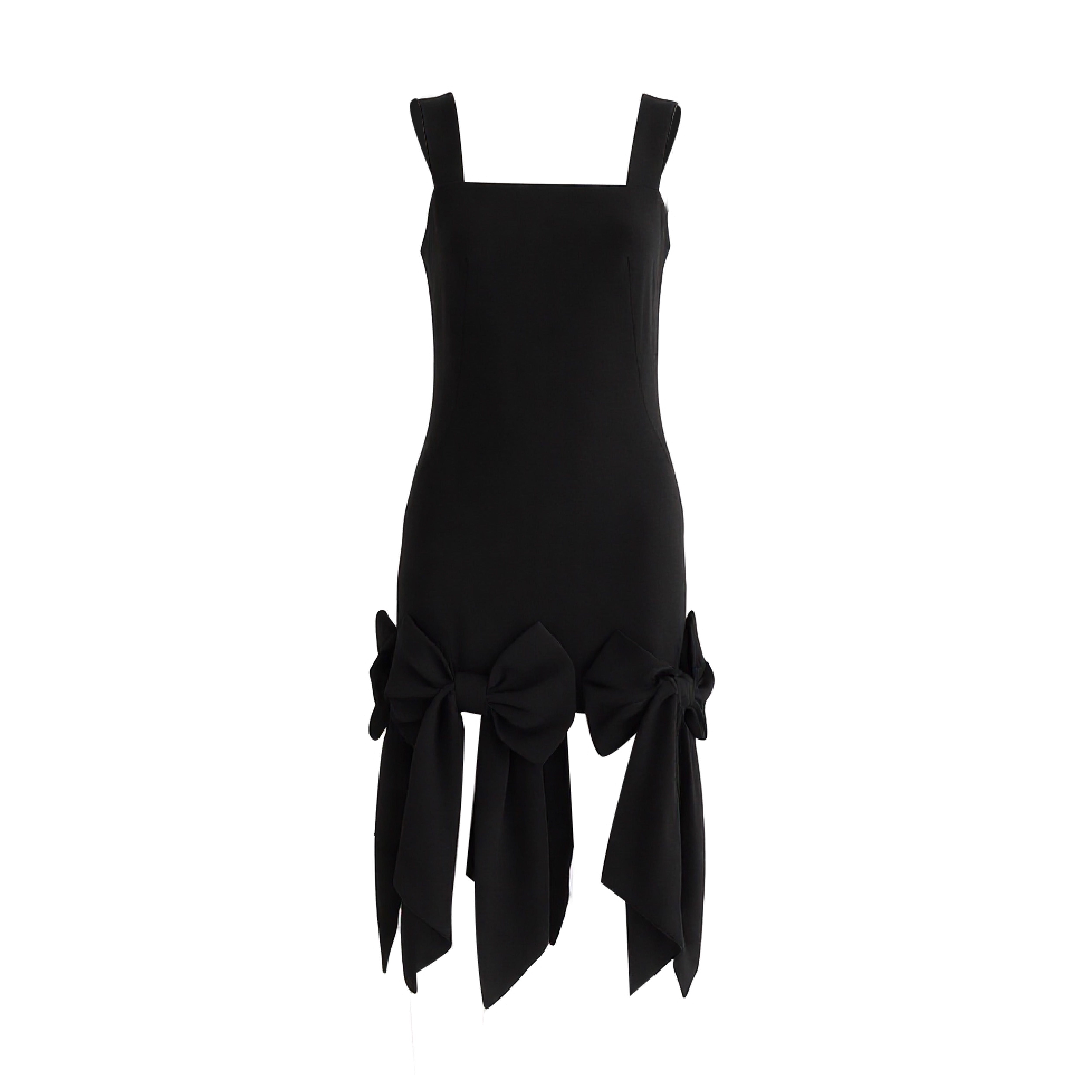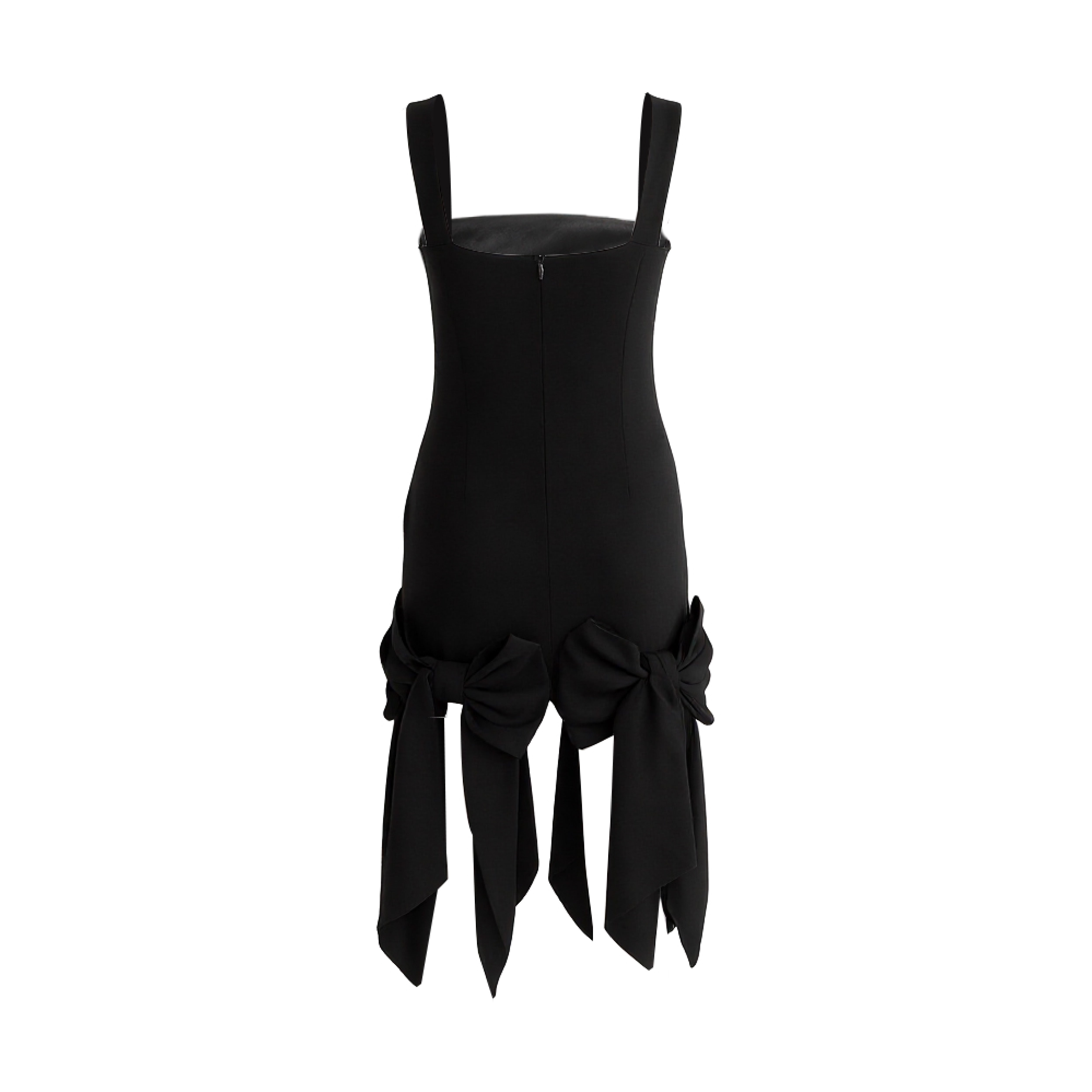 This striking sleeveless piece features a fitted silhouette with wide straps and a bold square neckline. At the hemline, two oversized bows with flowing tails transform the simple cut into a playful yet elegant statement, perfect for festive or formal occasions.