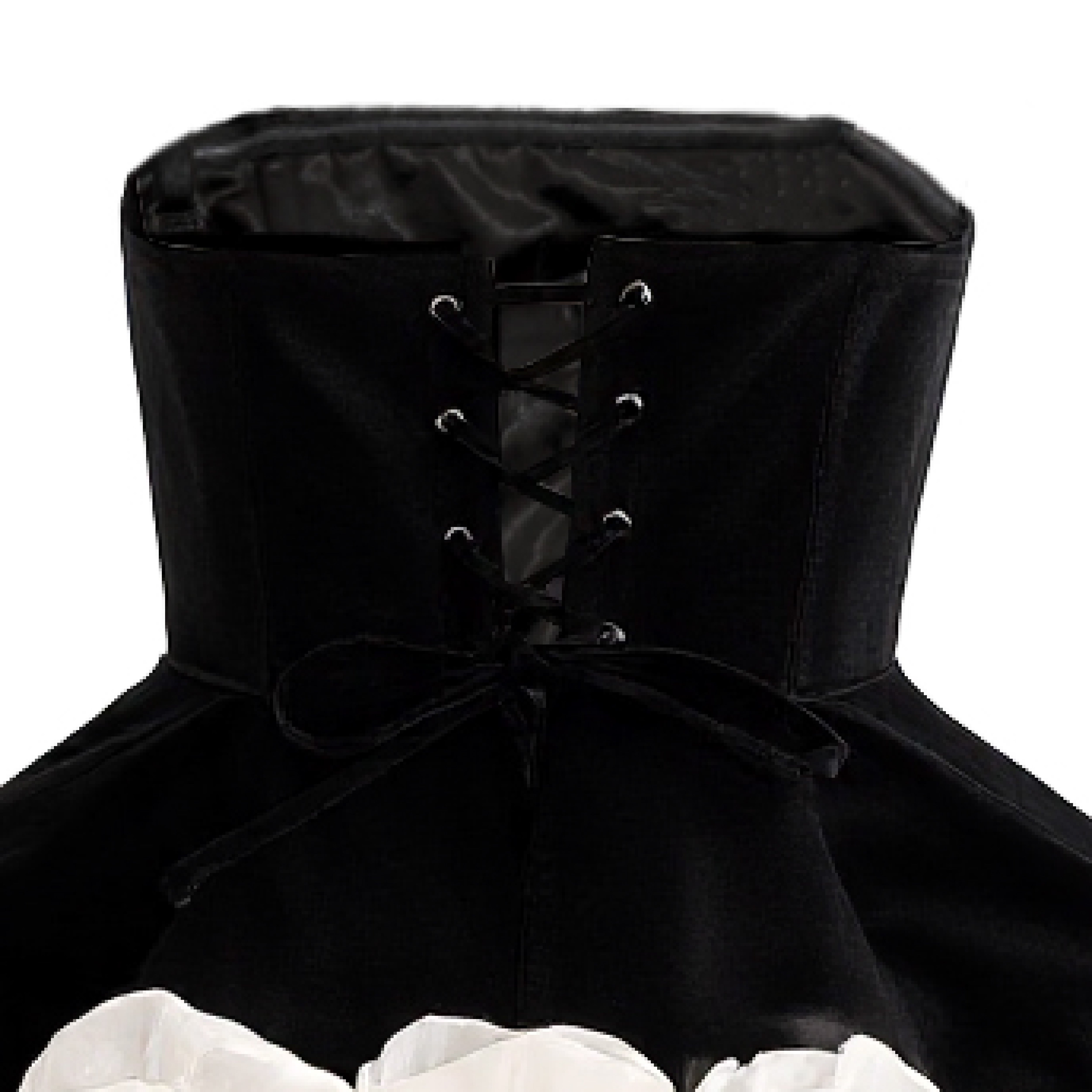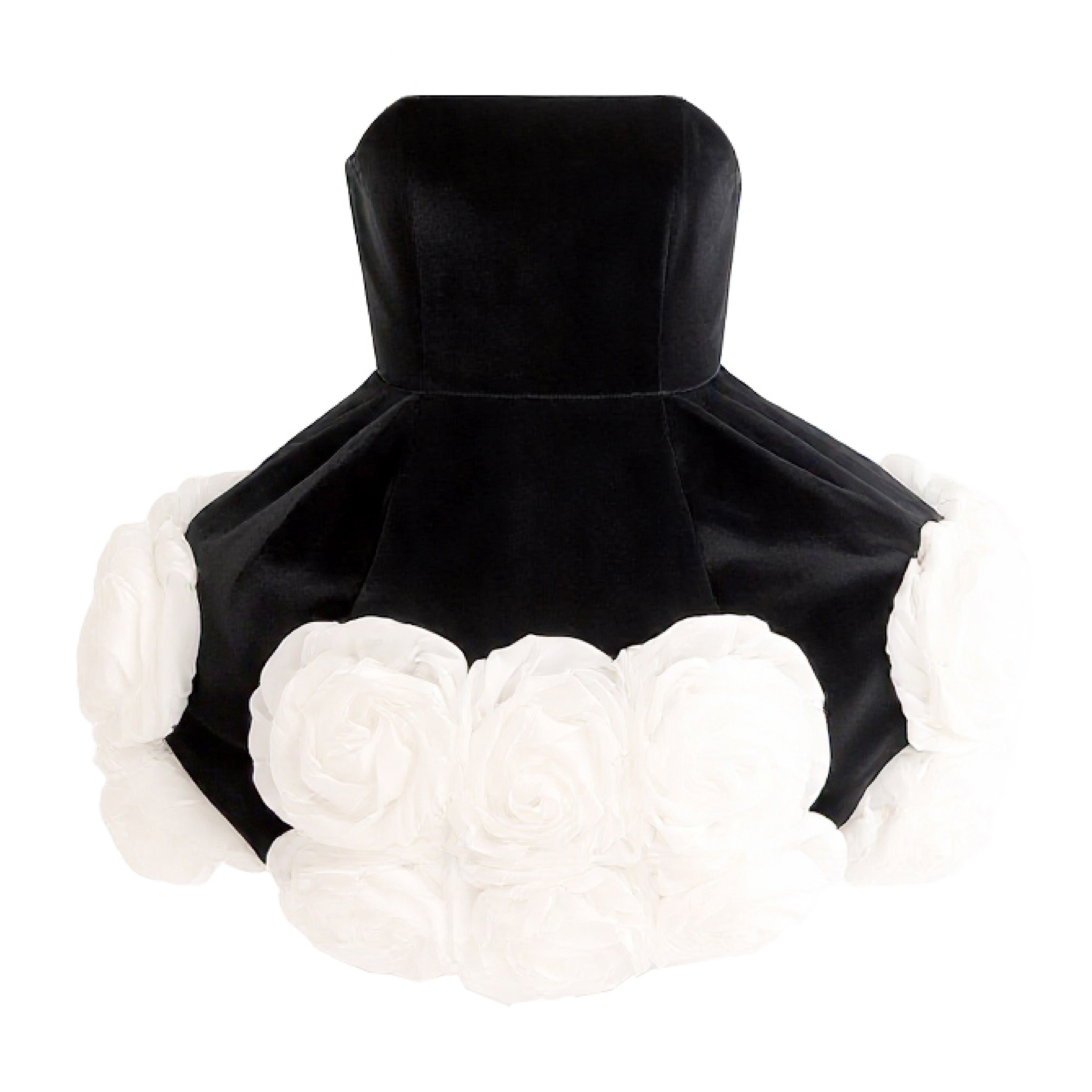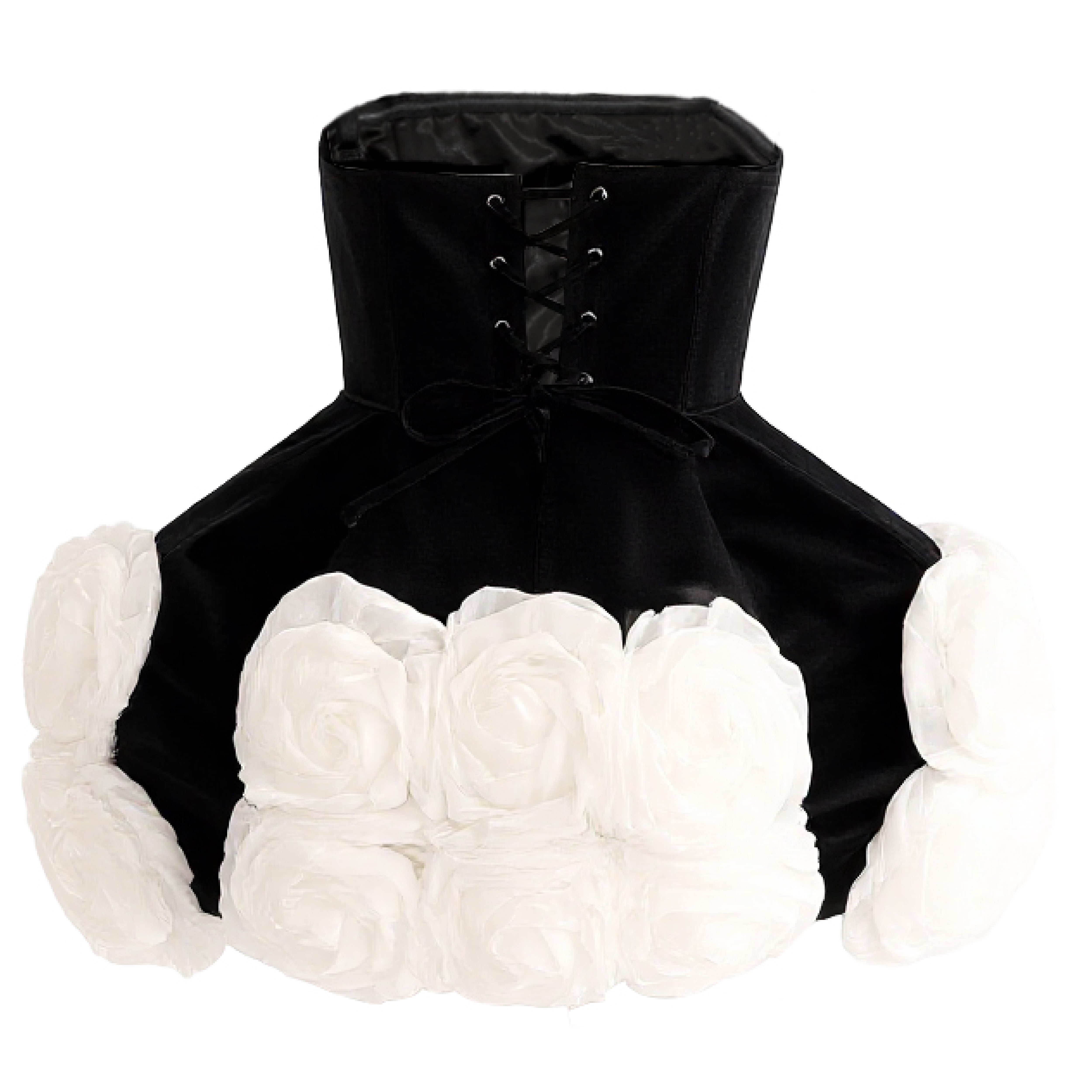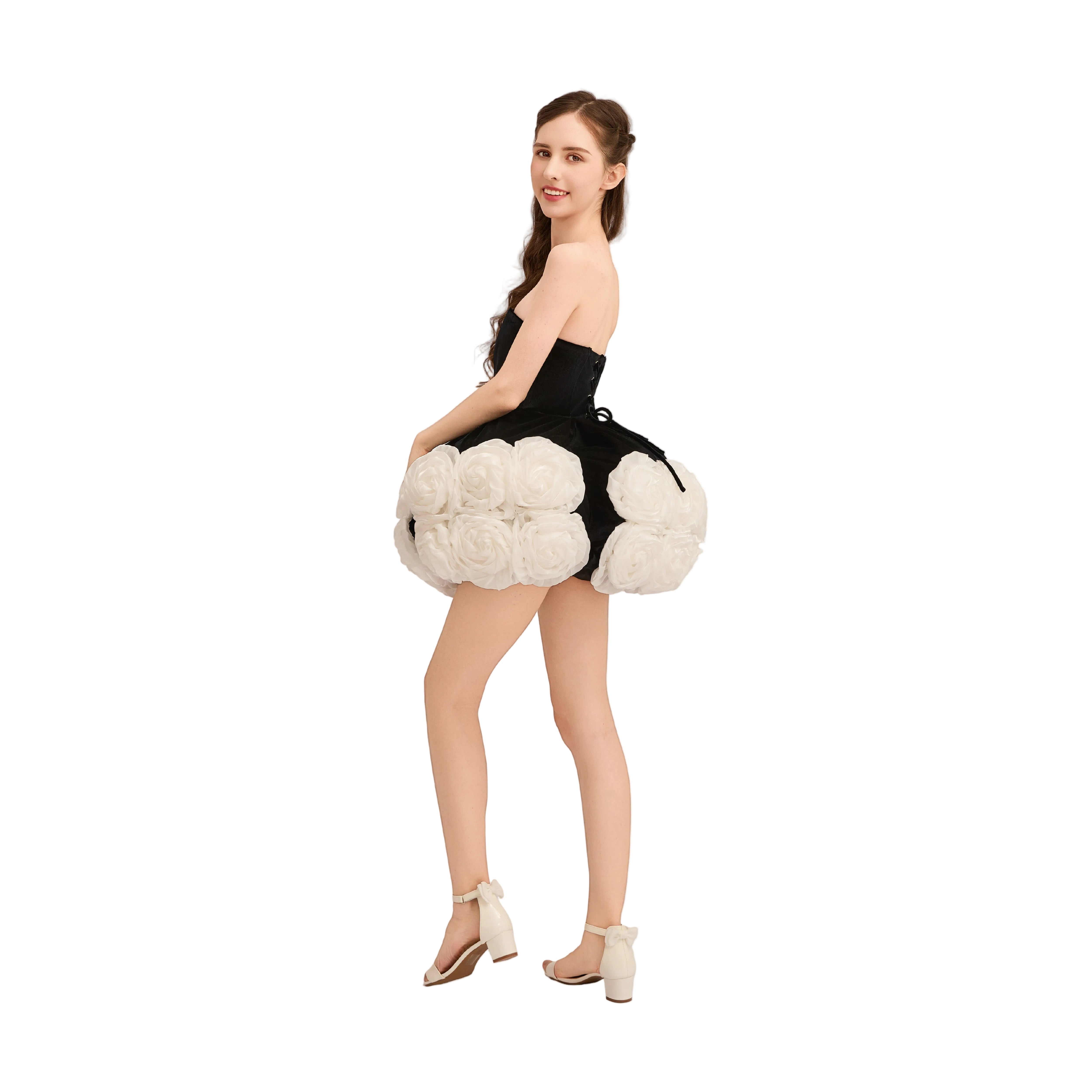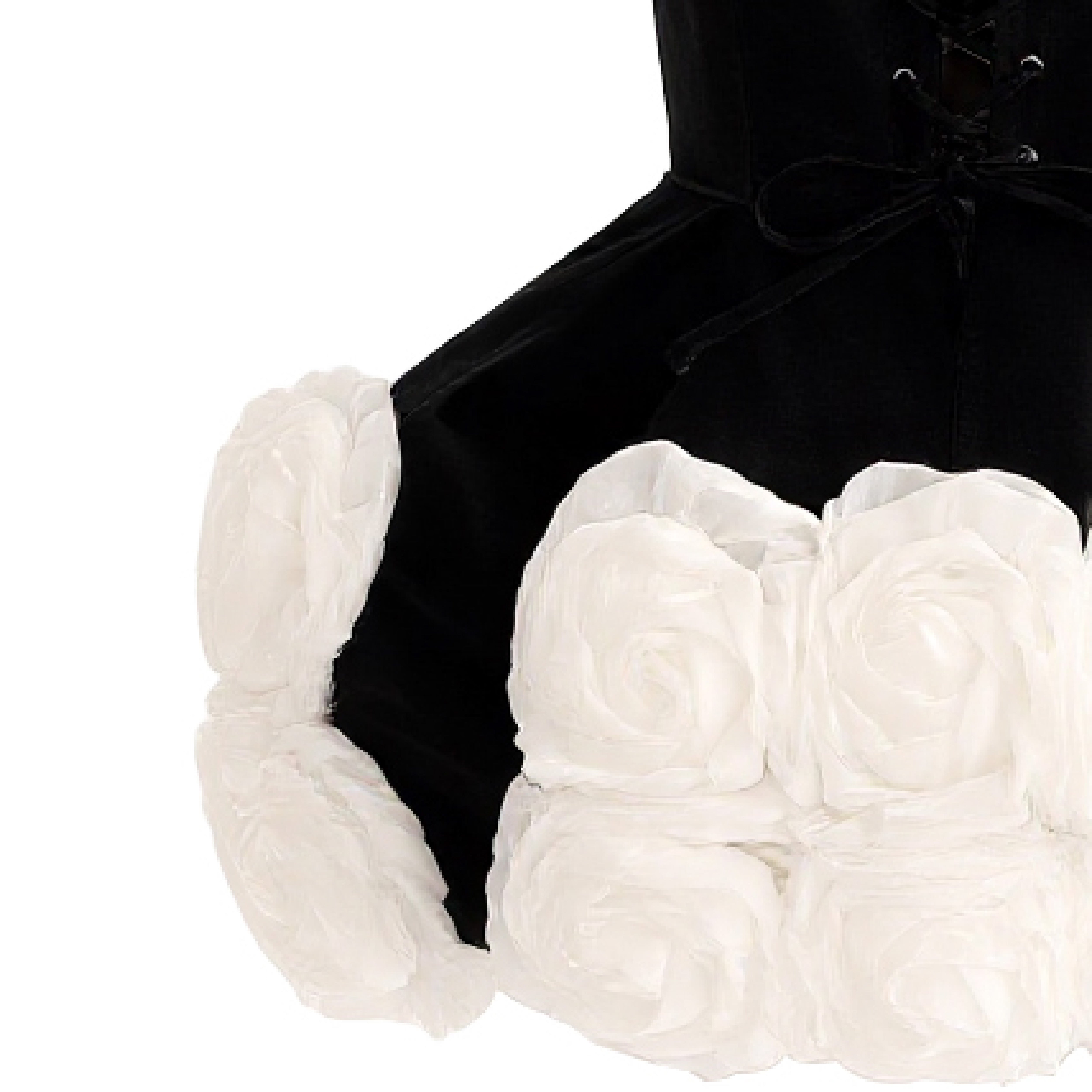 This striking gown blends timeless elegance with avant-garde artistry. The strapless bodice flows into a voluminous skirt, dramatically adorned with oversized floral appliqués that resemble sculpted roses. The bold contrast creates a captivating silhouette, perfect for high-fashion events or editorial showcases.