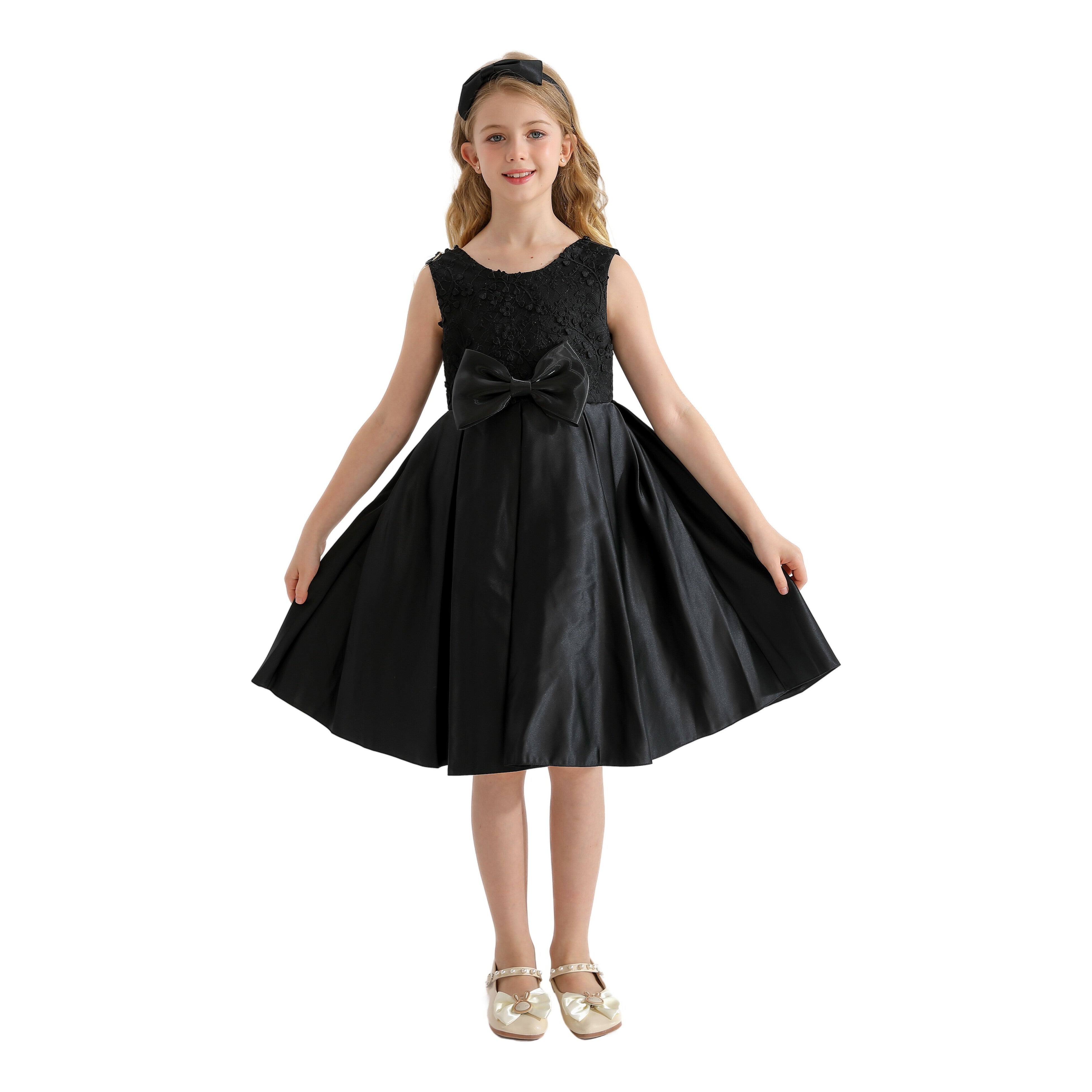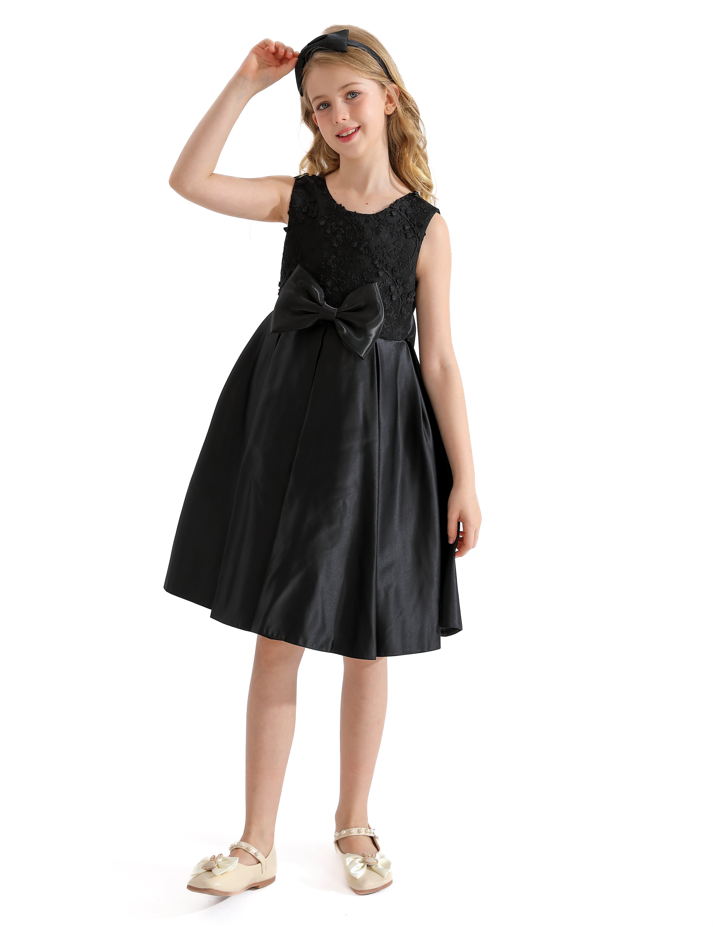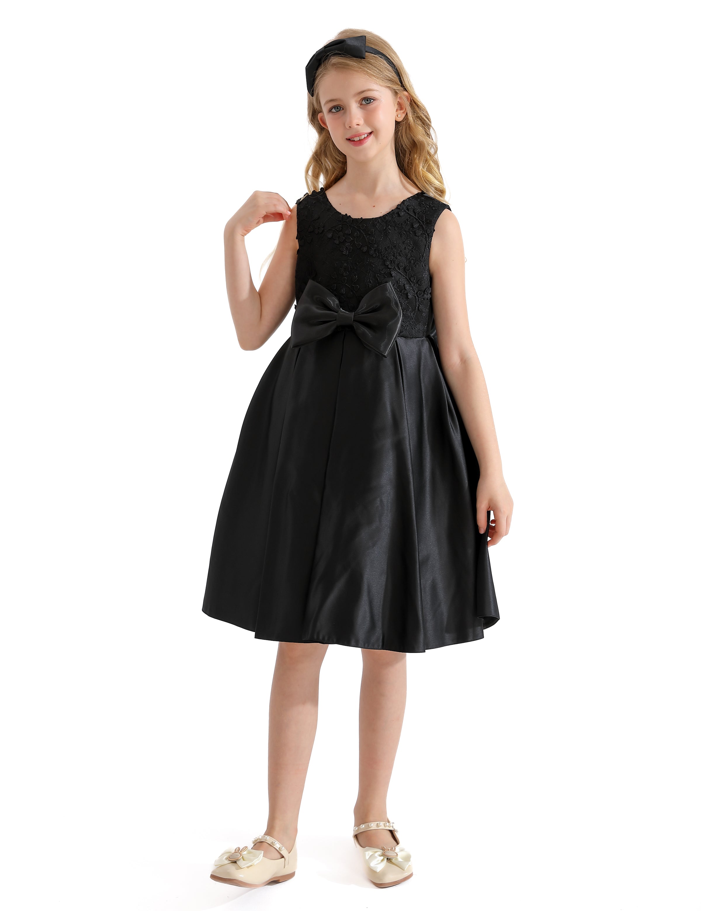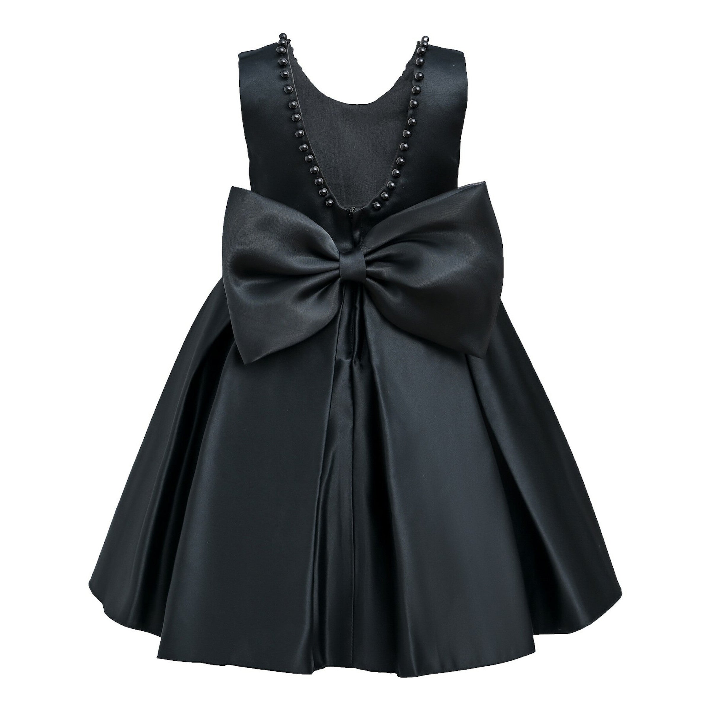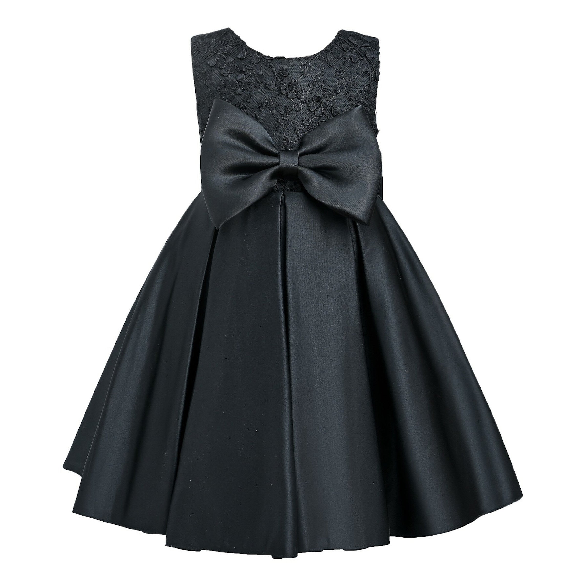 The Black Hampton Sleeveless Double Bow Dress for kid girls from Tulleen is an elegant and stylish choice for any special occasion. This dress features a sleeveless floral embroidered bodice, providing a sophisticated and charming look. Firstly, the large bows in the front and back add a touch of whimsy and elegance.