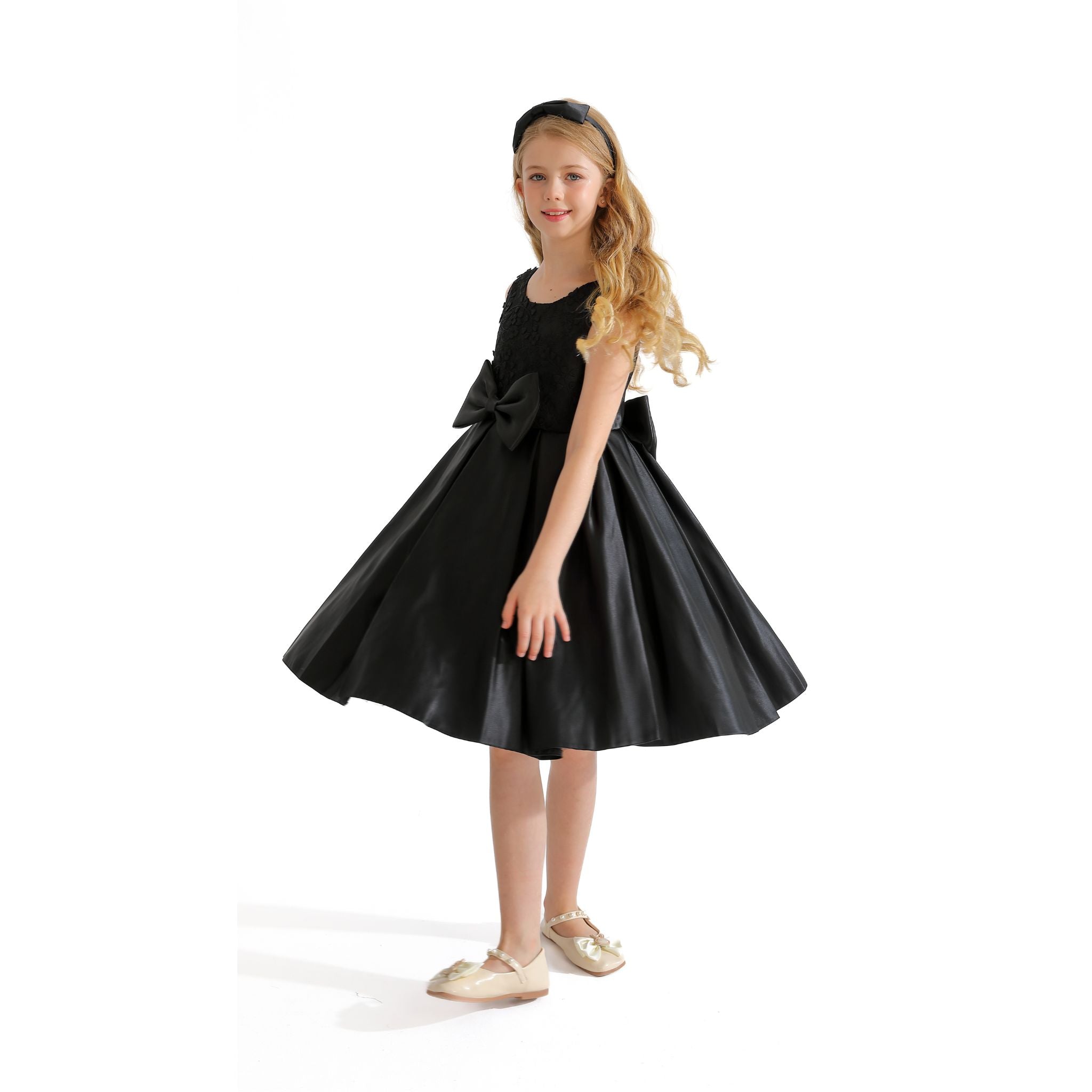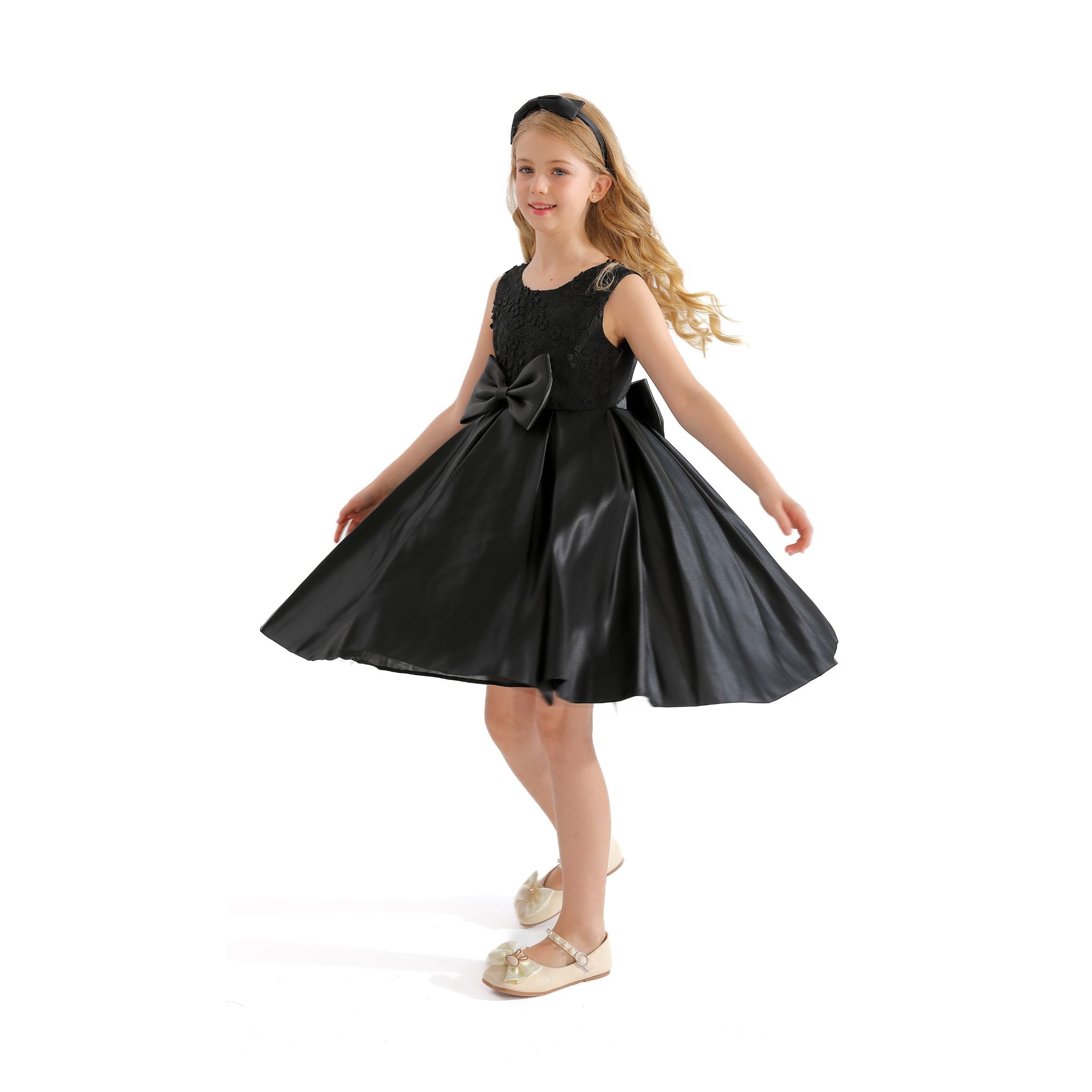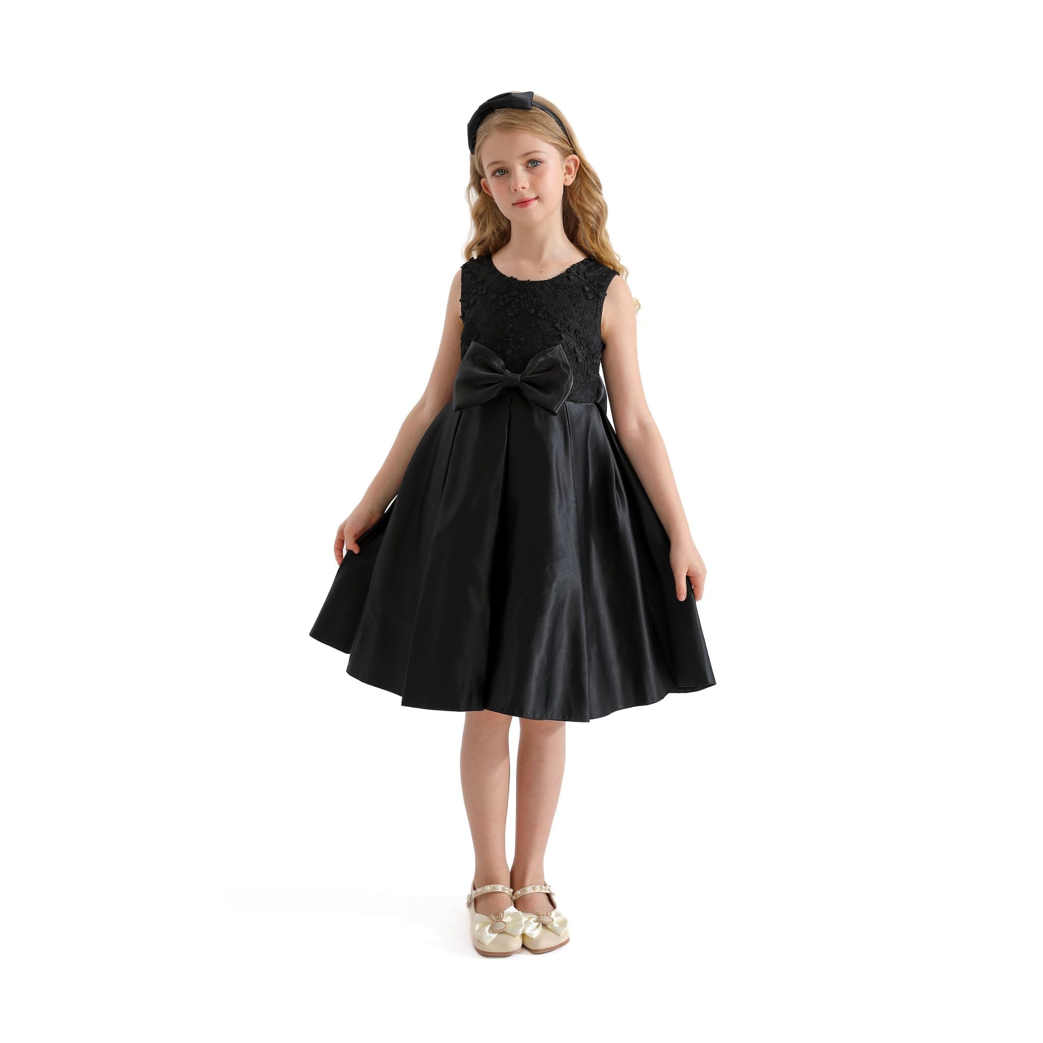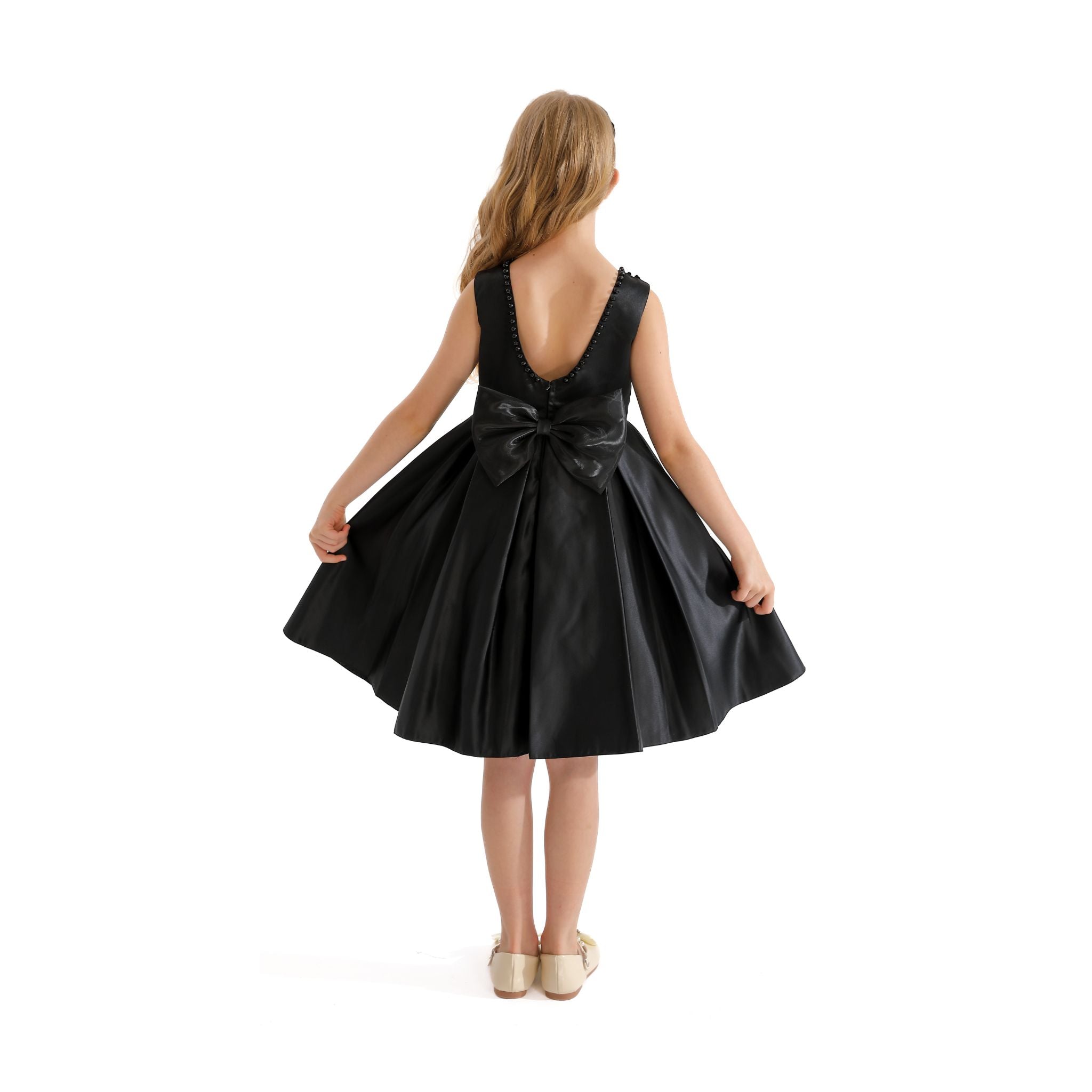 The Black Hampton Sleeveless Double Bow Dress for kid girls from Tulleen is an elegant and stylish choice for any special occasion. This dress features a sleeveless floral embroidered bodice, providing a sophisticated and charming look. Firstly, the large bows in the front and back add a touch of whimsy and elegance.
