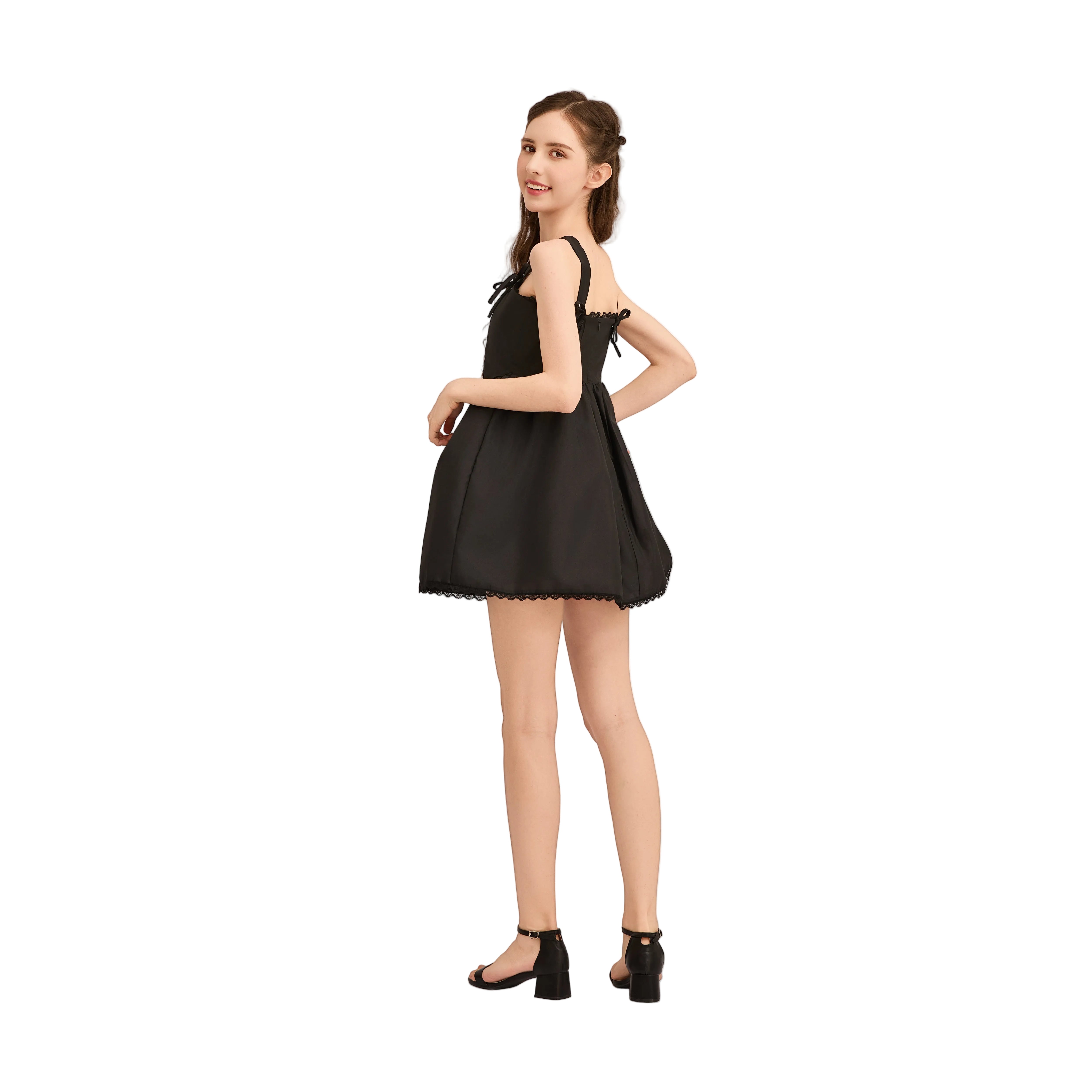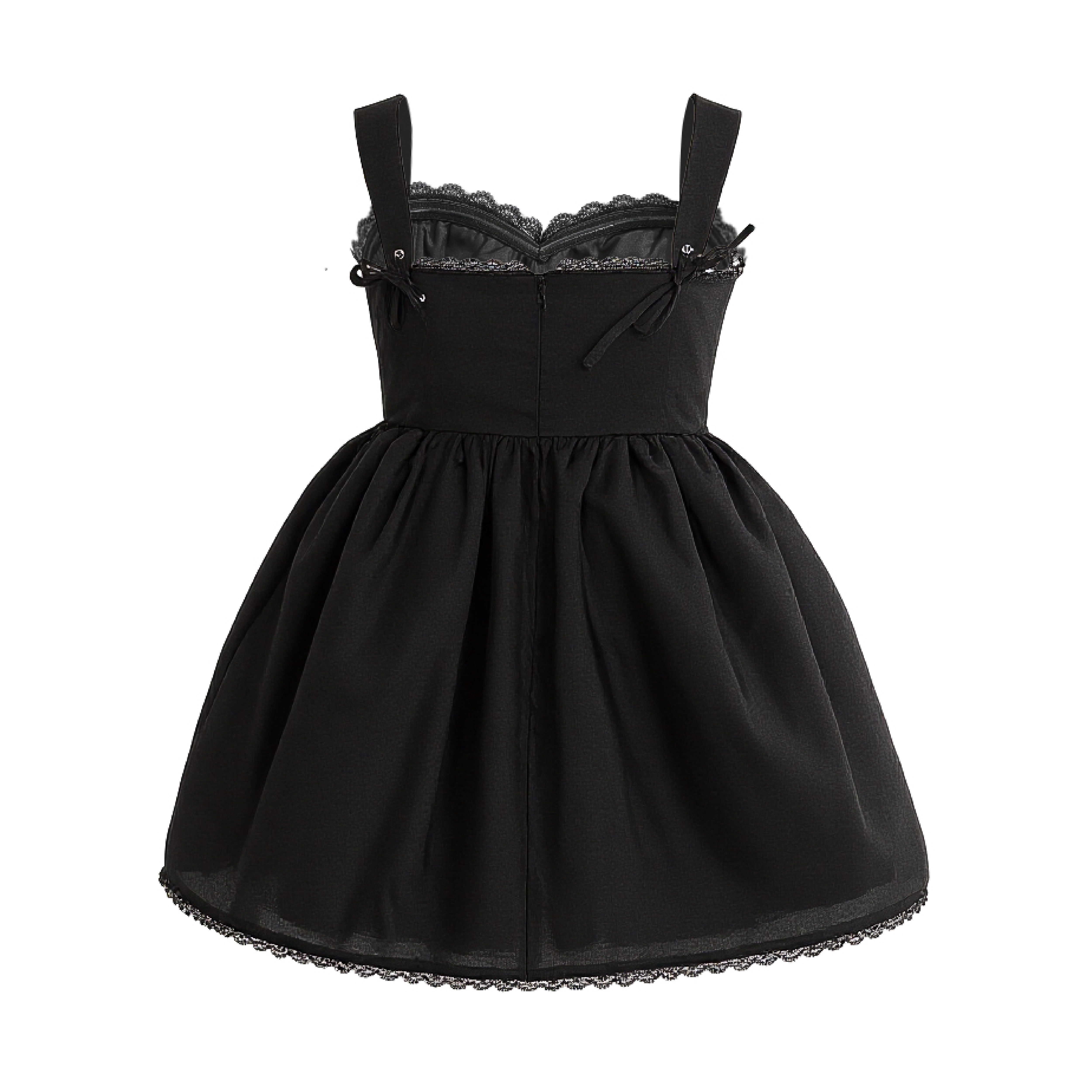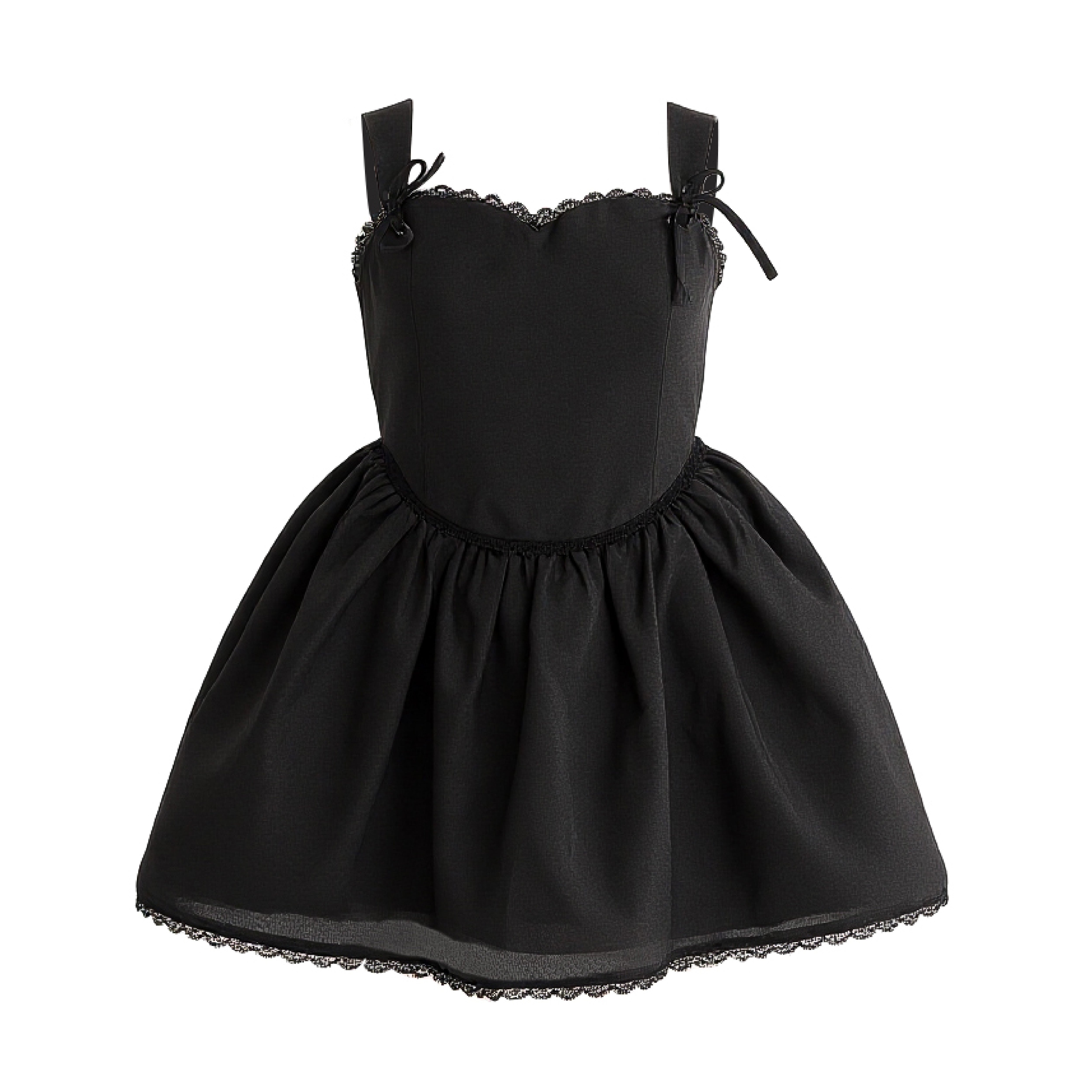 This elegant sleeveless dress features a fitted bodice and a gathered waistline that flows into a flared skirt. Delicate scalloped lace trims along the neckline and hem add a vintage-inspired charm, while bow accents on the straps bring a playful, feminine touch. Perfect for semi-formal occasions or classic evening wear.