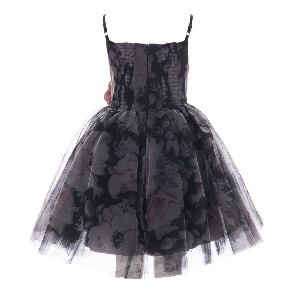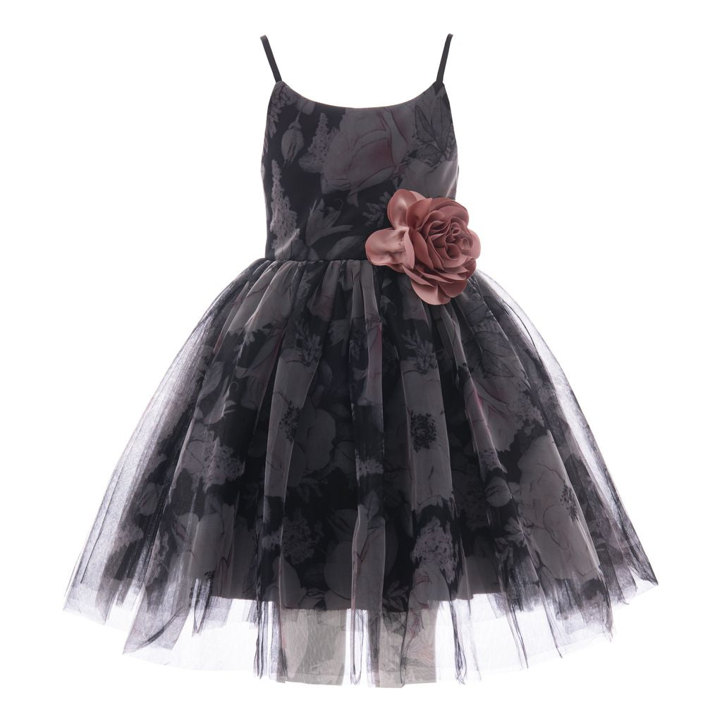 The Black Montebello Strap Rose Bud Dress for kid girls from Tulleen is a striking and elegant piece, perfect for special occasions. This dress features a unique black and grey smoky design that adds a touch of sophistication and intrigue. The spaghetti strap shoulders provide a delicate and stylish look, while the pink mauve rose at the hem adds a whimsical and charming detail.