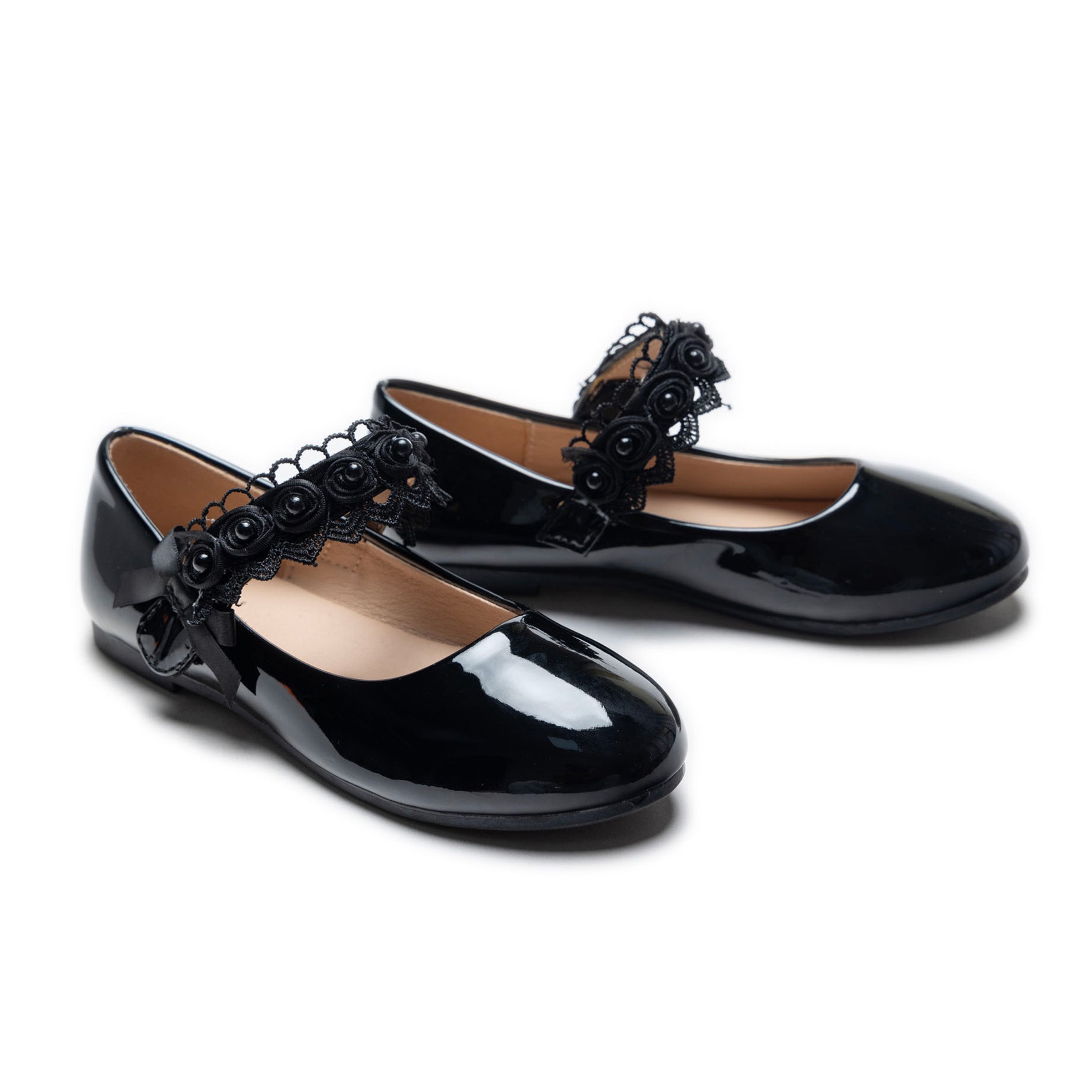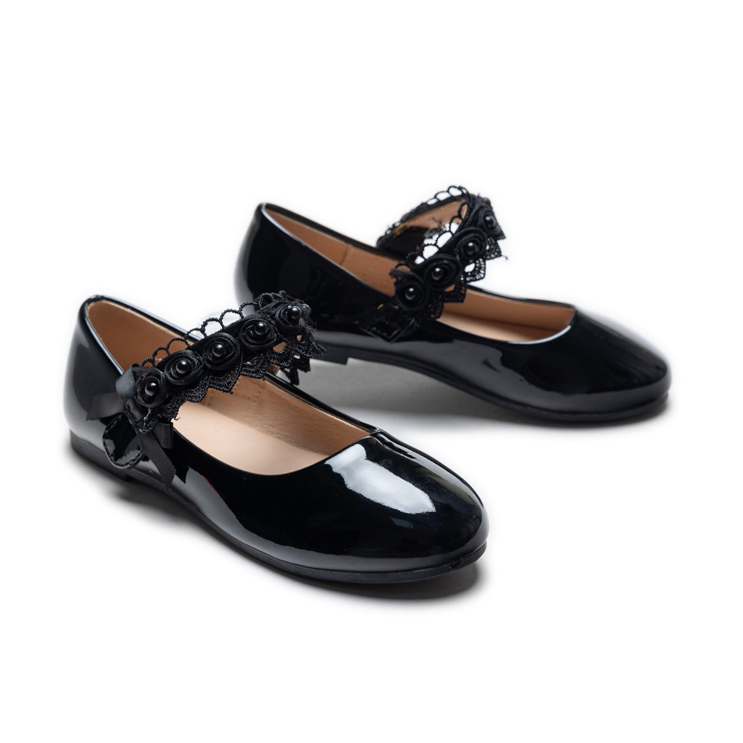 The Black Patent Rose Pearl Doily Flats by Tulleen are the ideal footwear for young girls who appreciate the balance of comfort and style. Whether it’s a birthday party, a family event, or a day out with friends, these flats bring a sophisticated yet playful touch to their wardrobe, making them a must-have piece for every little girl.