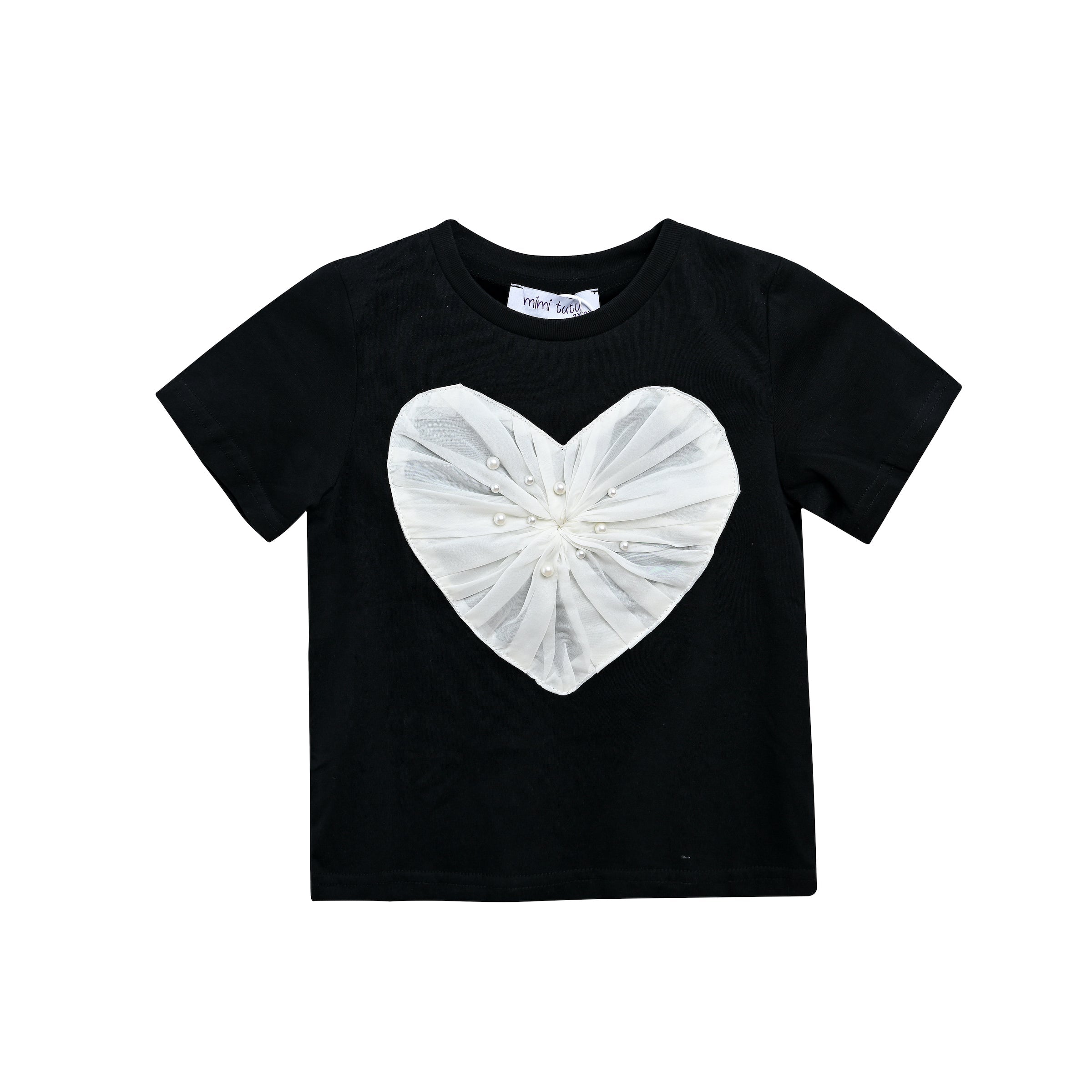 The Black Pearl Heart Applique T-shirt for kid girls from Mimi Tutu is a charming and stylish addition to any young girl's wardrobe. This t-shirt features a round neck and short sleeves, providing a classic and comfortable fit. Firstly, the standout feature of this tee is the white heart applique adorned with delicate pearl decorations.