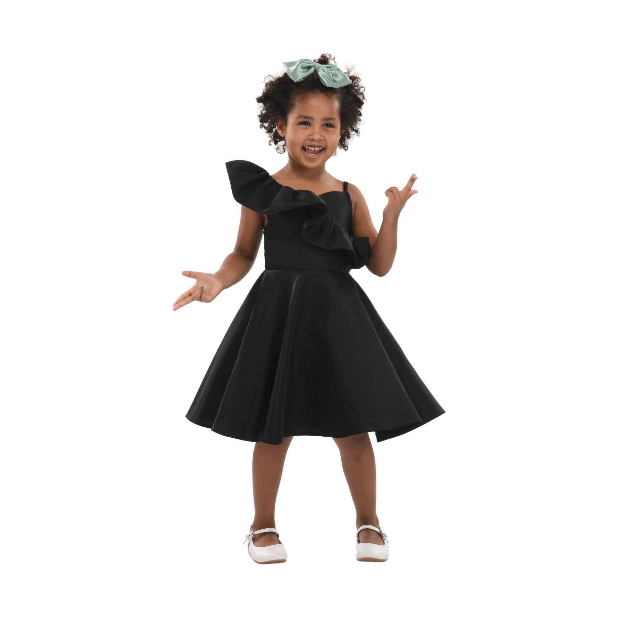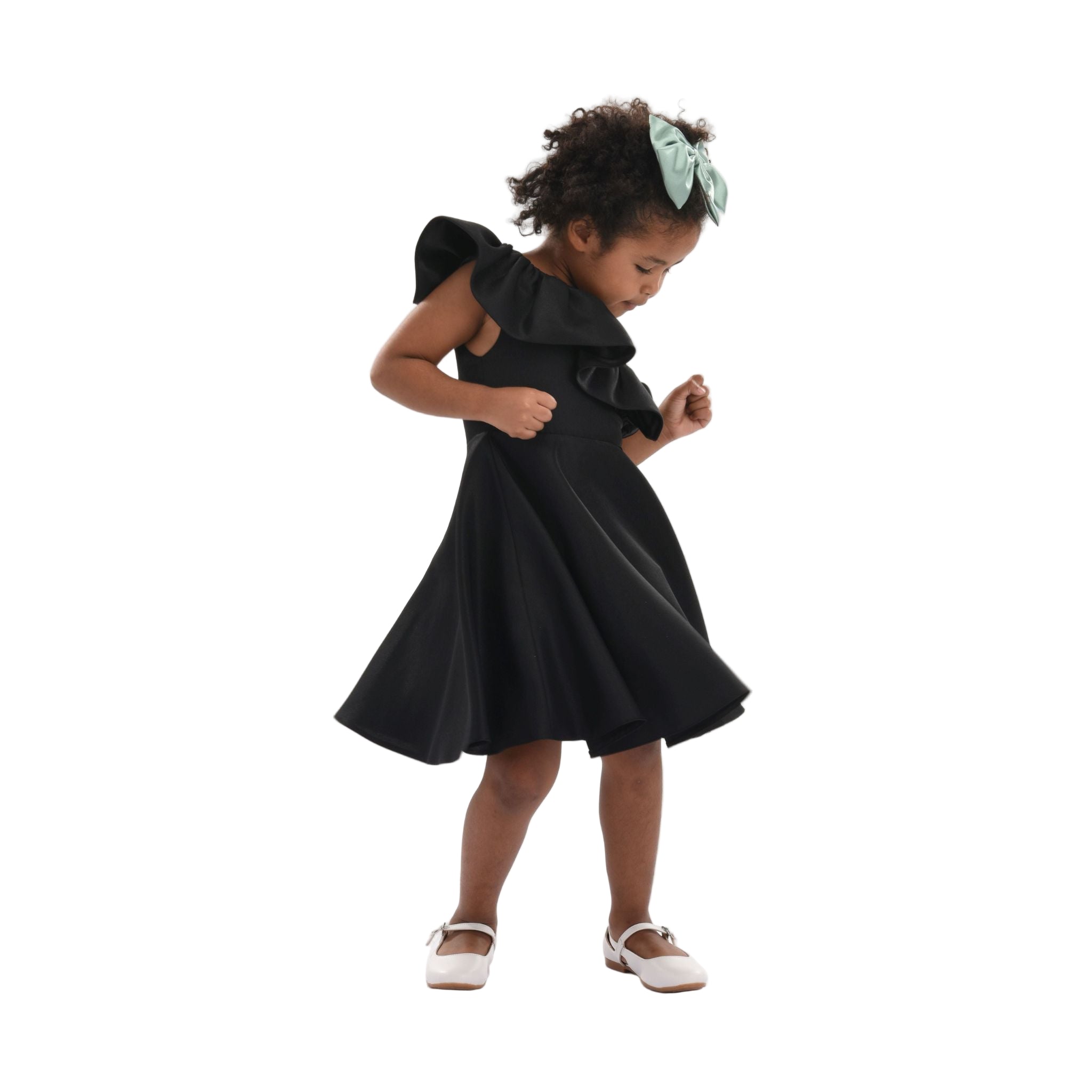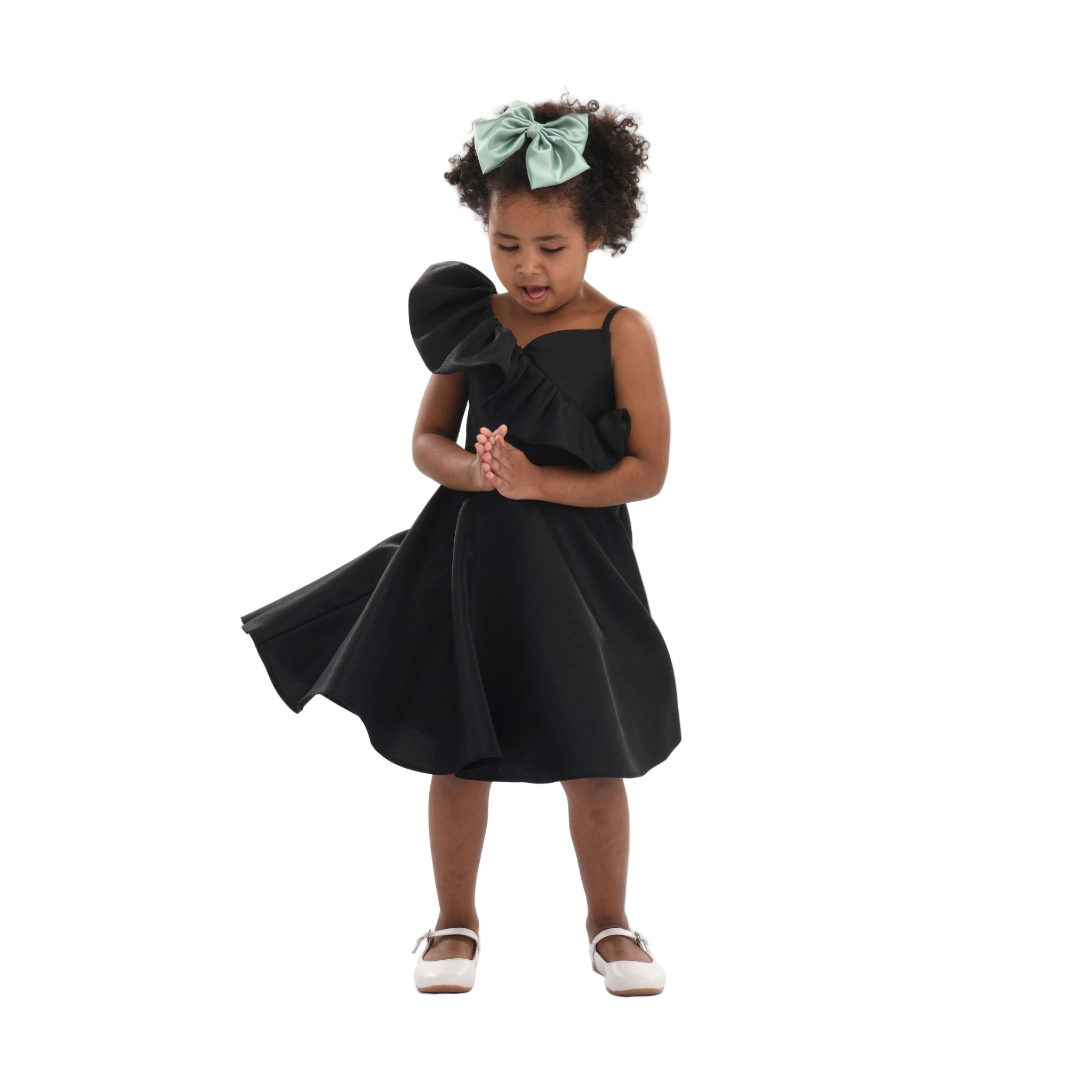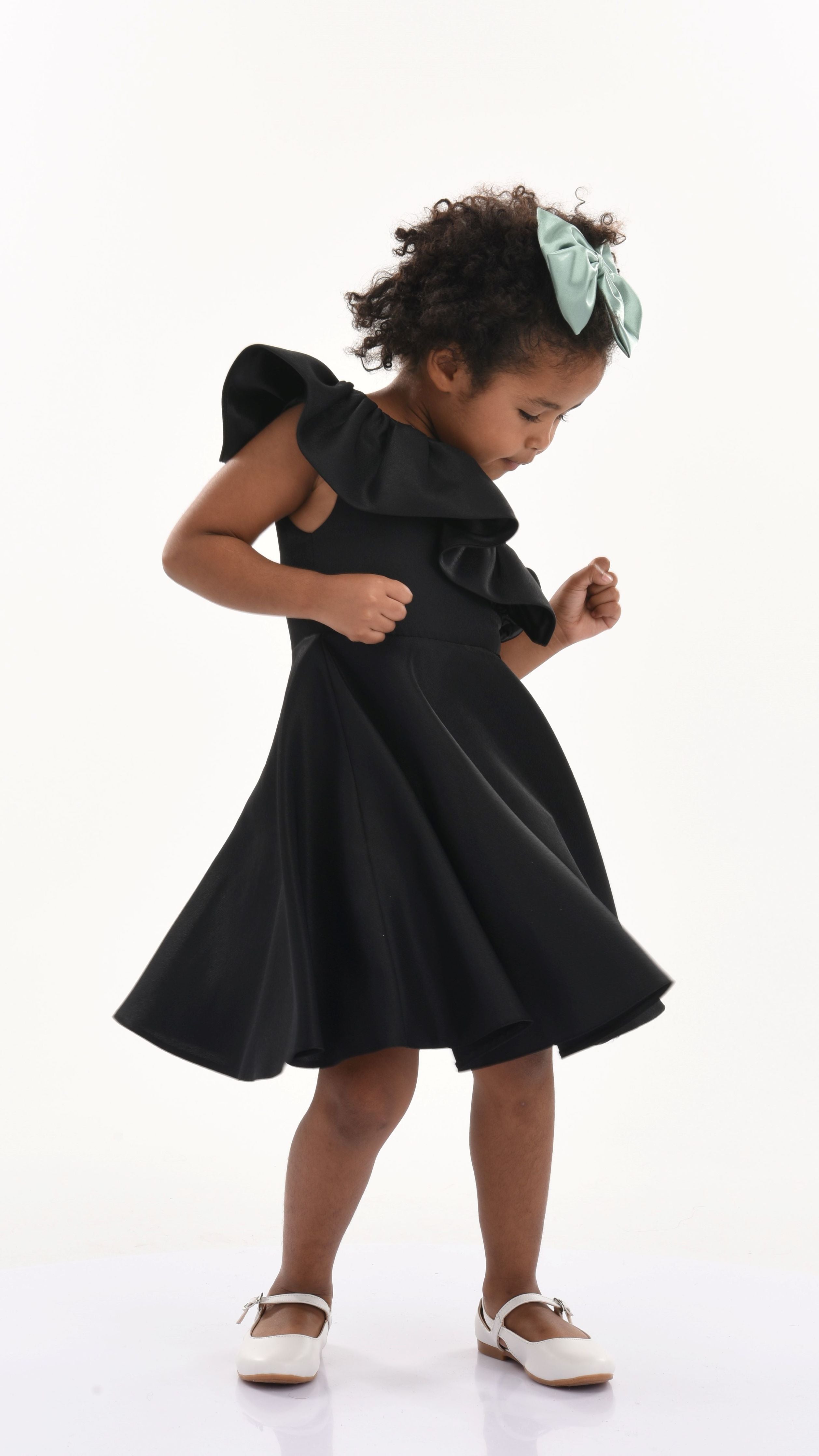 The Black Riviera Off Shoulder Ruffle Dress for kid girls from Tulleen effortlessly combines elegance and playfulness. This dress features an off-shoulder ruffle design, perfect for special occasions that call for glamour. The delicate ruffles cascade gracefully along the neckline, adding a playful flair.