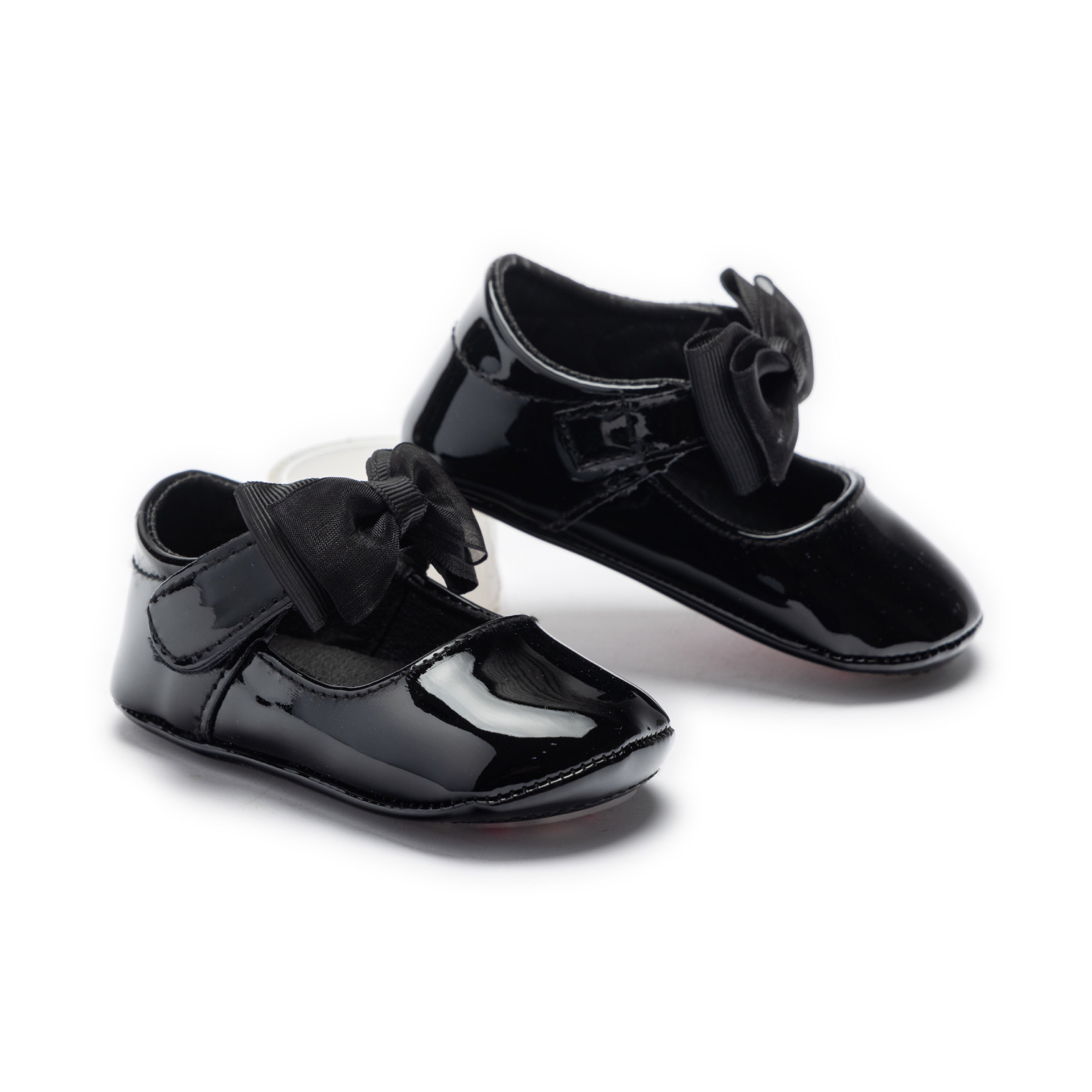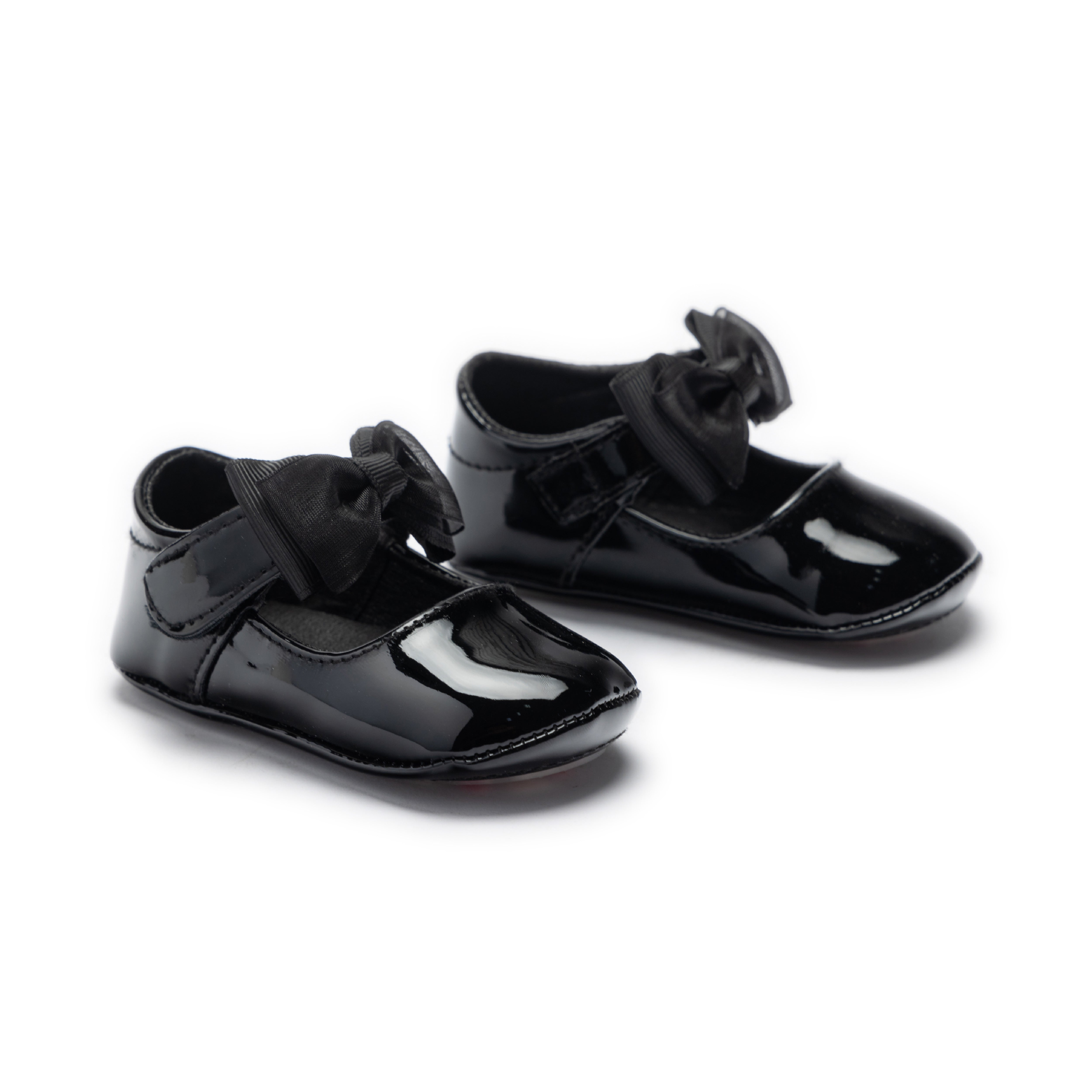 The Seraphina shoes bring timeless elegance with their glossy patent finish, front bow detail, and easy hook-and-loop strap. Designed for infants, they combine charm and comfort, making them perfect for dressy occasions.