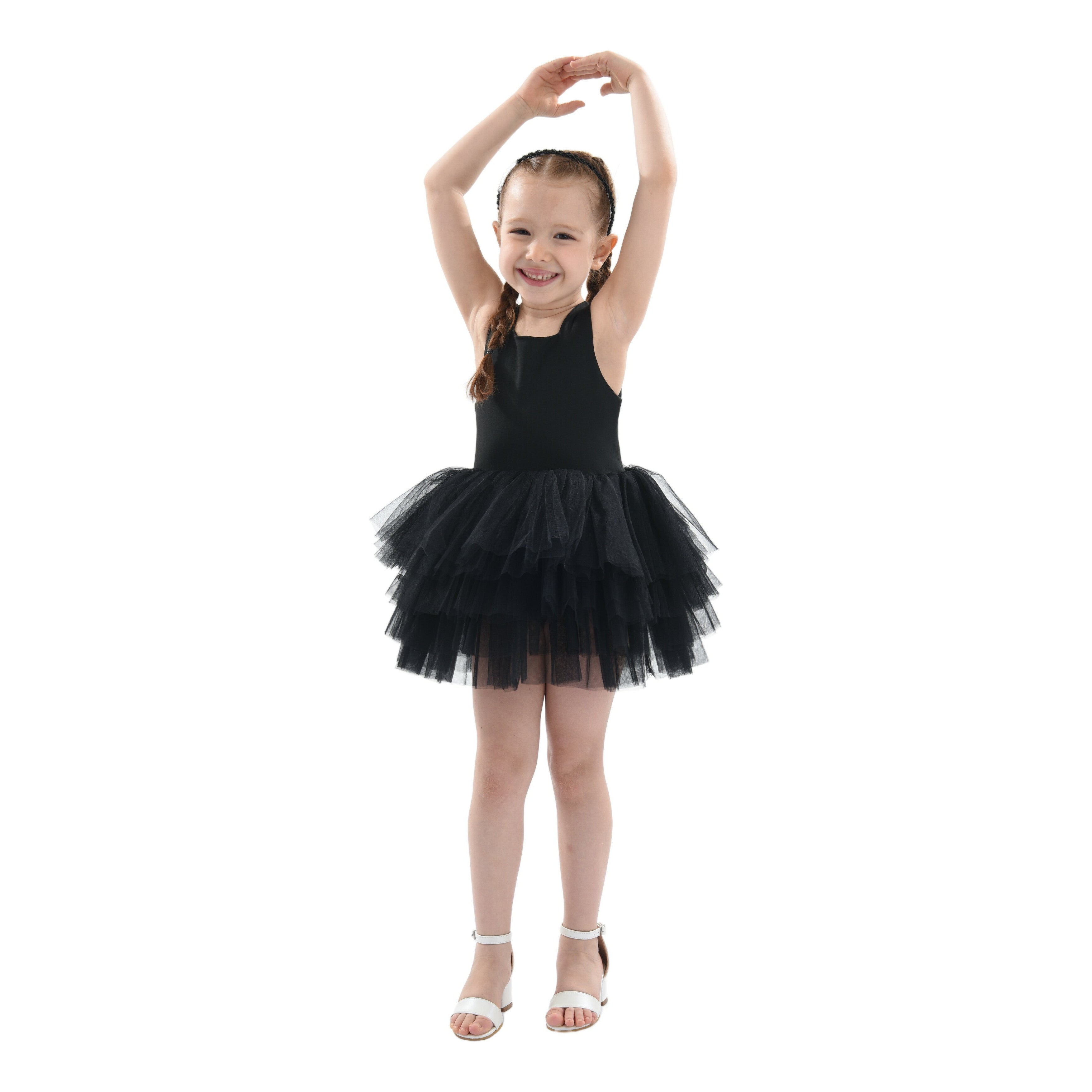 The Black Solid Tutu Leotard Dress for baby girls from Mimi Tutu is an elegant and charming outfit. Designed with thin sleeves, this dress ensures a delicate and graceful look for your little one. Firstly, the square neck adds a touch of classic style and sophistication. Additionally, the multiple layers of lightweight lush tulle create a voluminous and whimsical appearance, perfect for twirling and dancing.