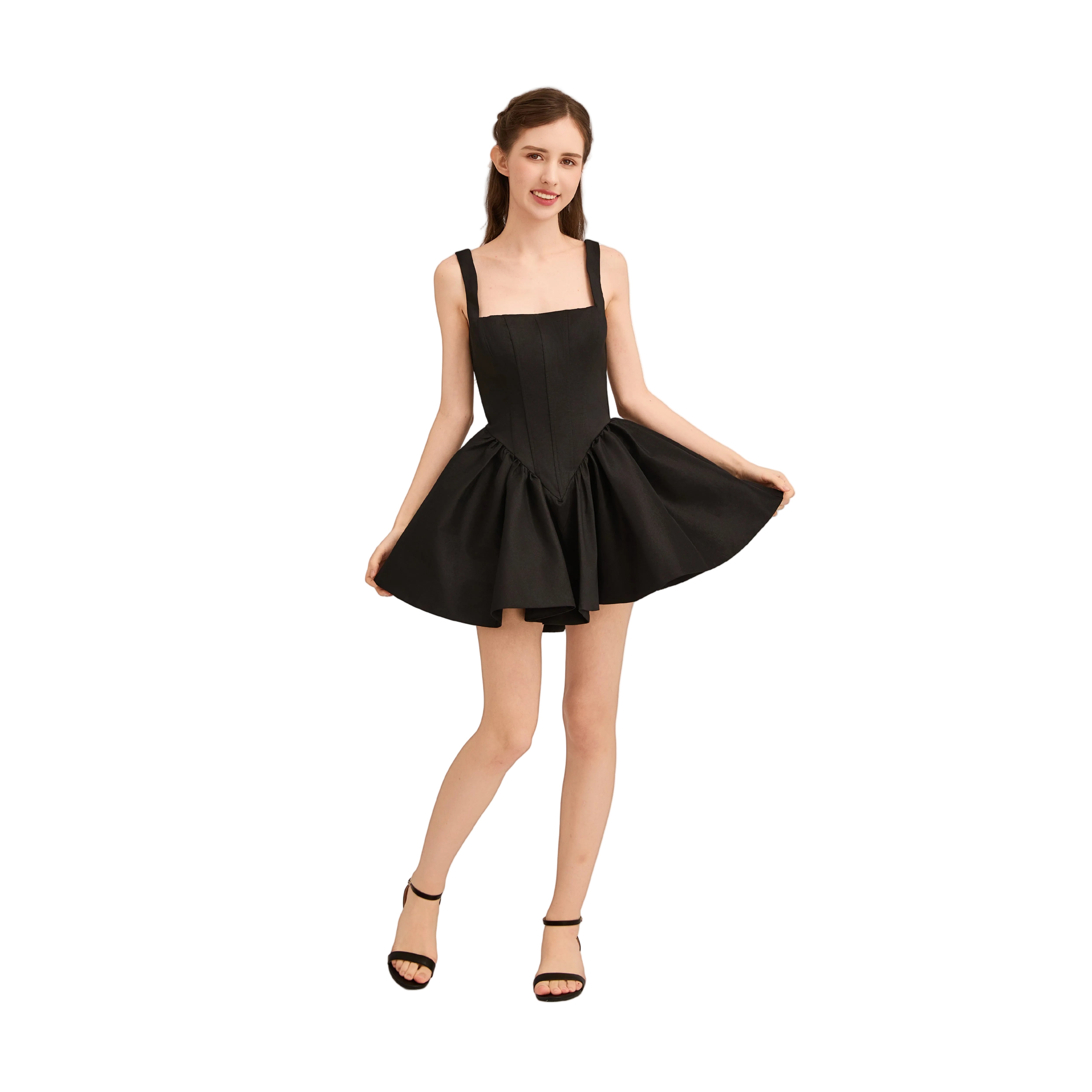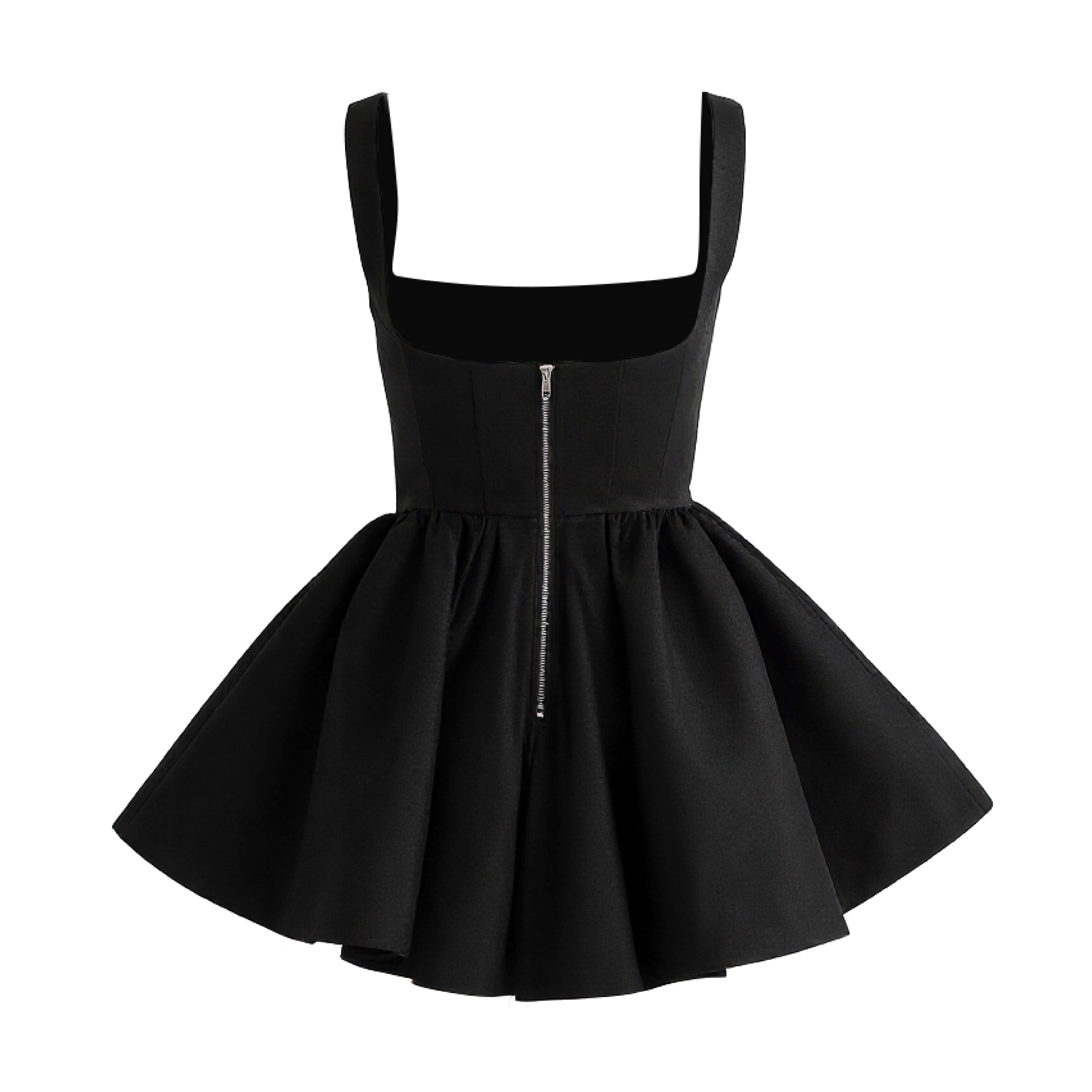 This striking sleeveless dress features a structured bodice with vertical seam detailing and a bold square neckline framed by wide straps. The waistline transitions into a voluminous flared skirt with a pointed seam, creating a dramatic silhouette that blends elegance with fashion-forward flair.