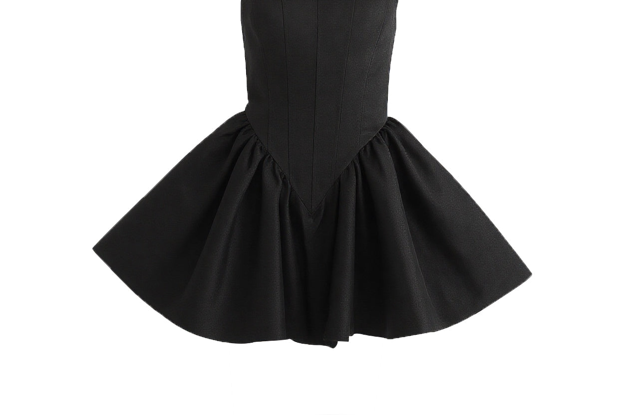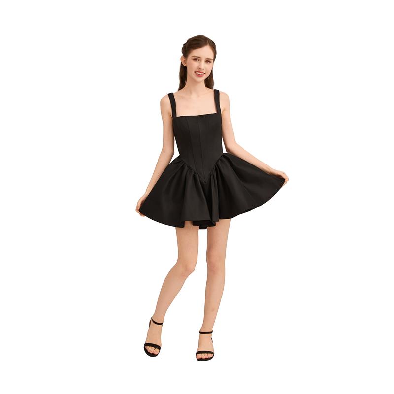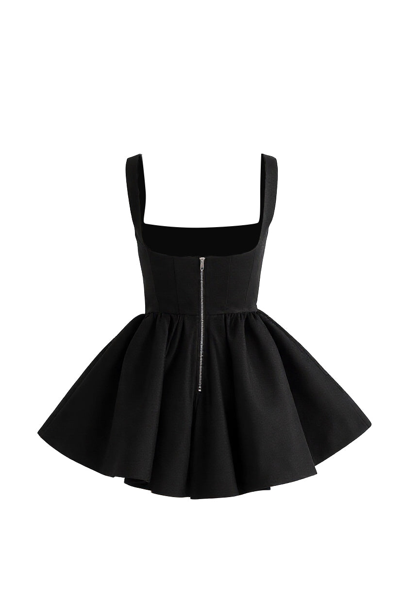 This striking sleeveless dress features a structured bodice with vertical seam detailing and a bold square neckline framed by wide straps. The waistline transitions into a voluminous flared skirt with a pointed seam, creating a dramatic silhouette that blends elegance with fashion-forward flair.