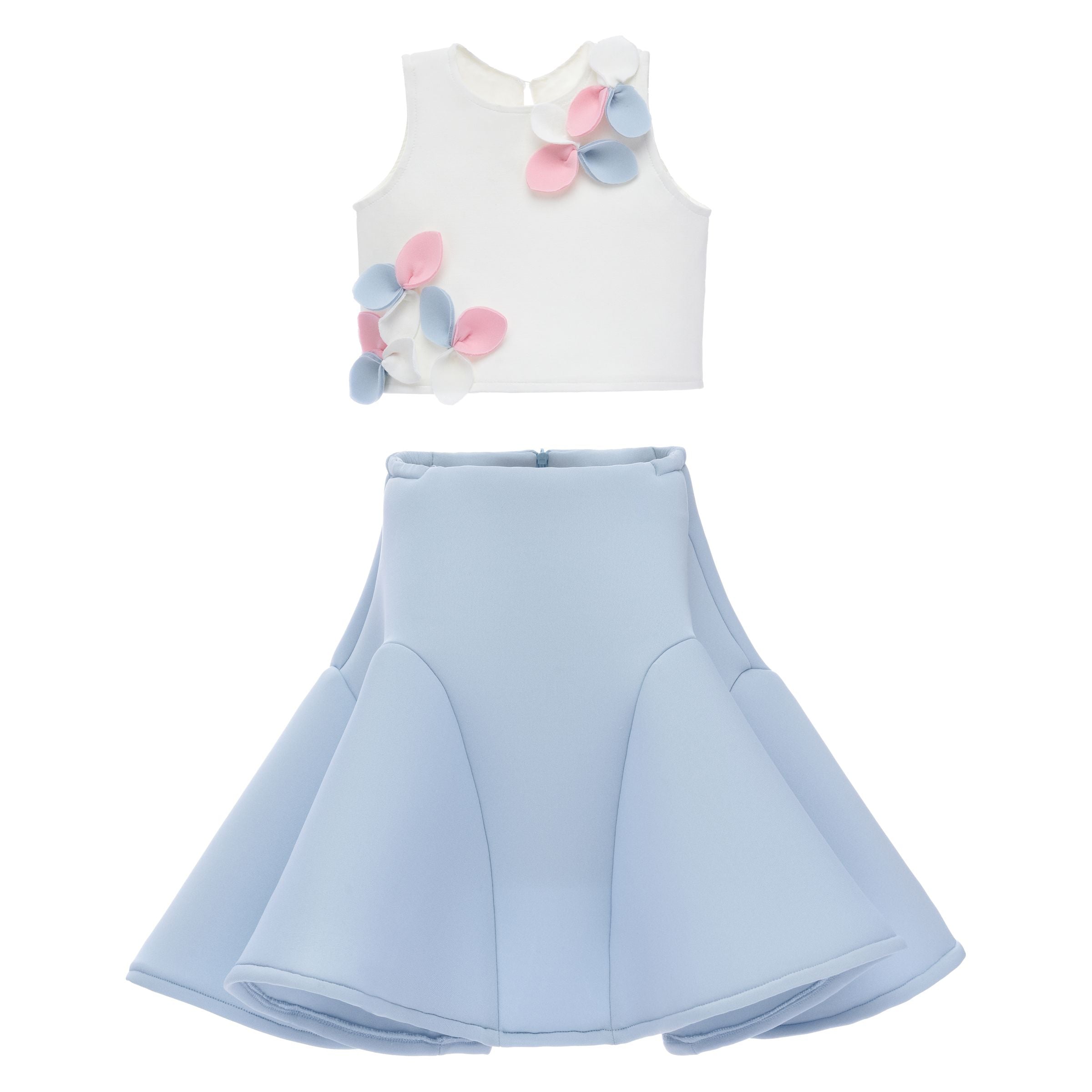 Fresh, modern, and full of charm, the Blue Blossom Set brings playful elegance to life. The crisp white crop top is adorned with pastel floral appliqués that bloom across the shoulder, while the structured sky-blue skirt adds volume and movement. Perfect for spring celebrations, birthdays, or stylish outings, this two-piece ensemble is a breath of fresh air in every detail.