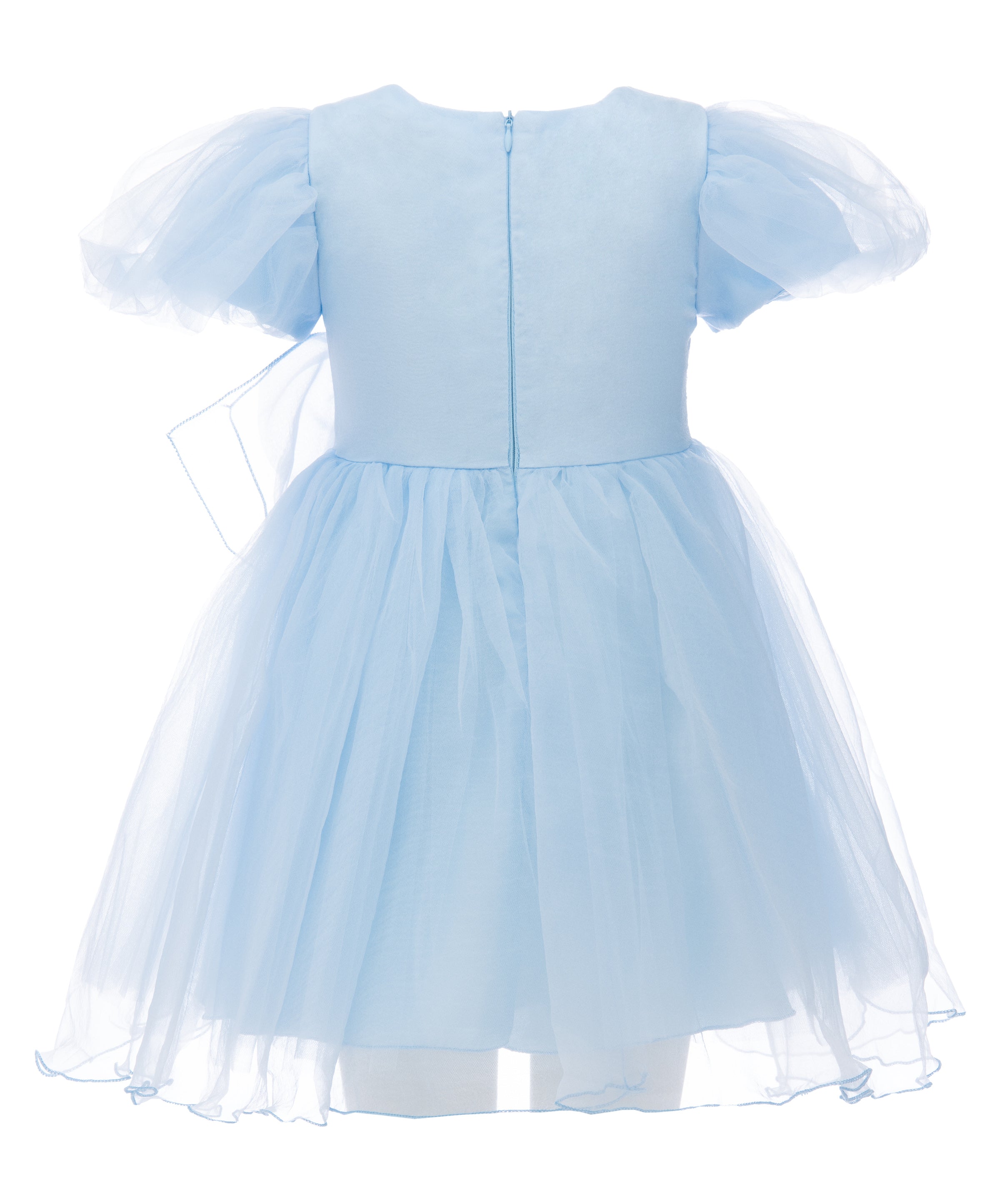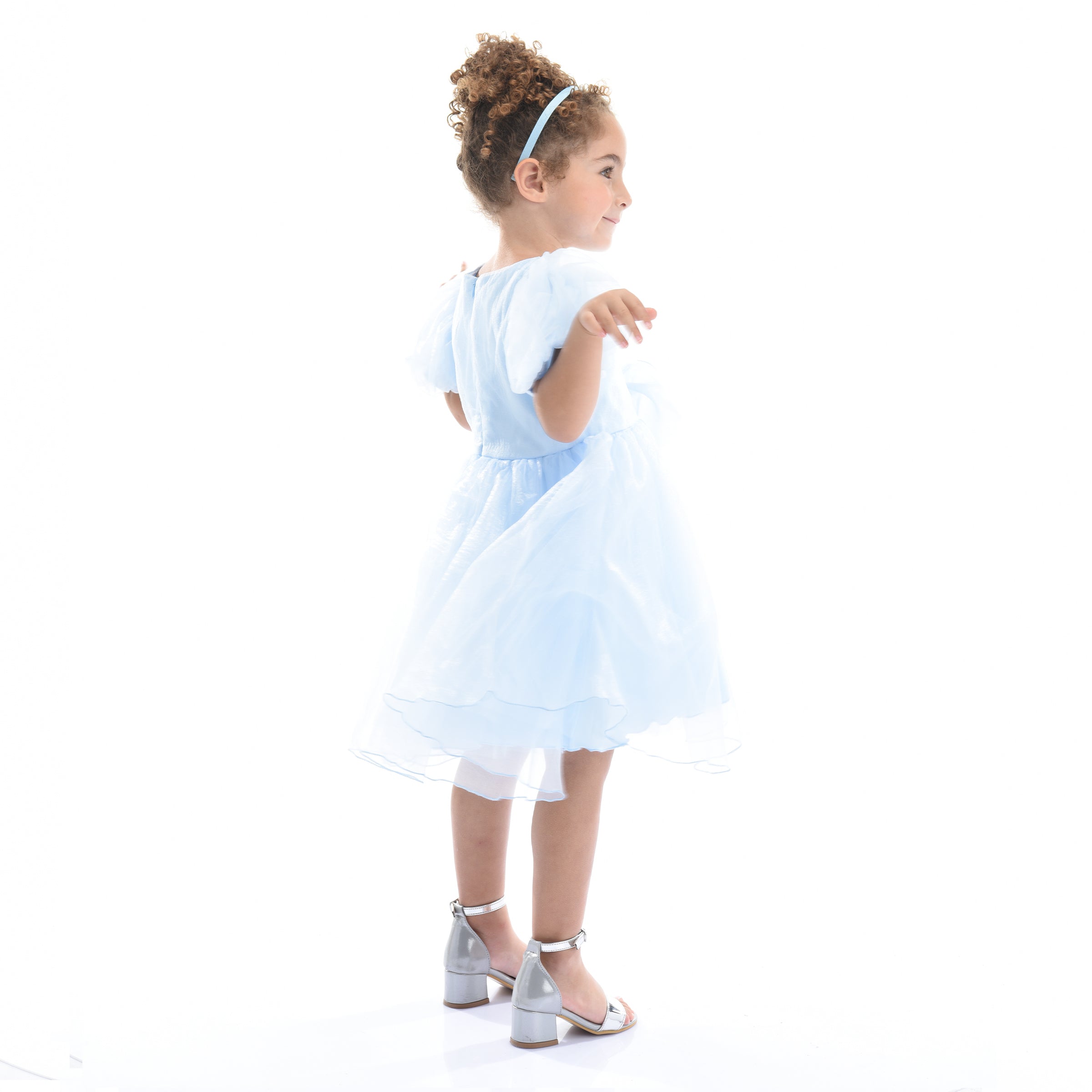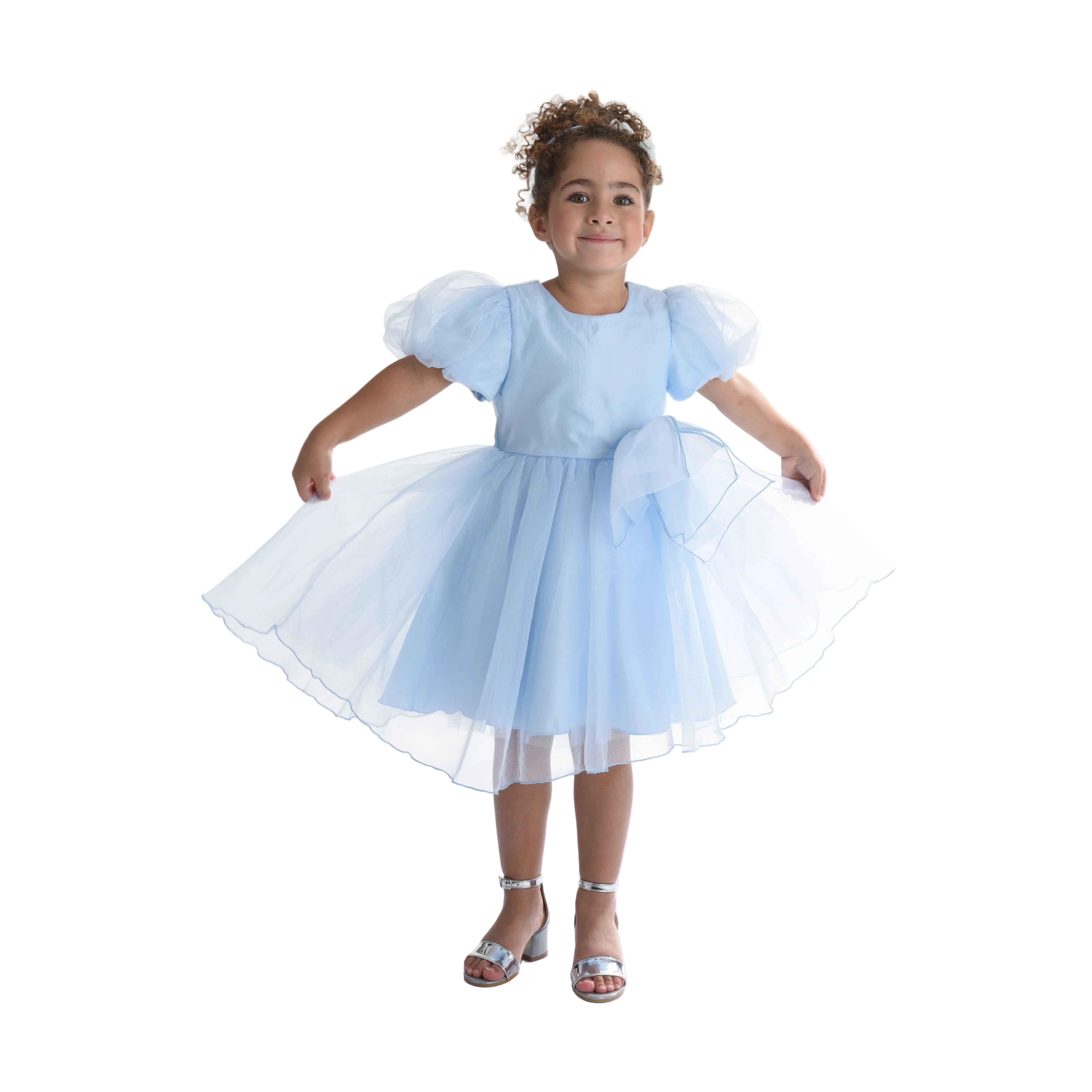 A detachable blue bow at the hem provides a playful and enchanting element. Made from 100% polyester with a 100% cotton lining, this dress offers both durability and comfort. Additionally, it requires dry cleaning to maintain its pristine appearance. Overall, the Blue Bow Organza Puff Shoulder Dress combines elegance, charm, and playful design elements, ensuring your child looks and feels special at any event.