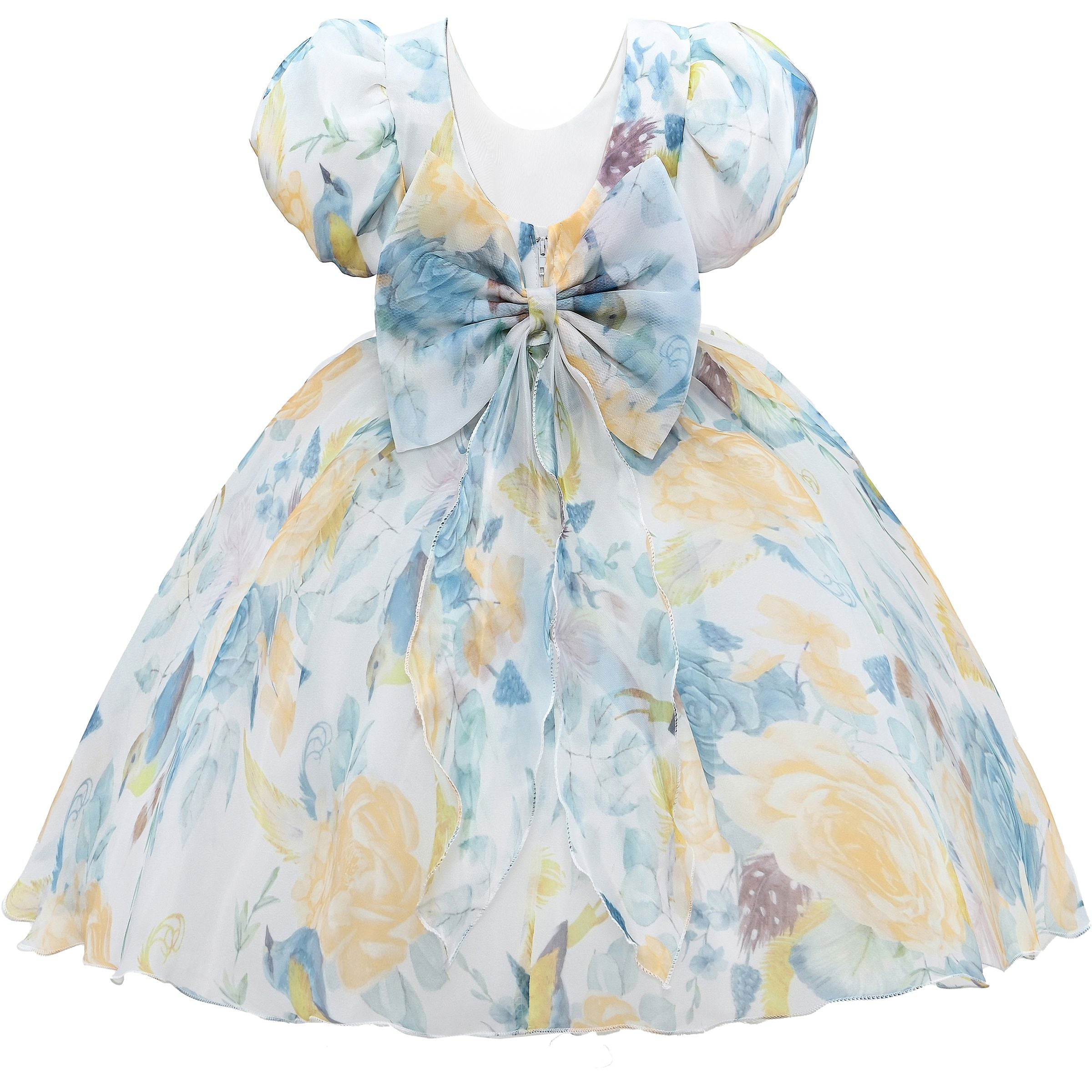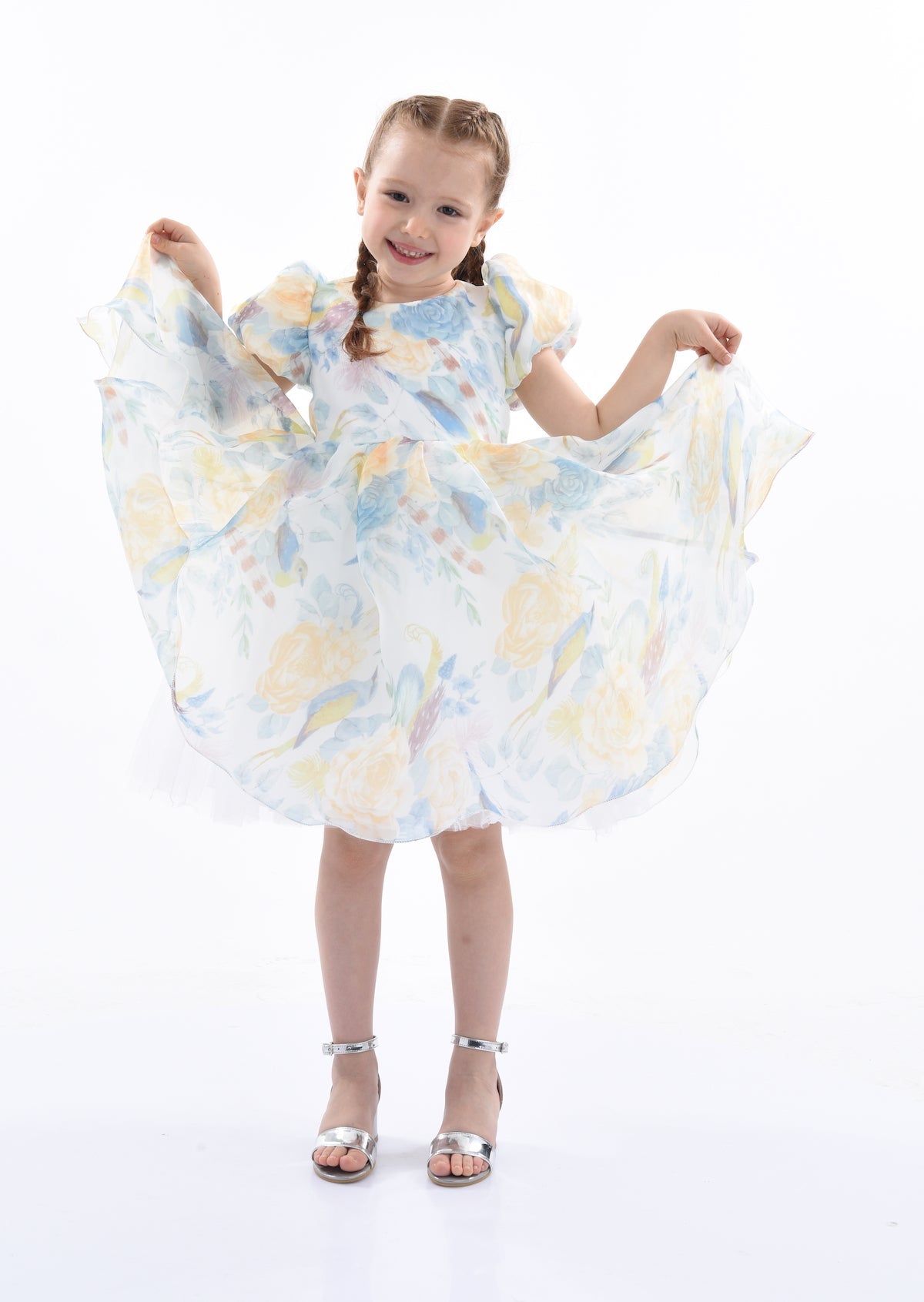 The dress features a burst of vibrant hues in playful floral patterns, creating a tapestry of beauty and joy that will surely light up any room. The colors complement each other, bringing out the natural radiance and charm of your child.