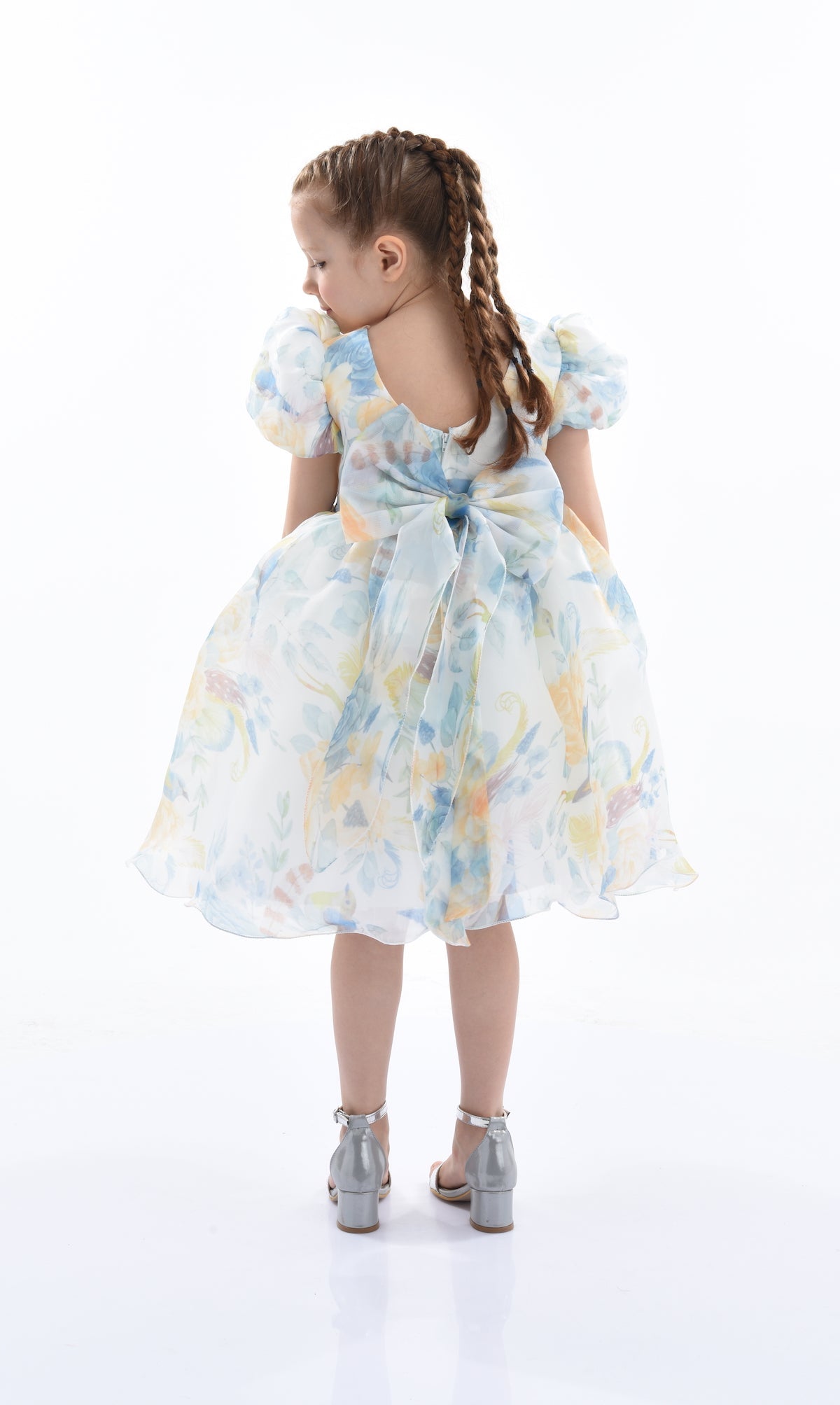 Furthermore, the dress boasts a small open back design, exquisitely adorned with a dainty bow in a matching floral print, adding an extra touch of sophistication and style. Made from high-quality organza, this dress ensures both durability and comfort. Only to be dry cleaned, it maintains its pristine and luxurious appearance over time.