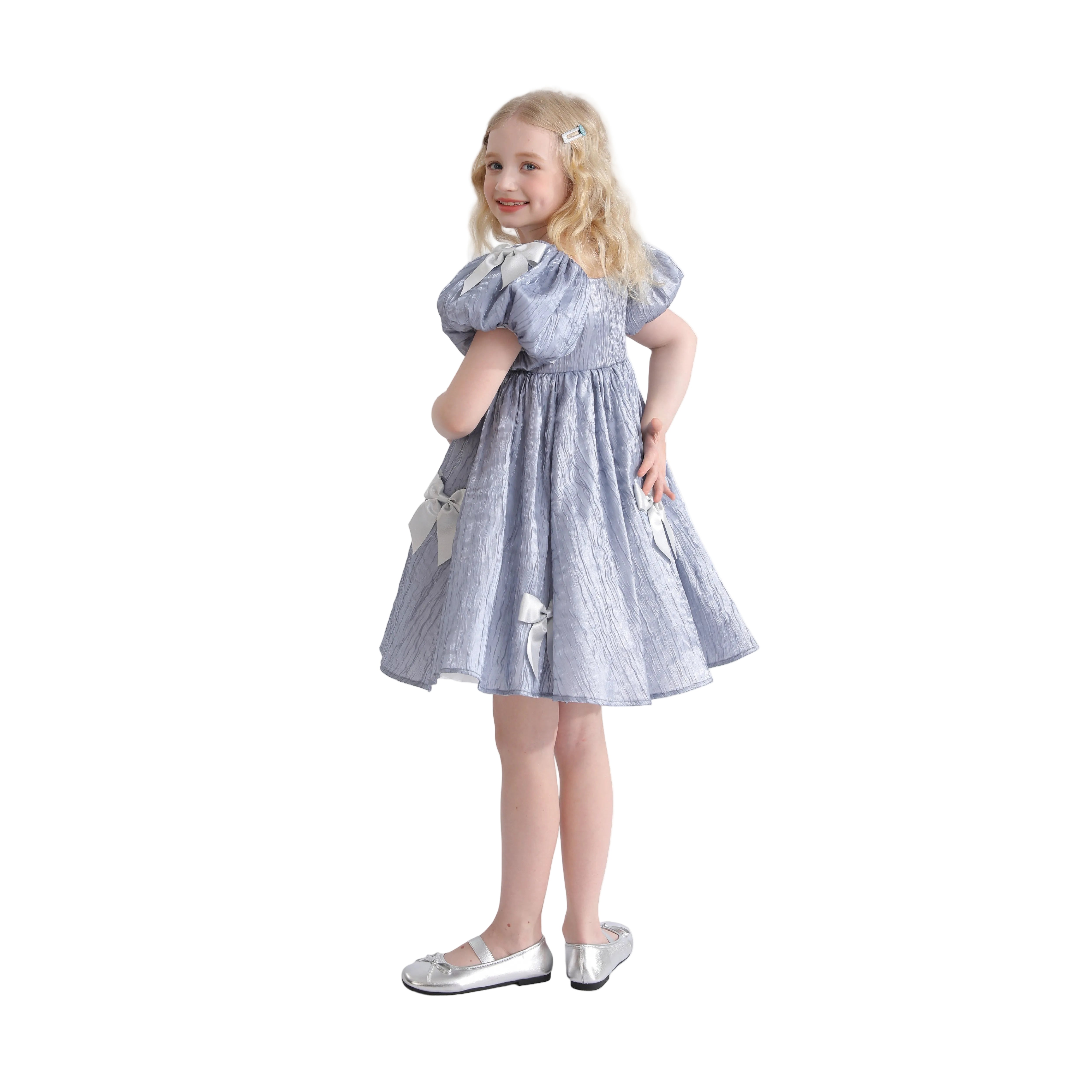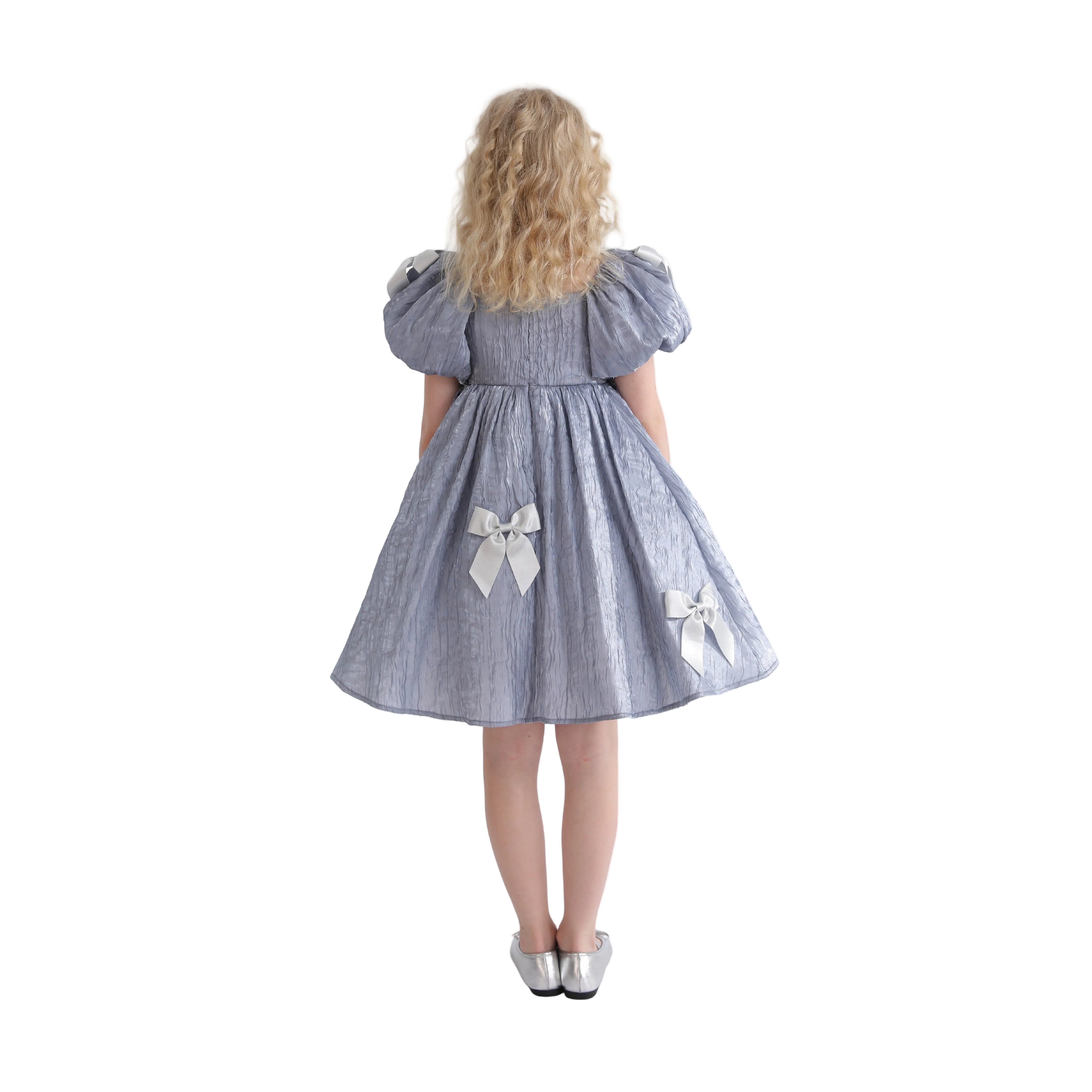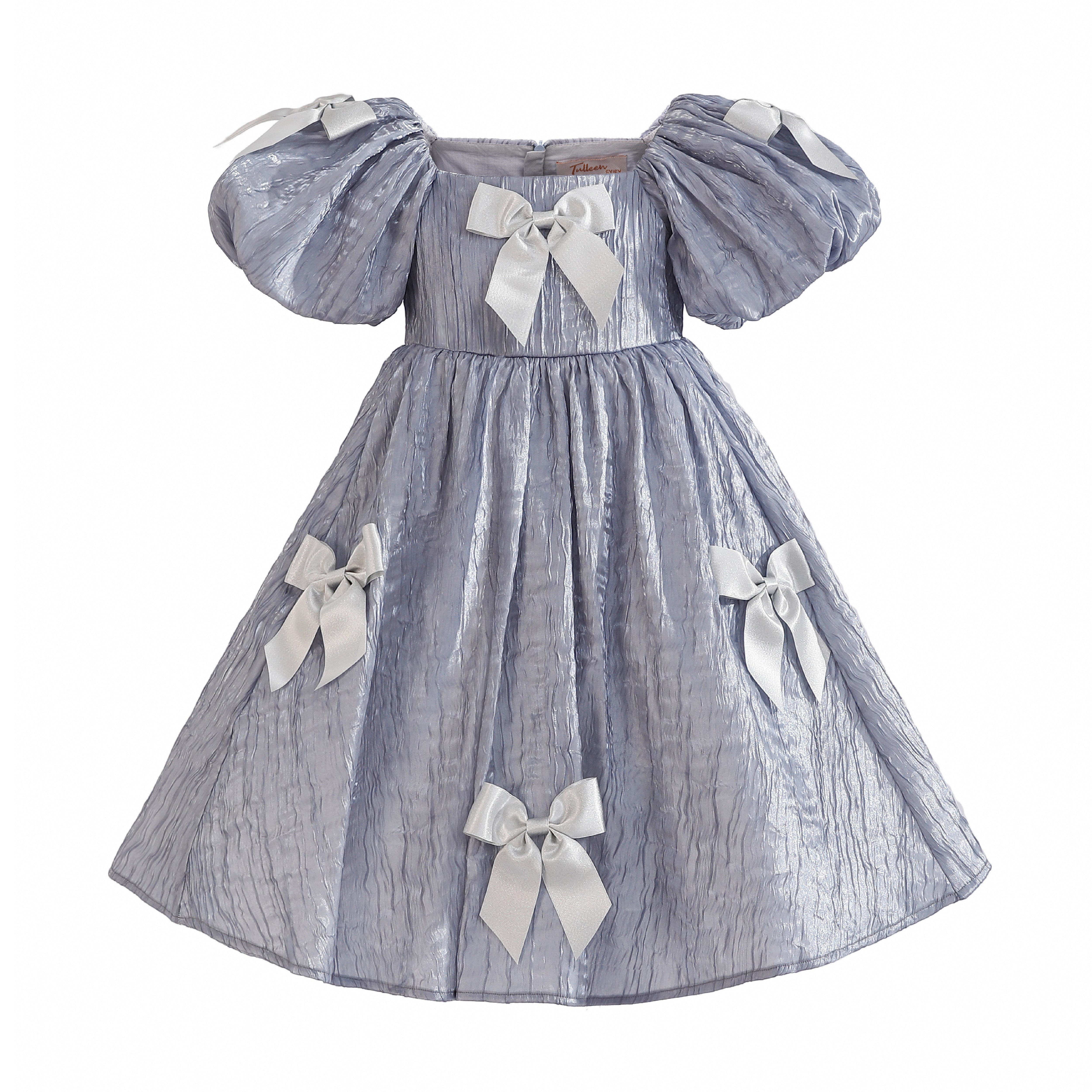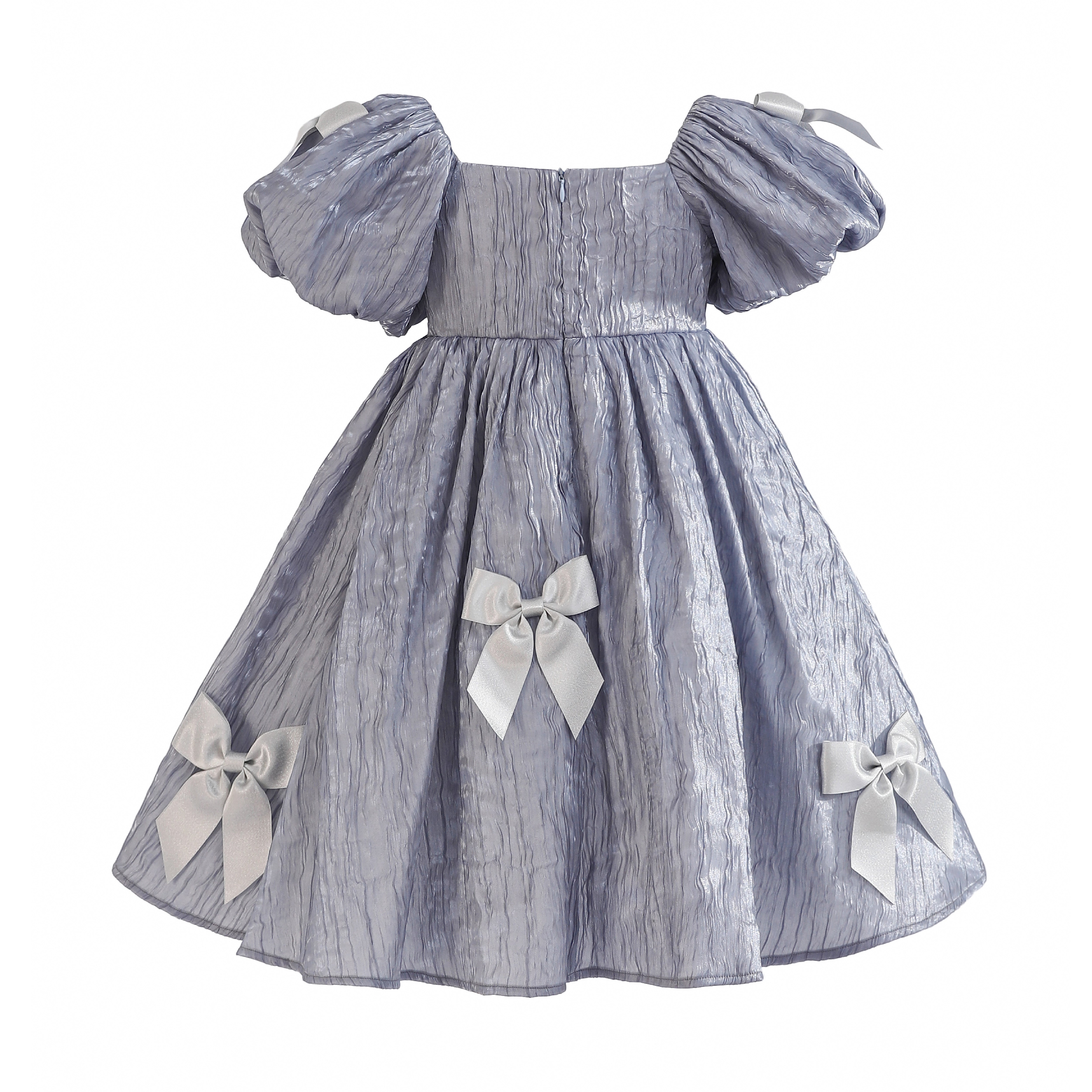 A charming formal dress in a shiny blue tone, featuring puffed sleeves and a flared skirt. Decorated with five satin bows across the bodice, sleeves, and skirt, it brings a playful yet elegant touch to special occasions.