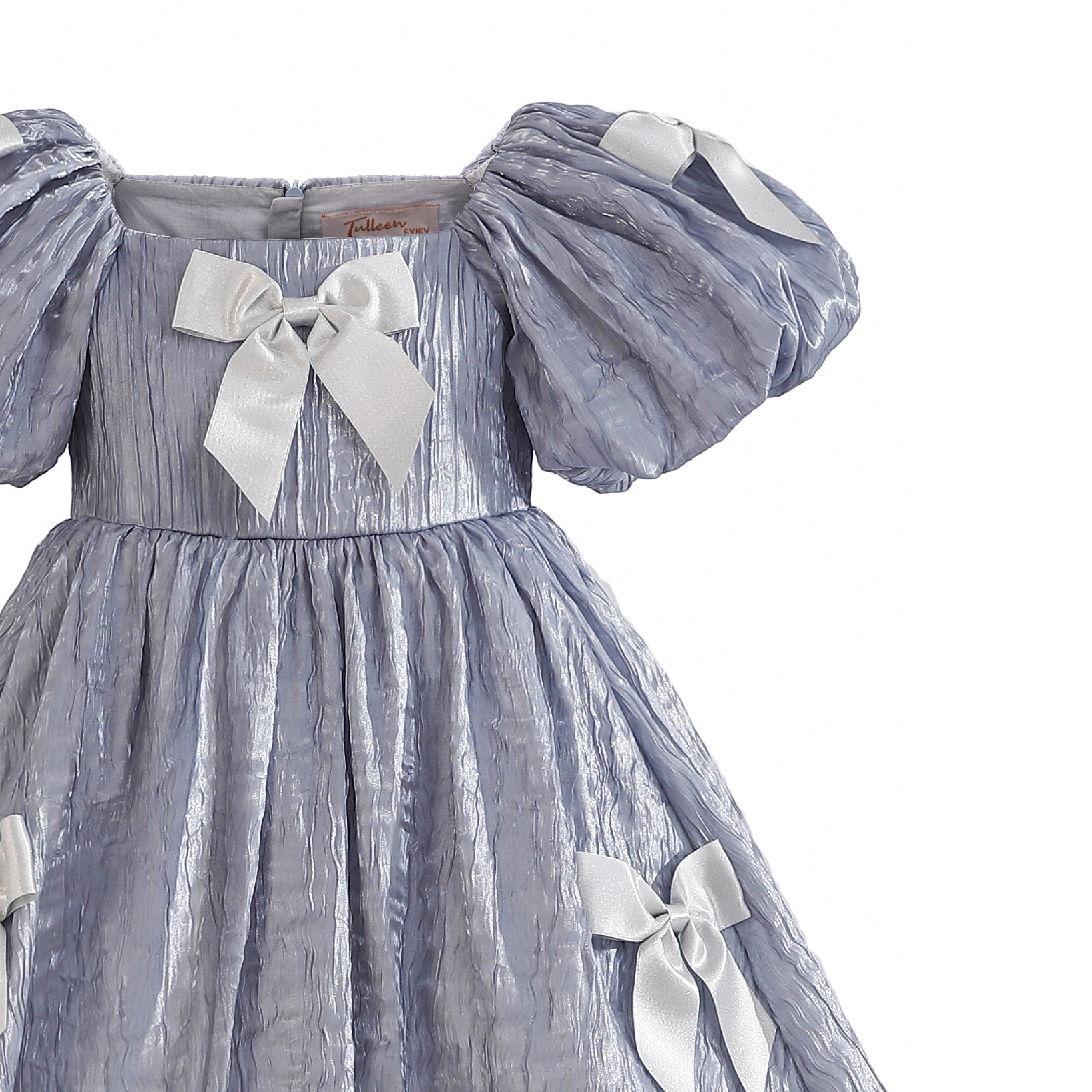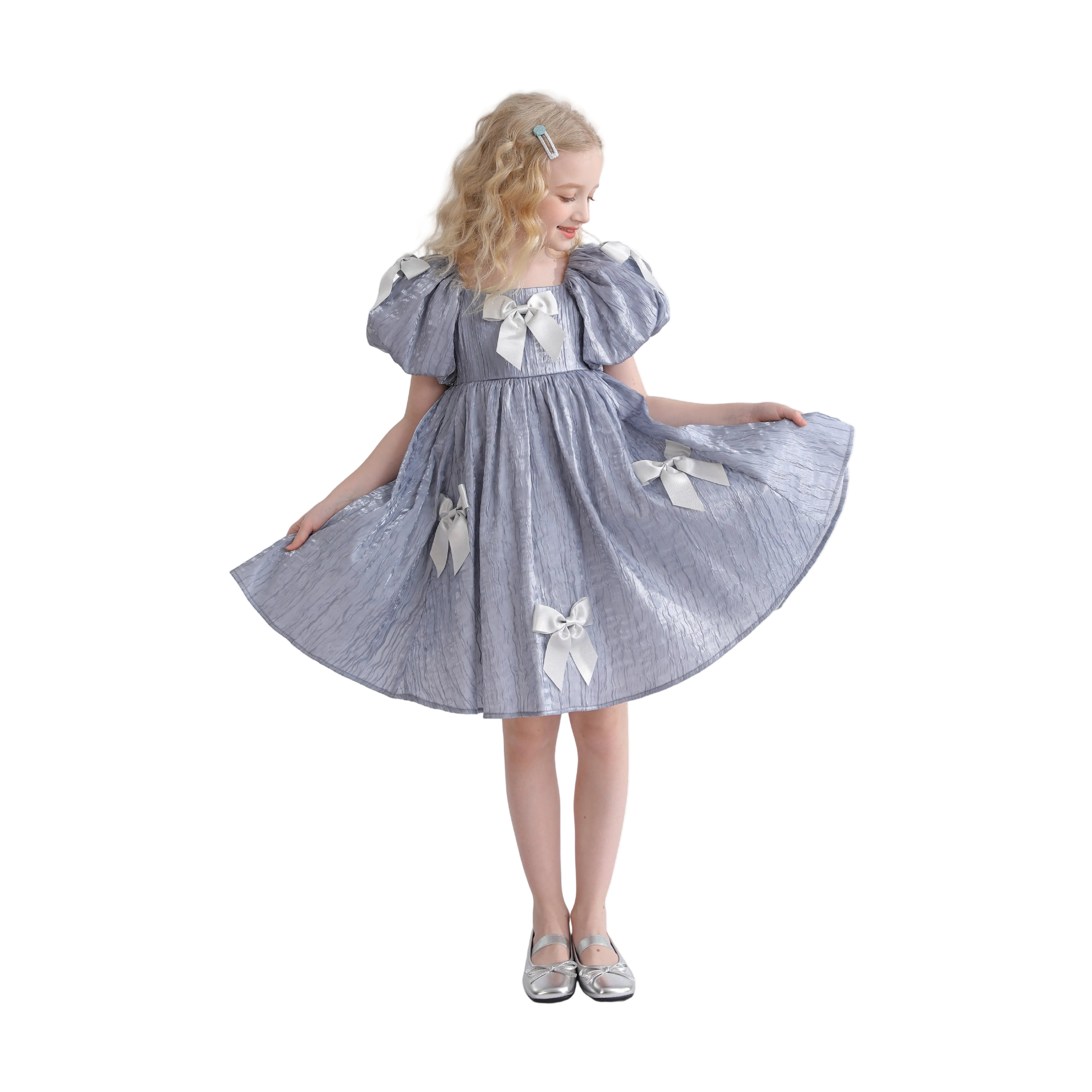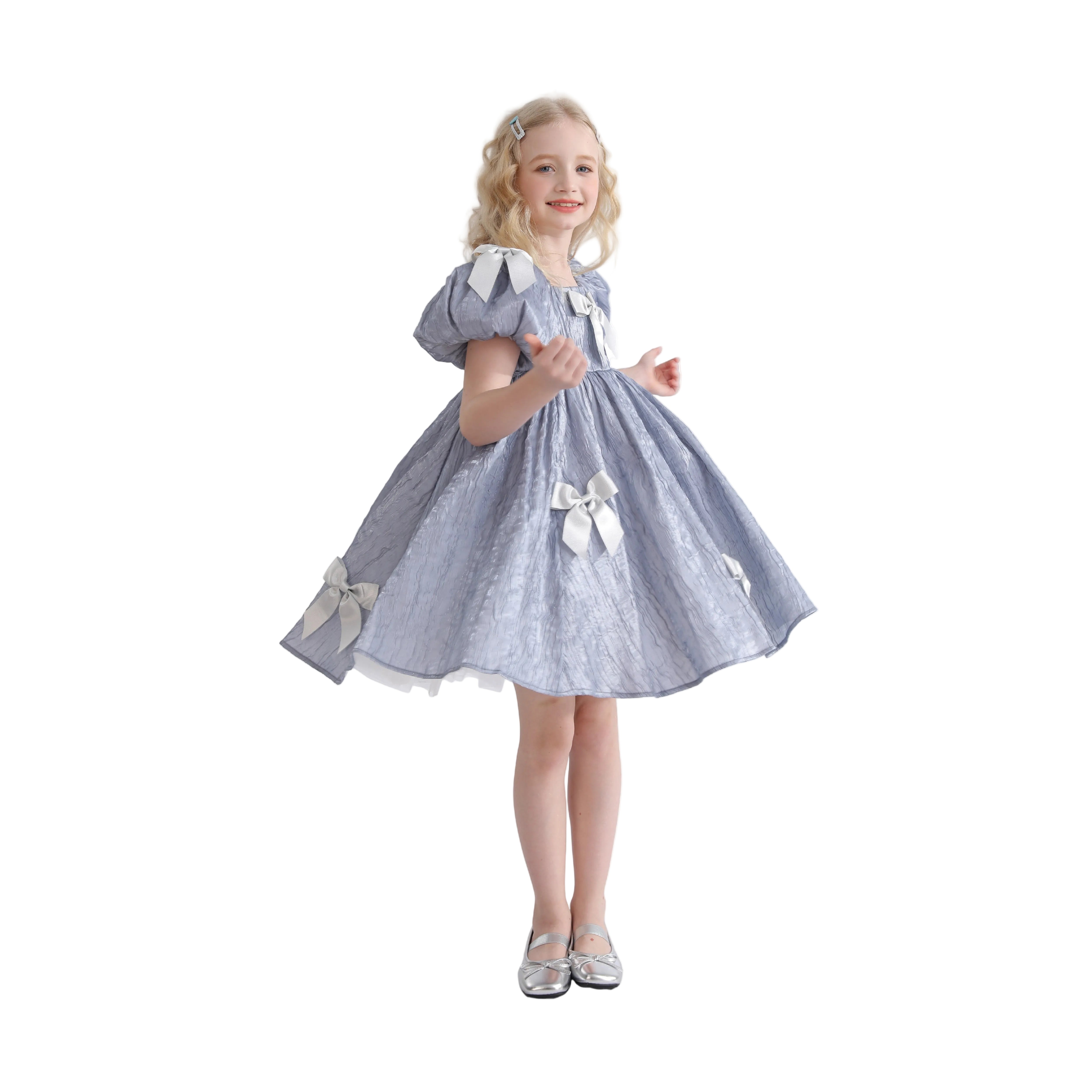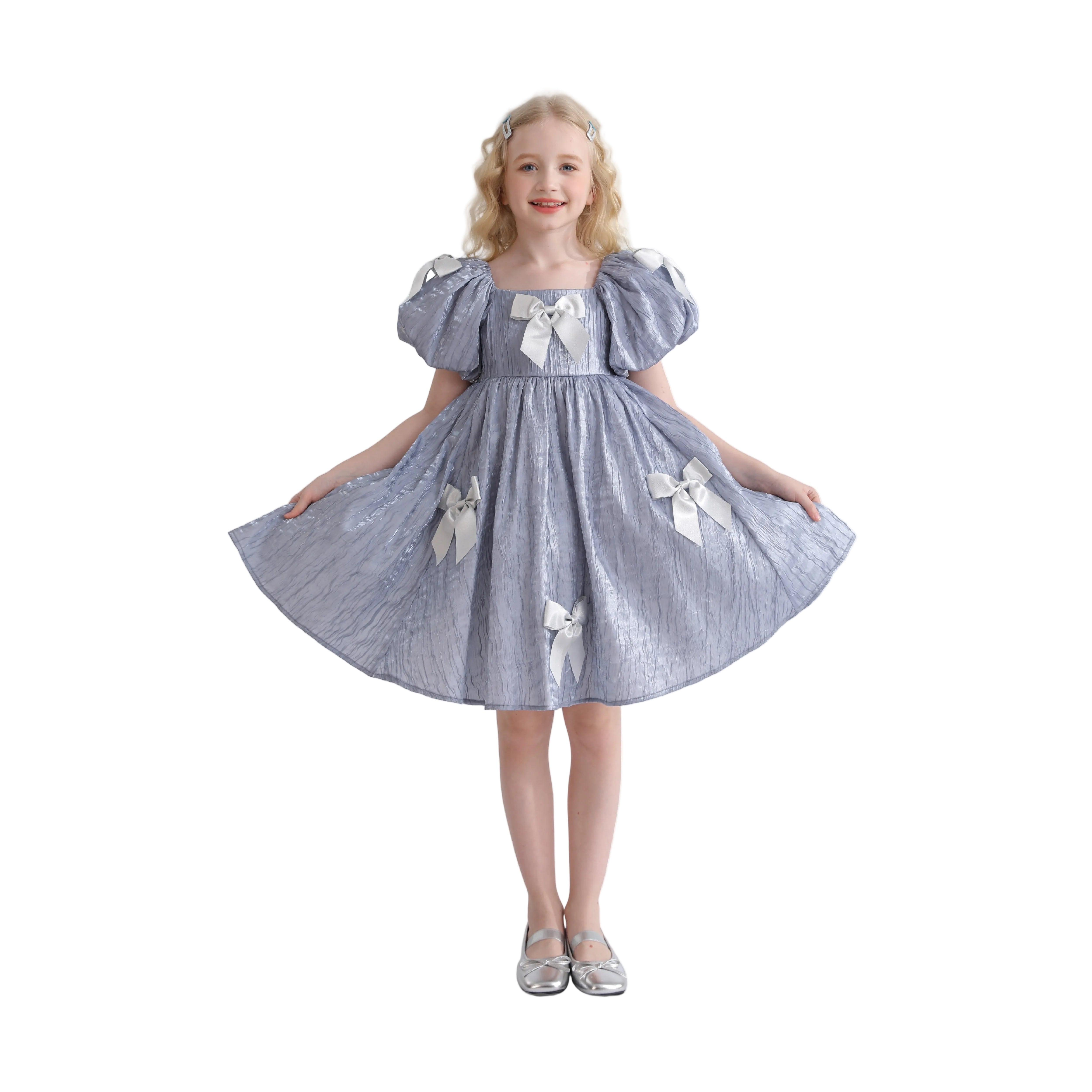 A charming formal dress in a shiny blue tone, featuring puffed sleeves and a flared skirt. Decorated with five satin bows across the bodice, sleeves, and skirt, it brings a playful yet elegant touch to special occasions.