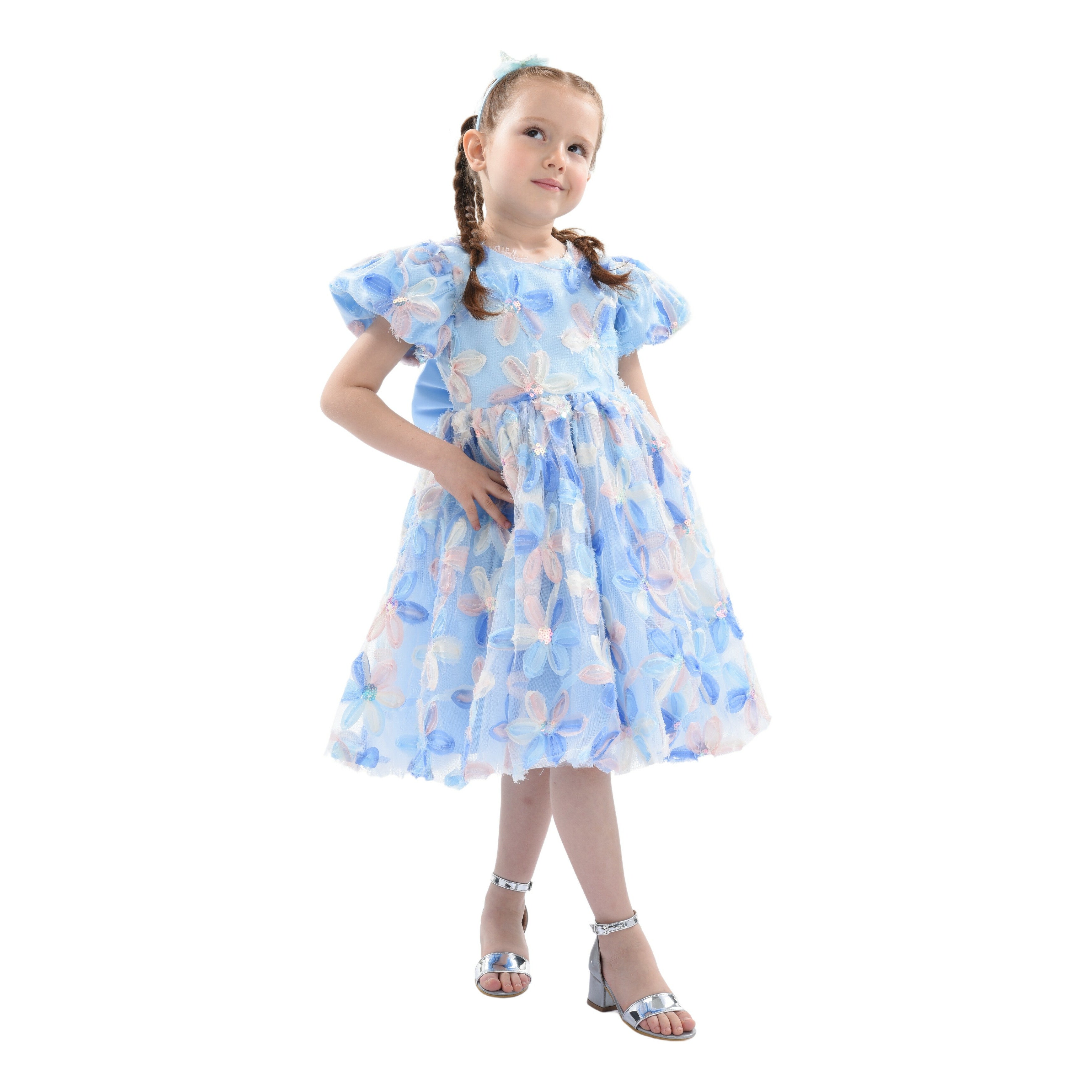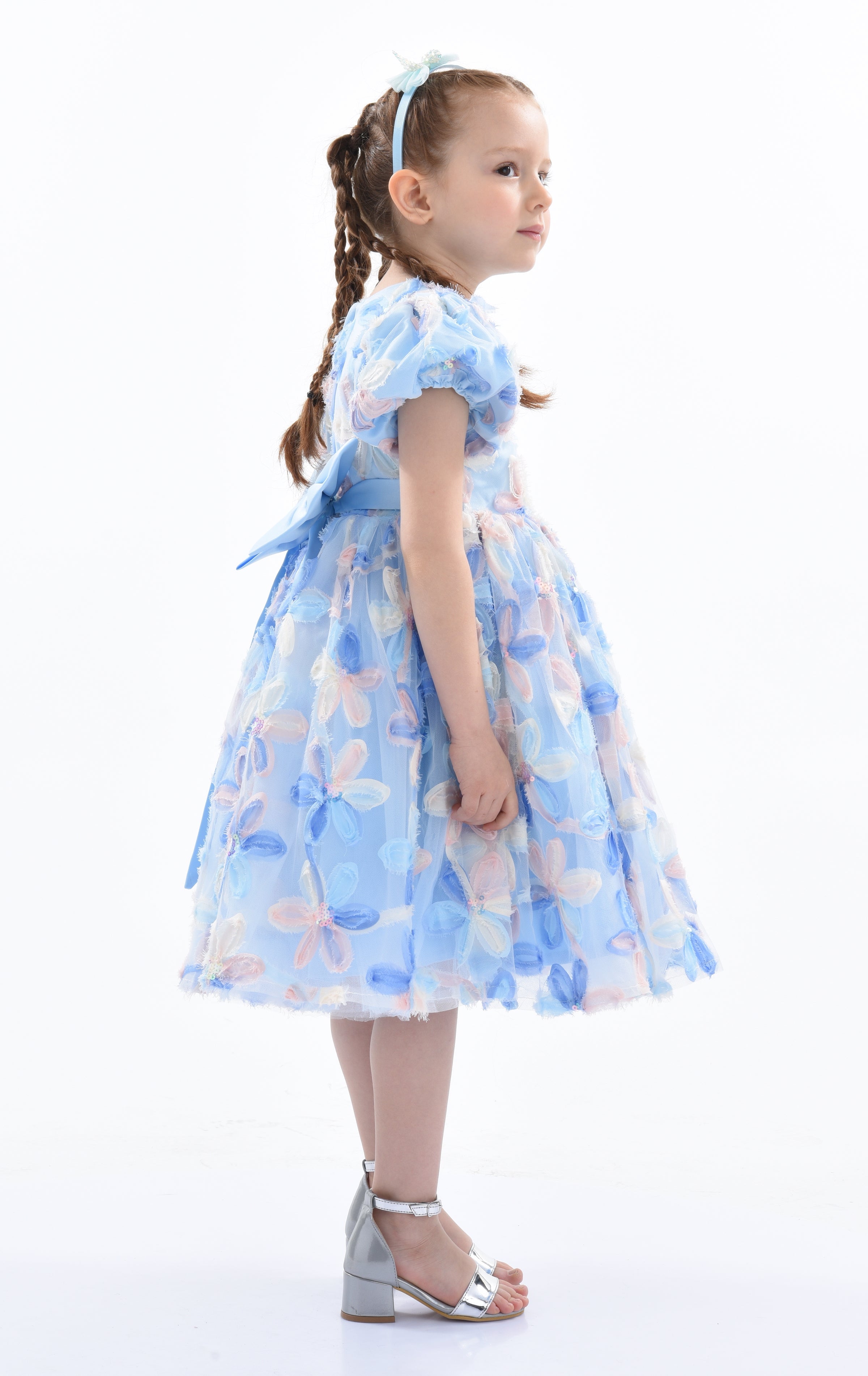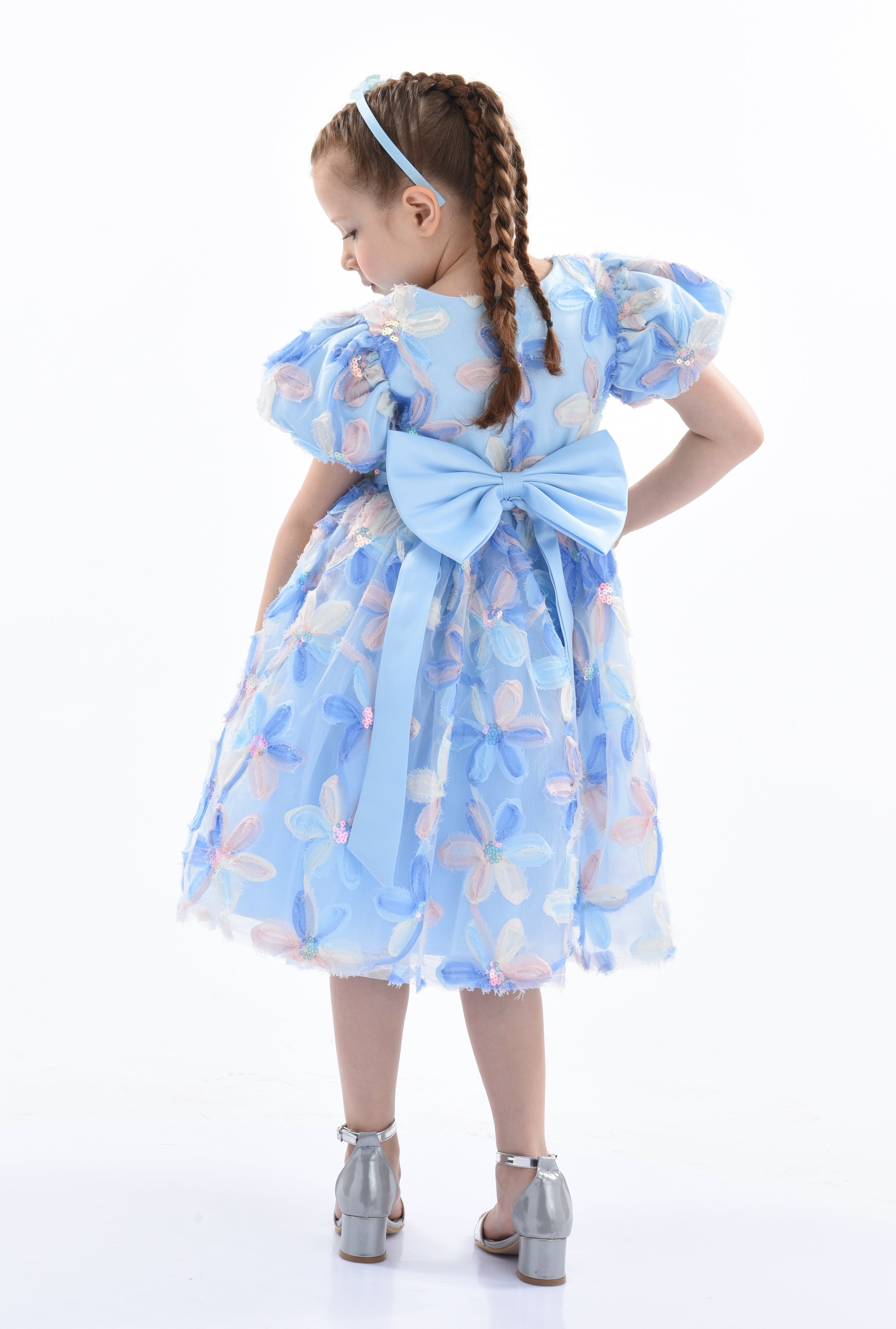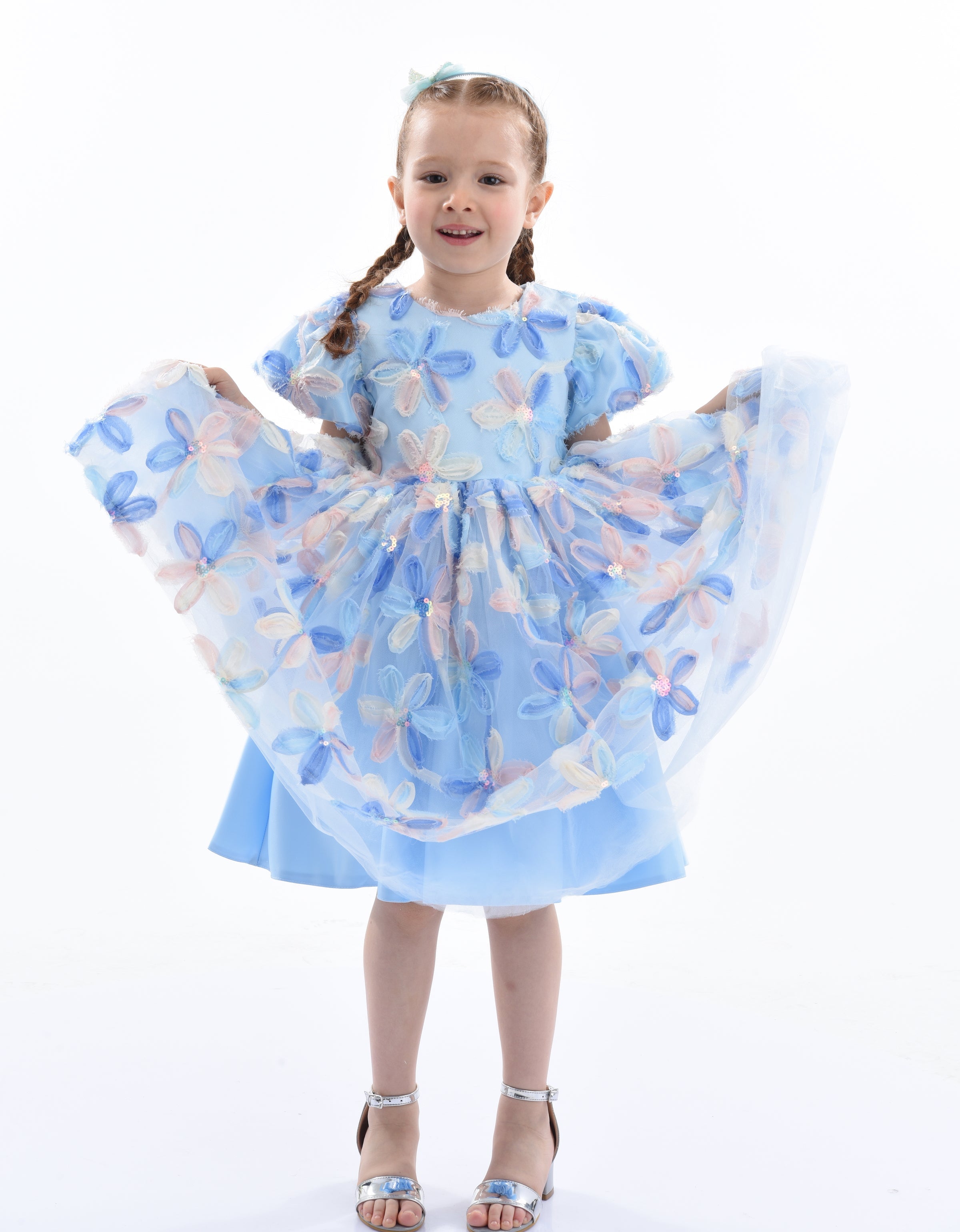 Furthermore, the dress is designed for dry cleaning, maintaining its quality and appearance over time. Overall, the Blue Daisy Embroidered Party Dress combines style, comfort, and playful design, making it a perfect choice for any young girl's wardrobe. This dress ensures your child looks adorable and feels special at any event.