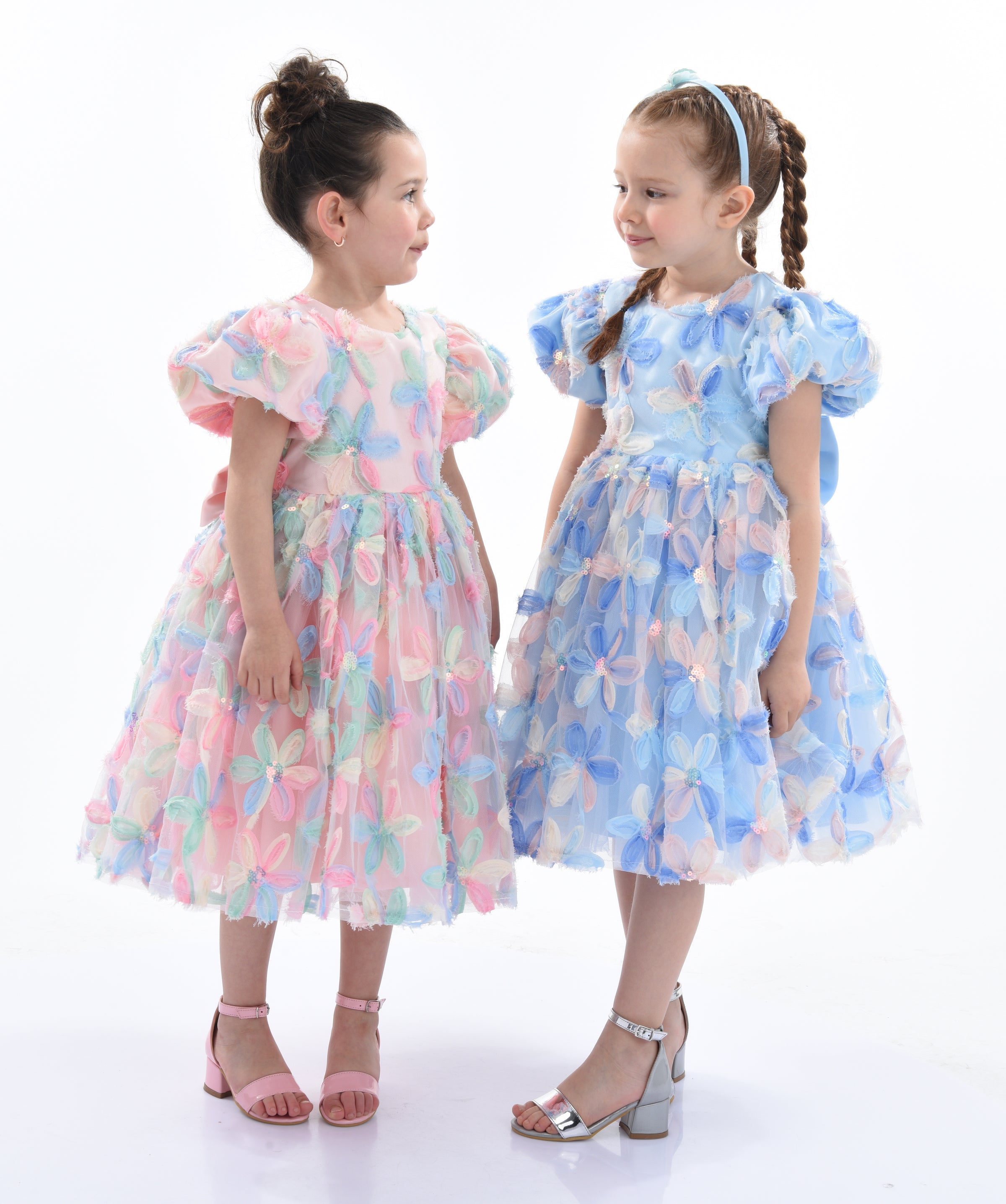 The Blue Daisy Embroidered Party Dress for kid and baby girls from Mimi Tutu adds charm to any special occasion. This dress features a playful puff sleeve and a high-waisted bodice design with multicolored daisy embroidery.