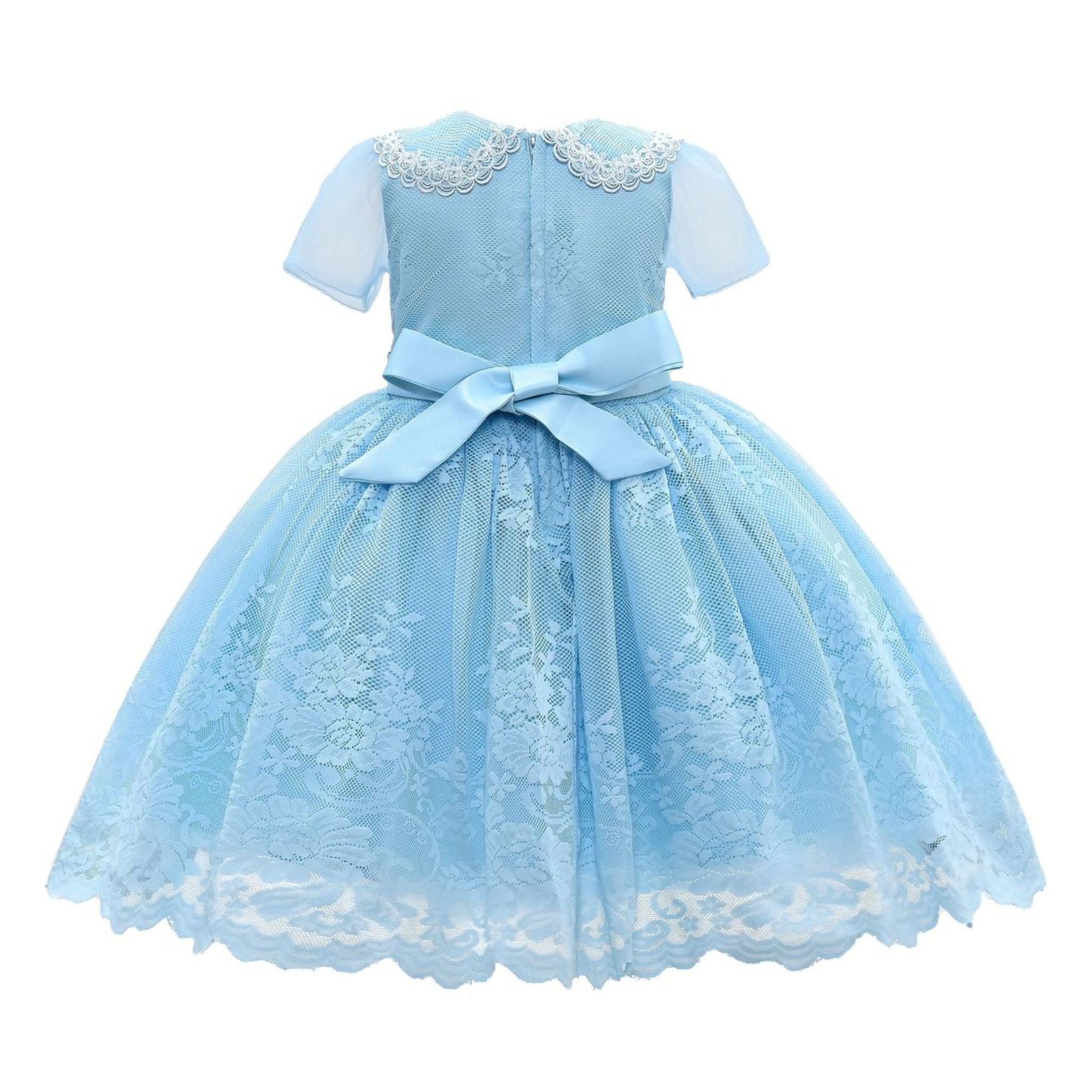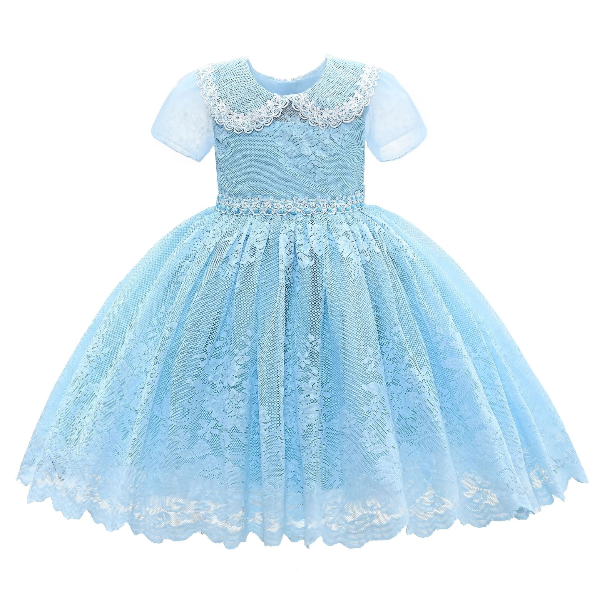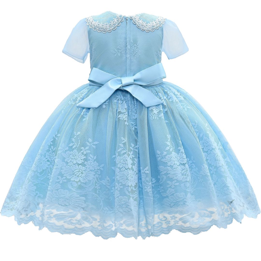 The Blue Dolly Lace Embroidered Dress for kid girls from Tulleen is an exquisite choice for any special occasion. Crafted with attention to detail, the dress features a collared short sleeve bodice adorned with intricate lace embroidery.