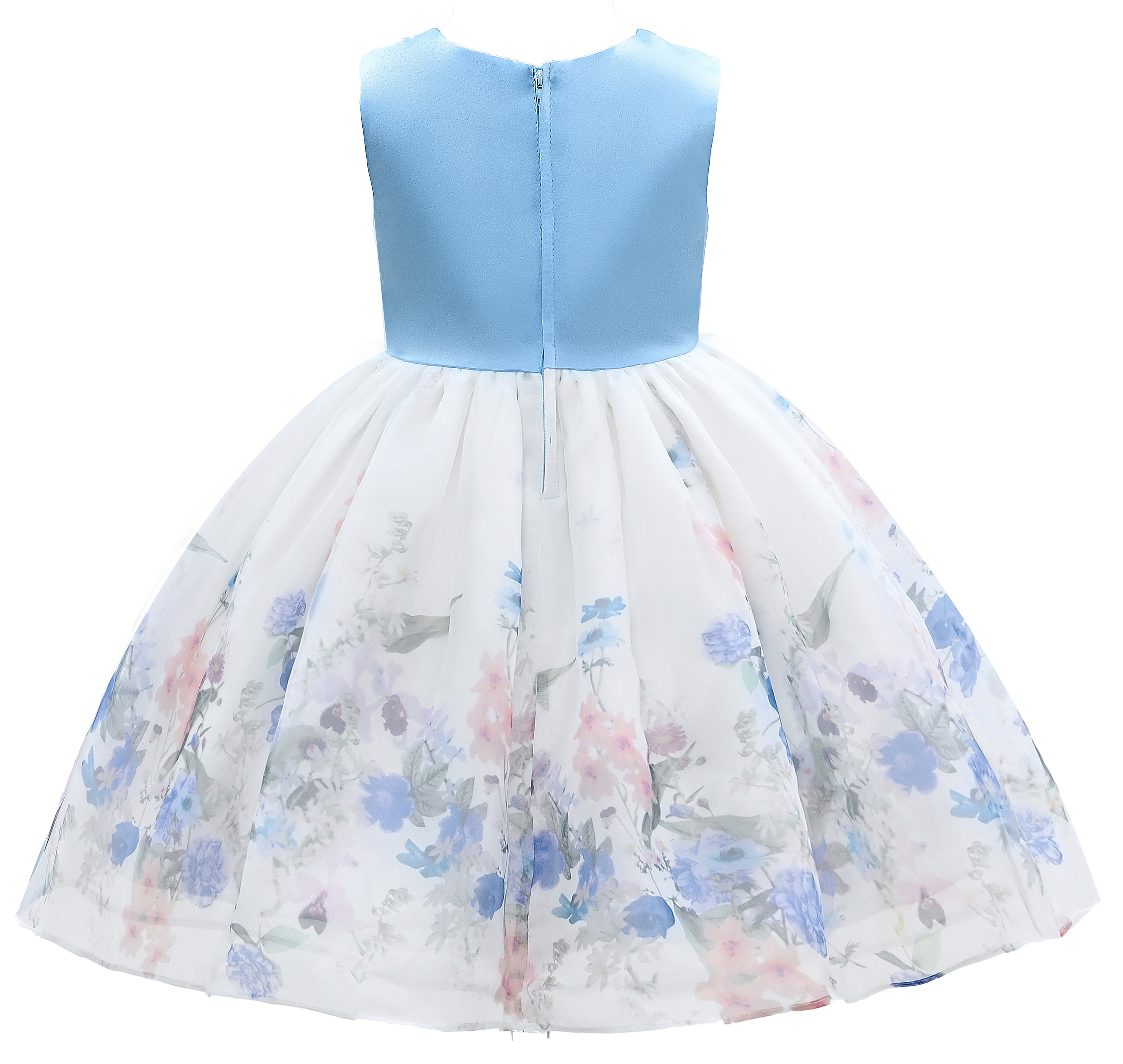 The Blue Mabel Floral Garden Organza Dress for kid girls from Tulleen is a perfect choice for any special occasion. This dress features a sleeveless satin round neck bodice, offering both comfort and elegance. The magical centerpiece of this dress is its dreamy white lightweight tulle skirt, adorned with a mesmerizing floral garden design.