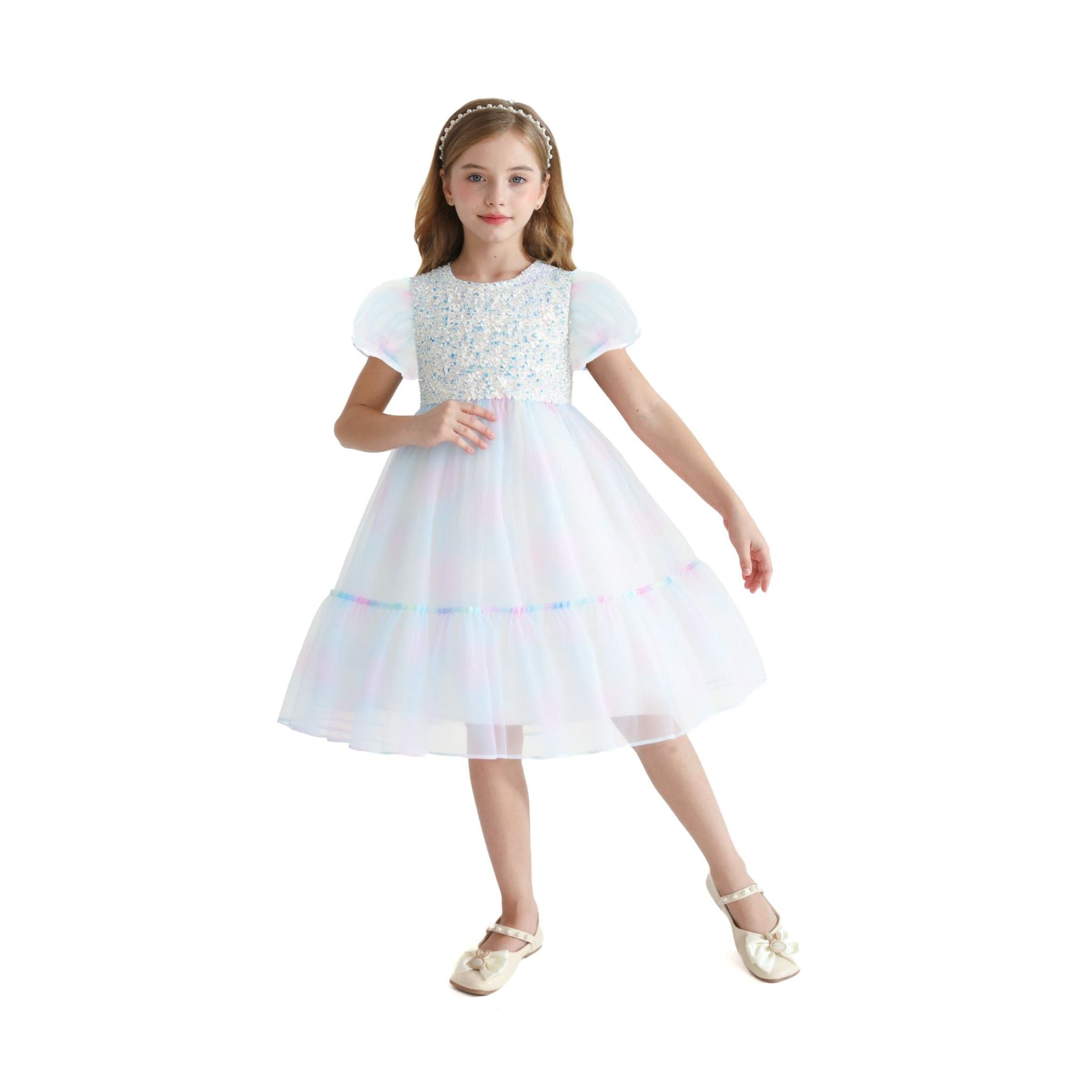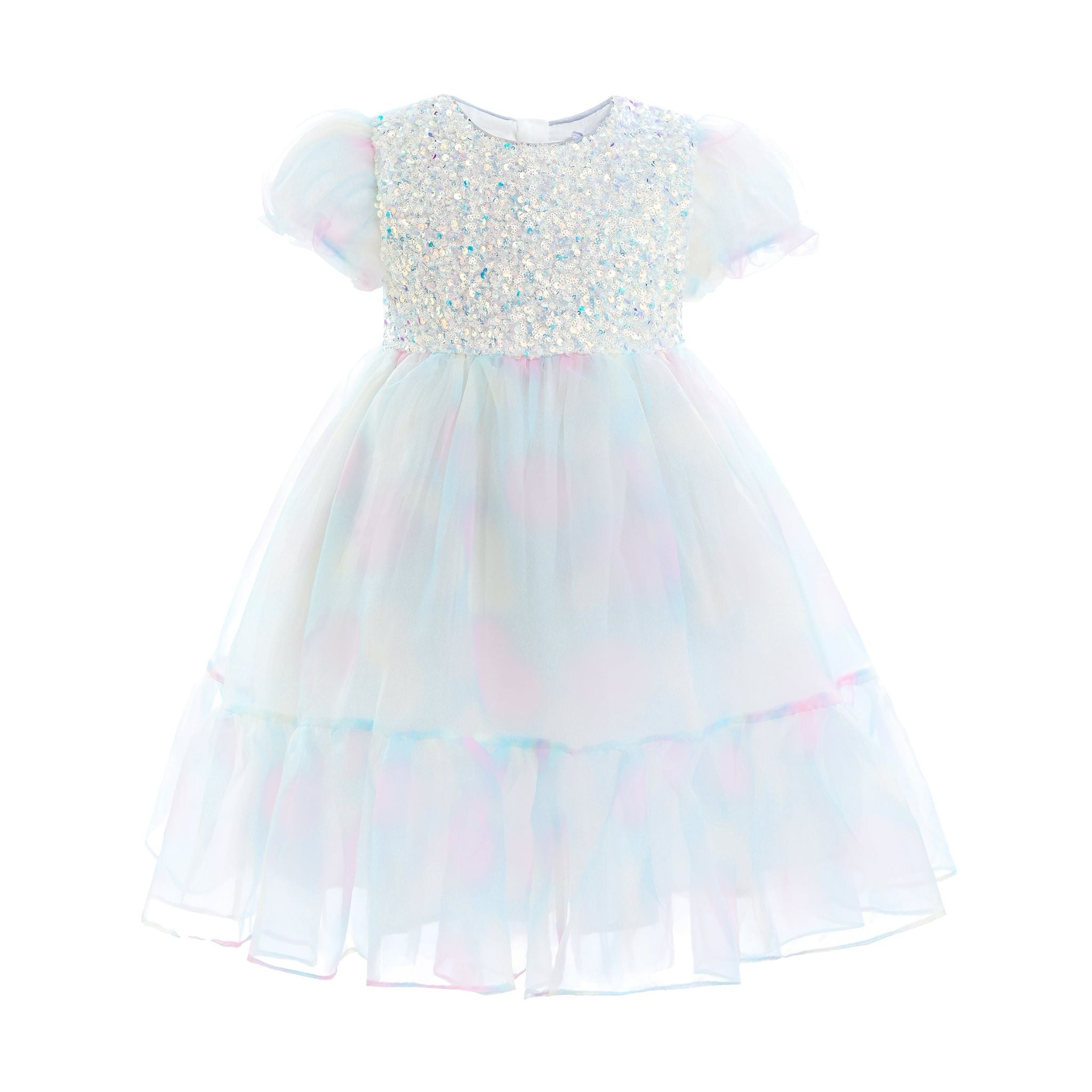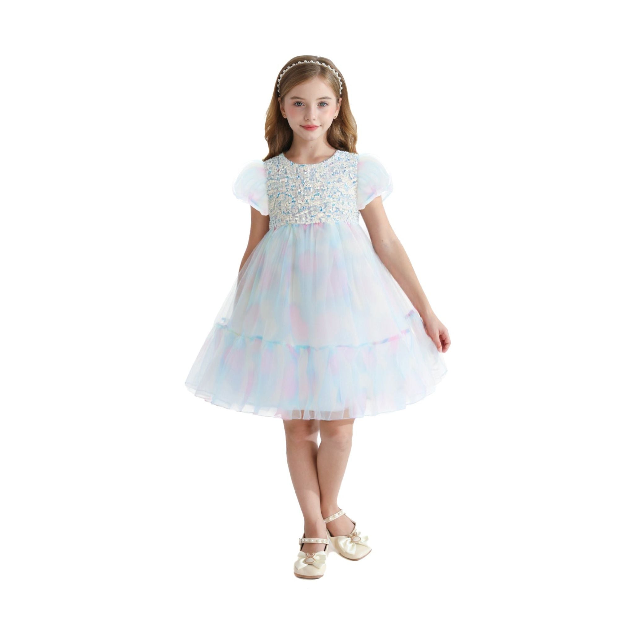 The Blue Sequin Color Bloom Dress sparkles with vibrant charm, featuring a rich blue hue and shimmering sequin accents that catch the light with every move. Layers of soft tulle add volume and a playful flair, creating a standout silhouette full of energy and shine.