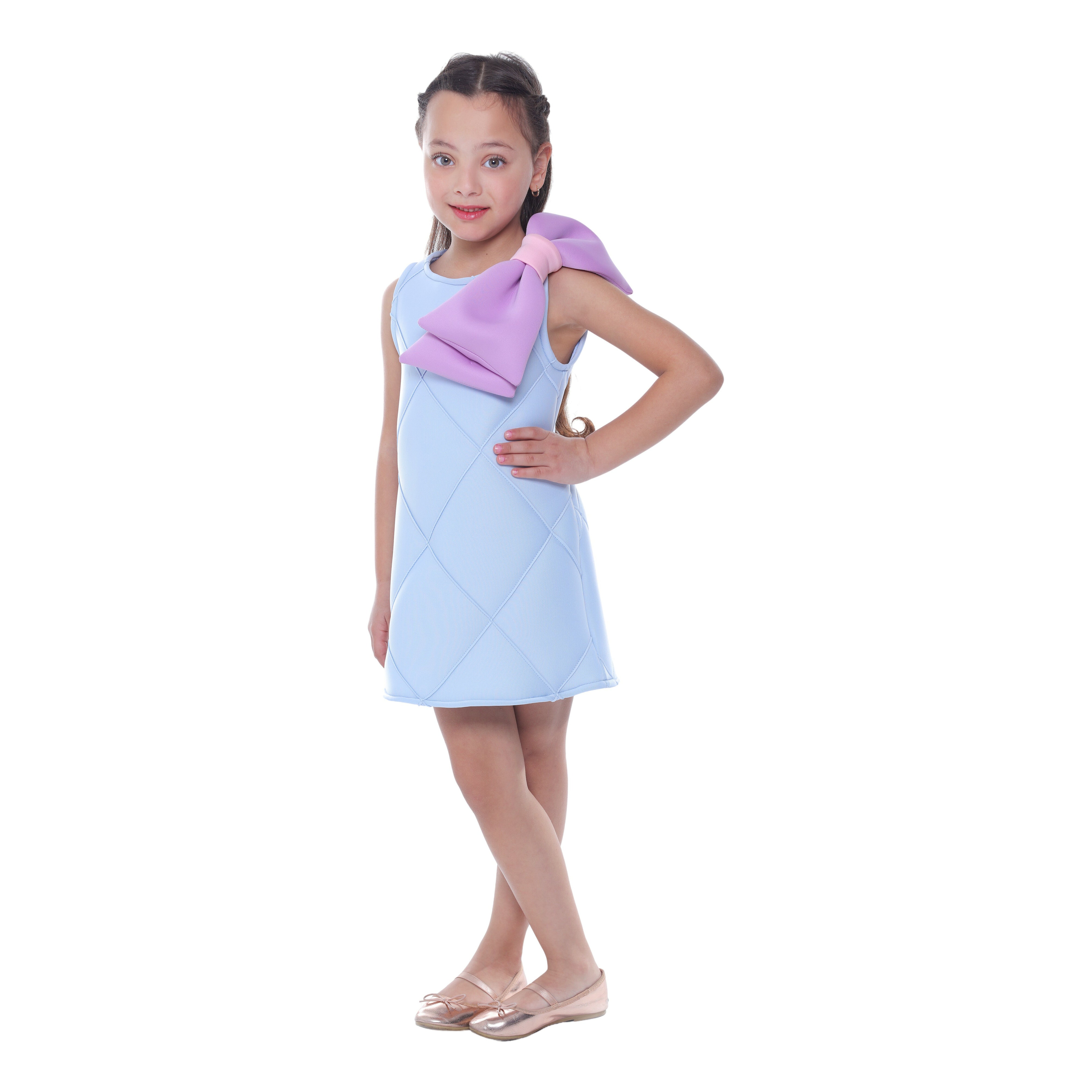 Furthermore, the blend of 95% polyester and 5% spandex ensures the dress is soft, stretchy, and easy to move in. Overall, the Blue Skylar Bow Sleeveless Dress combines elegance, comfort, and playful design elements, making it a must-have addition to any young girl's wardrobe.