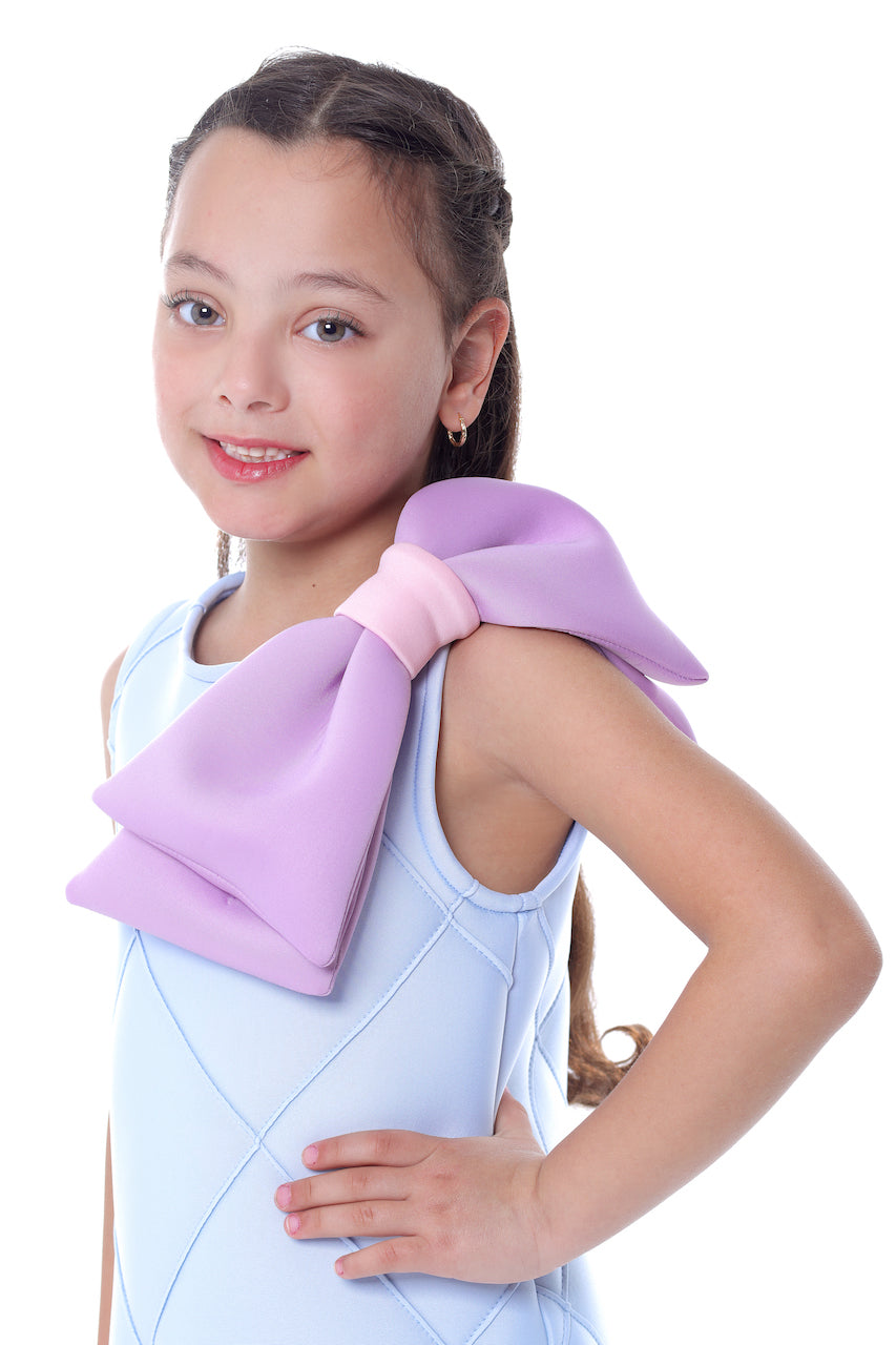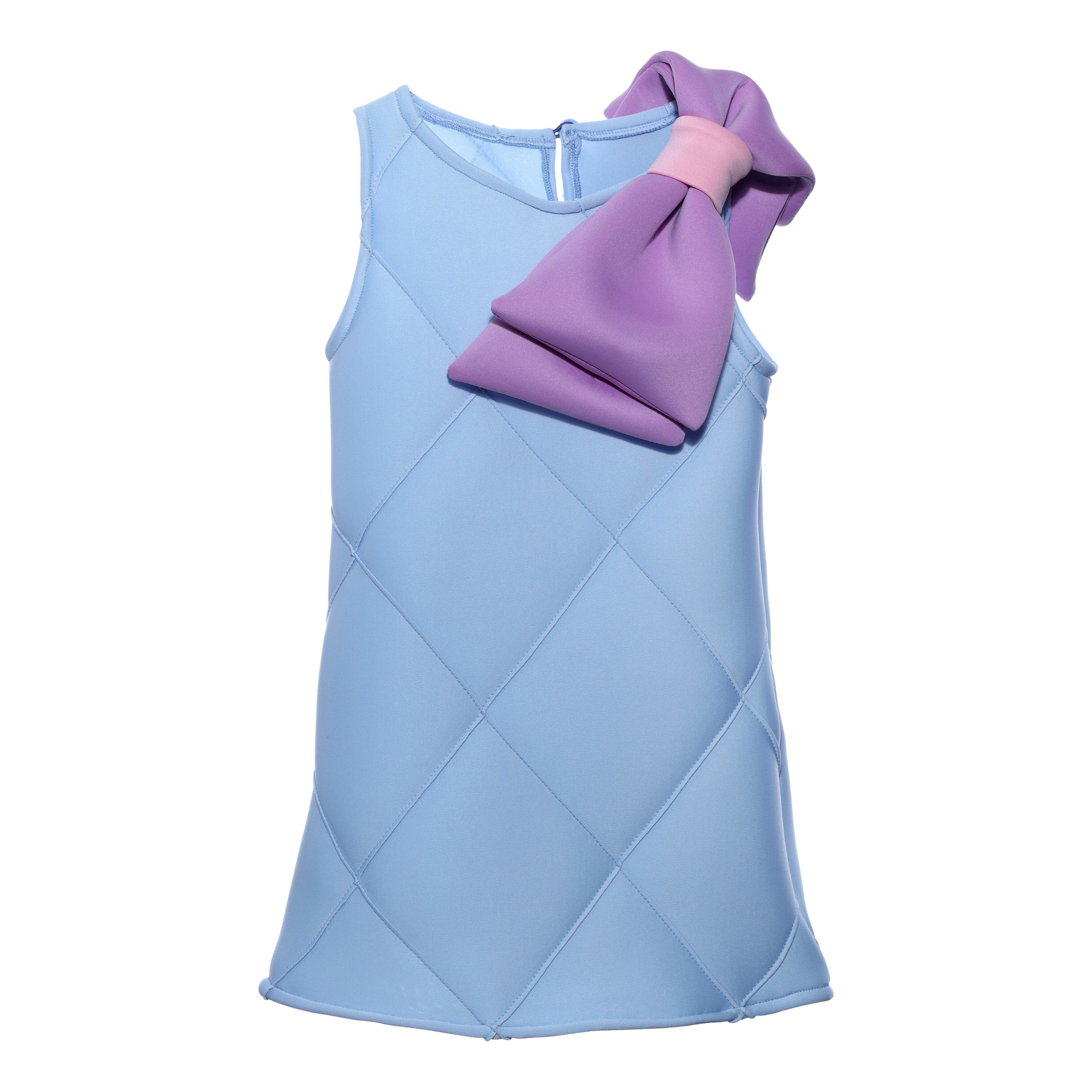 The Blue Skylar Bow Sleeveless Dress for kid and baby girls from Mimi Tutu is an elegant and charming piece perfect for any special occasion. This dress features a sleeveless cut and a round neck, ensuring a comfortable and classic fit. Firstly, the standout feature is the purple bow applique across the shoulder, adding a touch of whimsy and sophistication.