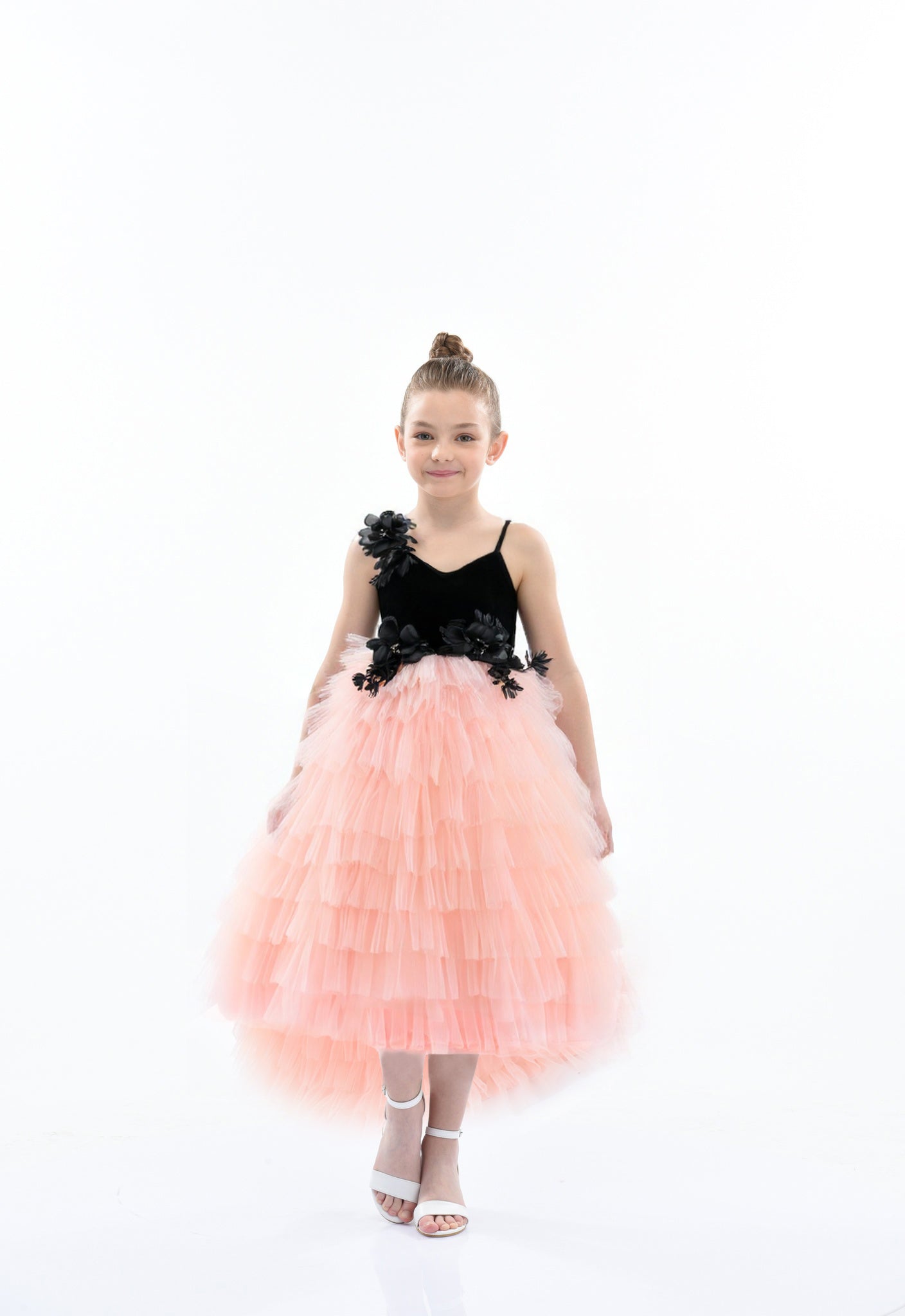 A show-stopping silhouette designed for grand entrances, this formal gown pairs a sculptural black bodice with cascading blush tulle. The dramatic contrast and textural details make it ideal for galas, proms, or editorial moments.