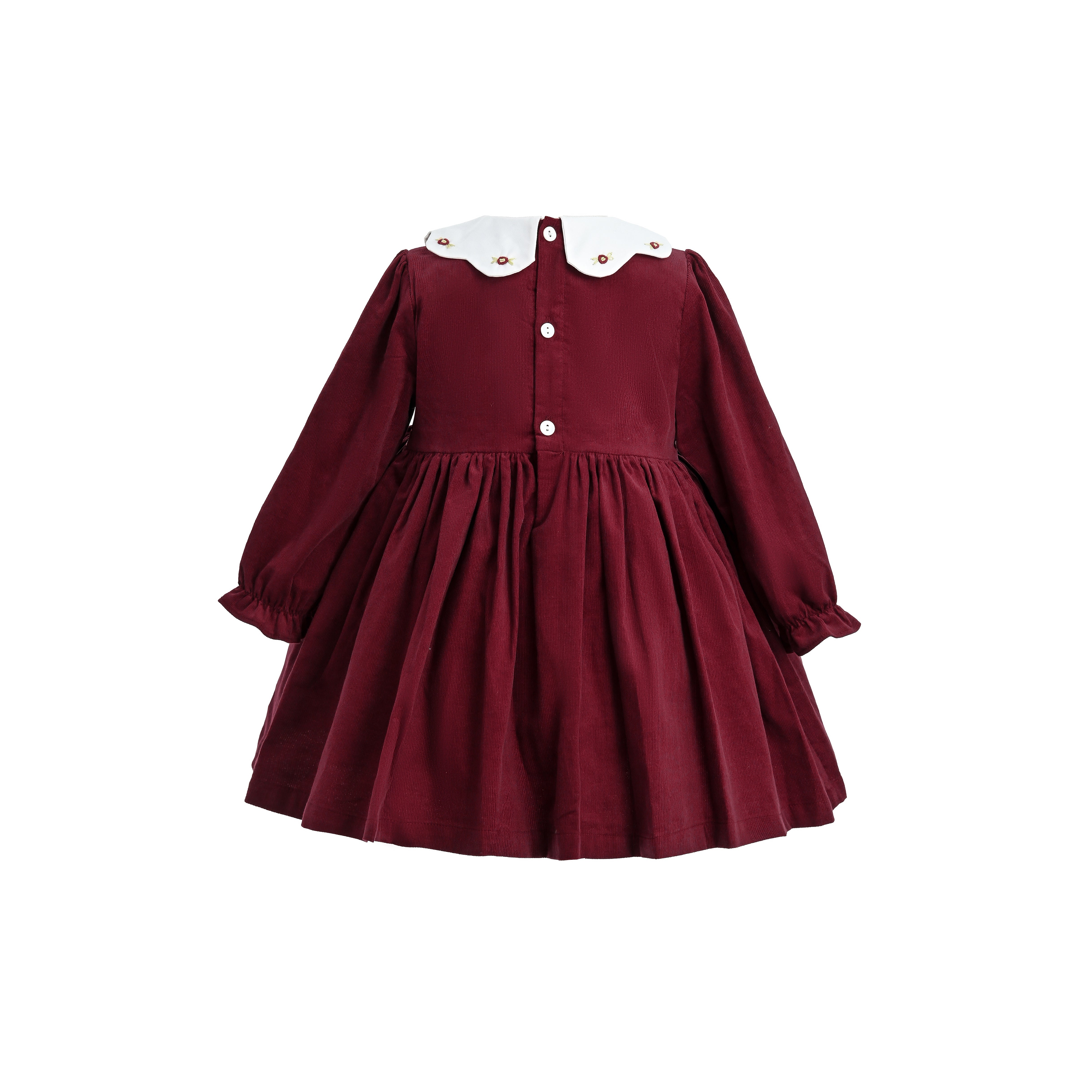 A festive classic with heirloom charm, this burgundy dress blends intricate detail with timeless elegance—perfect for seasonal celebrations and formal occasions.