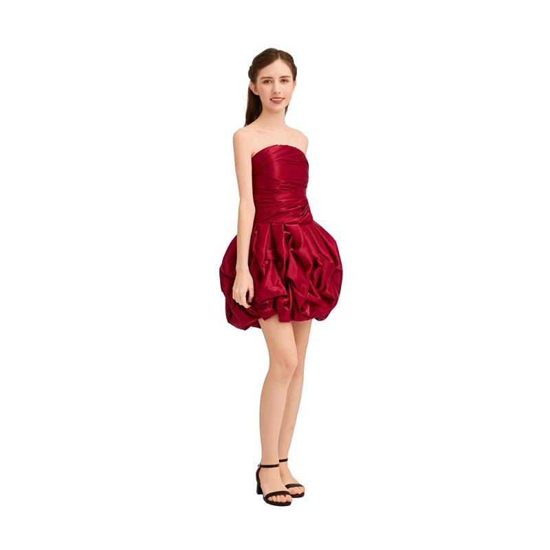 This glamorous piece features a fitted, pleated bodice paired with a voluminous ruched skirt that creates a playful balloon-like silhouette. Crafted from shiny satin, it balances elegance with youthful charm, making it perfect for proms, parties, or formal occasions.