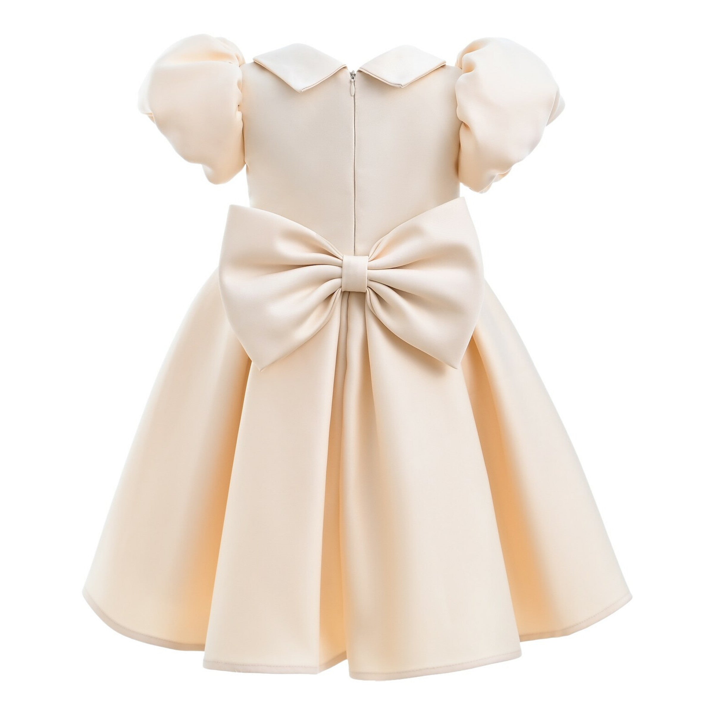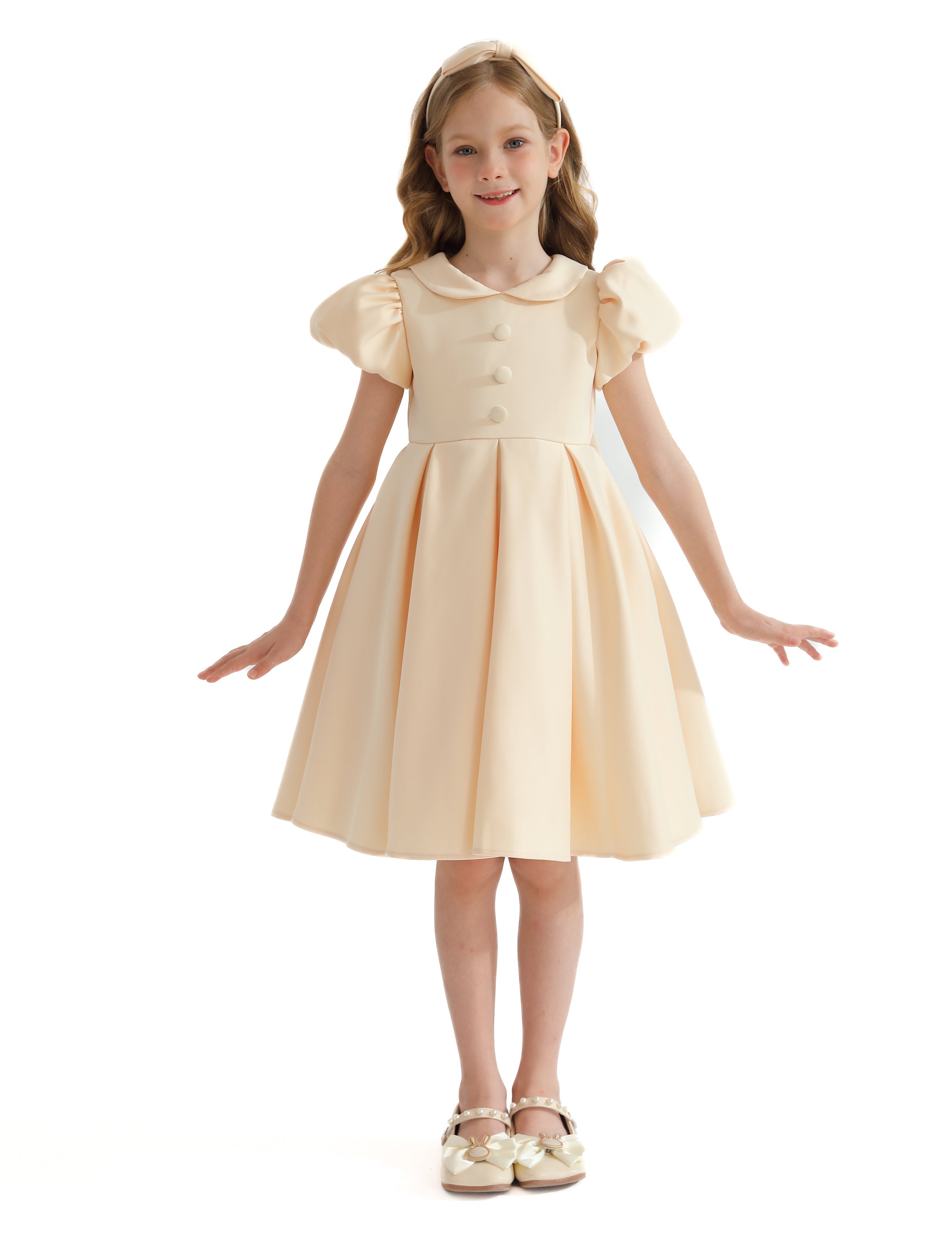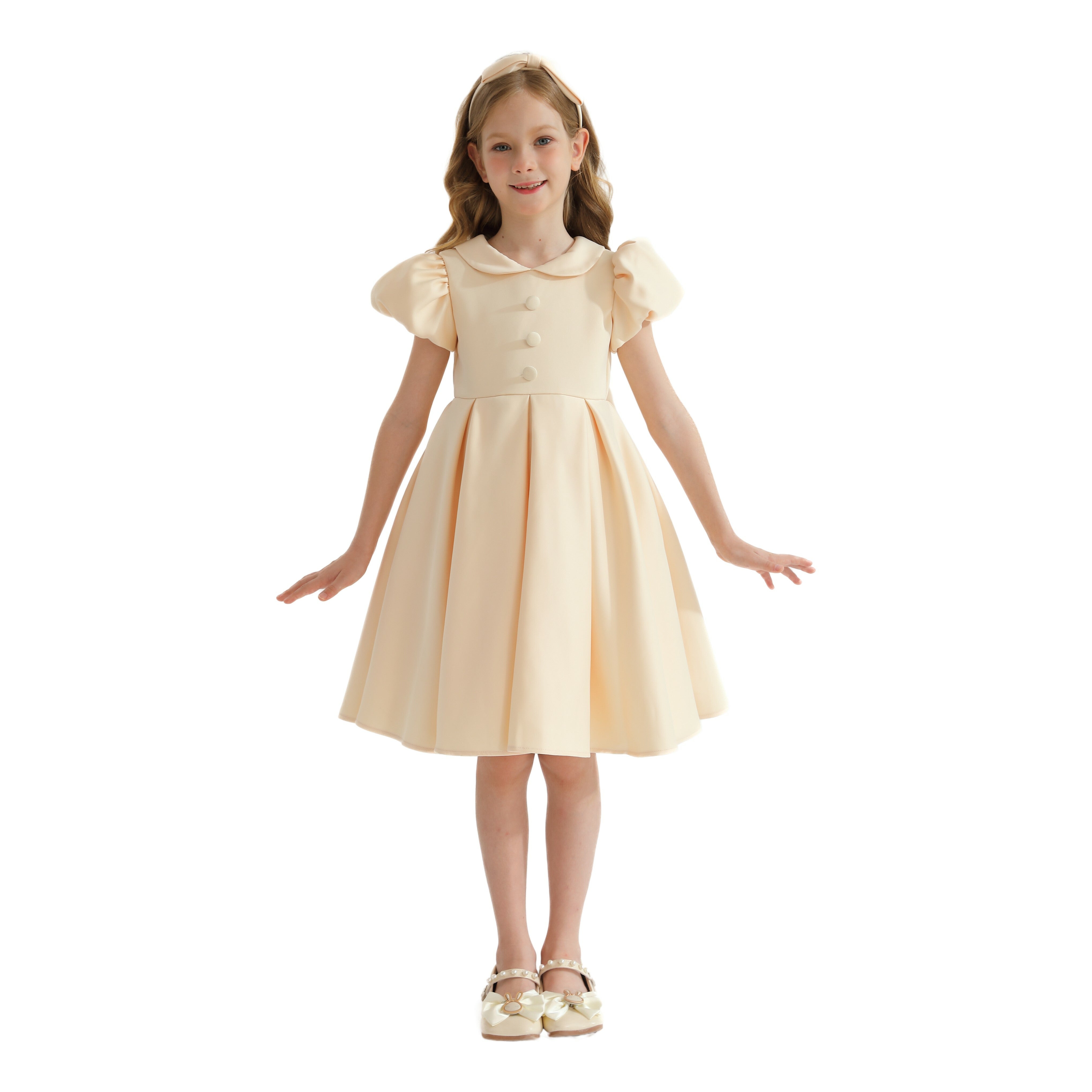 The Champagne Barrymore Teacup Button Dress for kid girls from Tulleen is an elegant and sophisticated choice for any special occasion. This dress features a charming puff shoulder bodice, giving it a timeless and stylish look. Firstly, the dress includes a classic collar and three pseudo buttons, adding a touch of refinement.