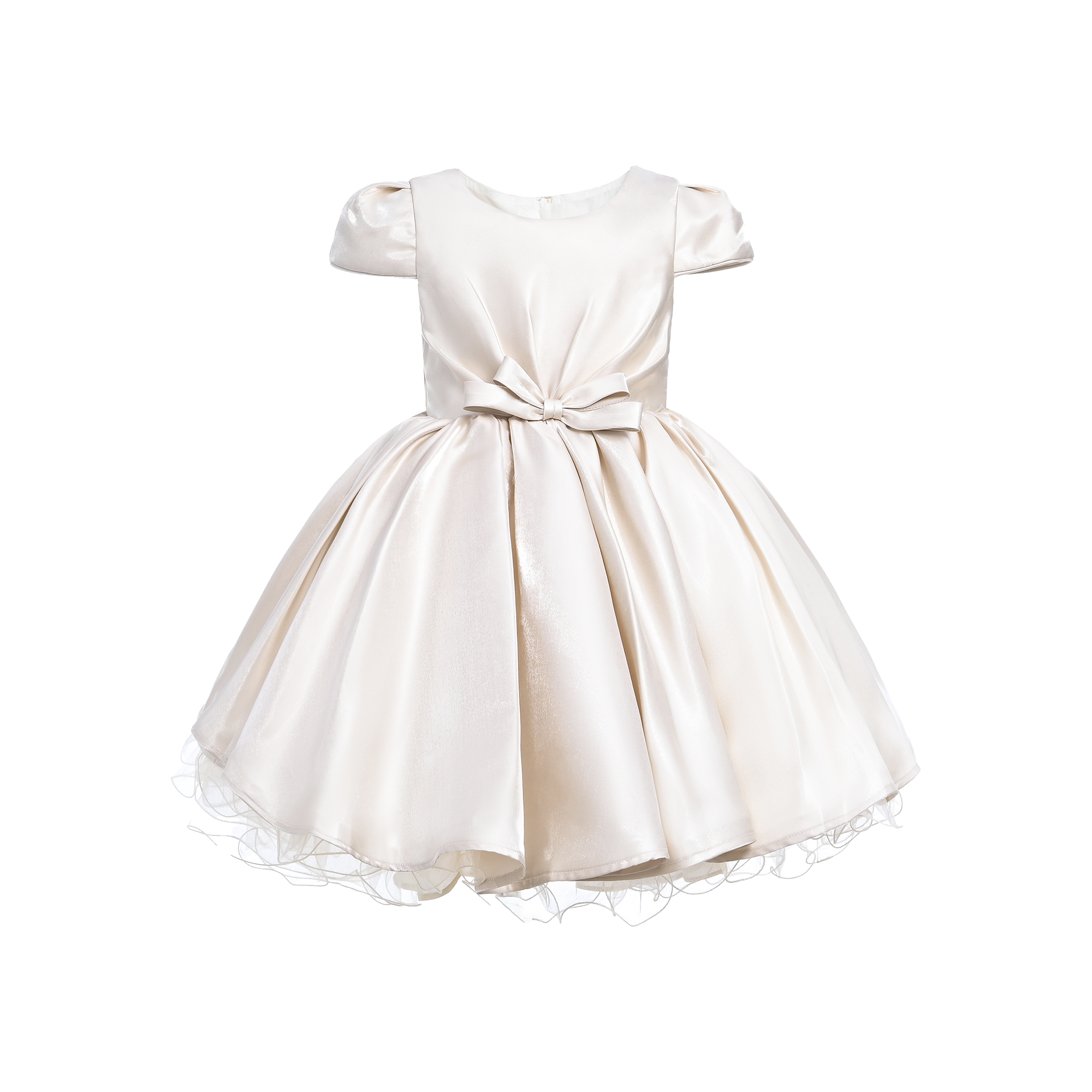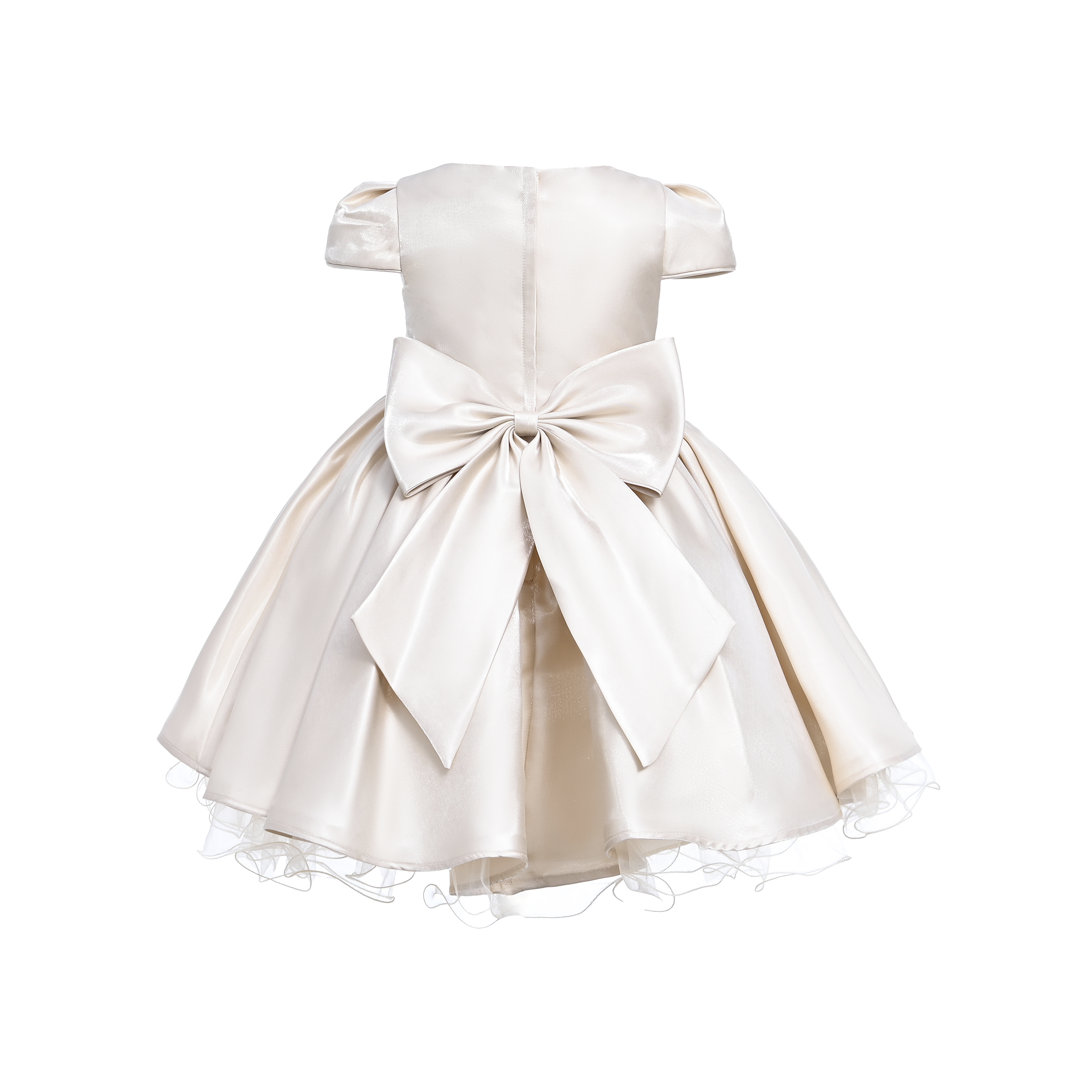 Introducing the Champagne Bow Short Solera Dress by Tulleen, a stunning combination of elegance and youthful grace. With its radiant champagne satin hue, this short dress exudes warmth and sophistication, making it ideal for both special occasions and everyday celebrations.