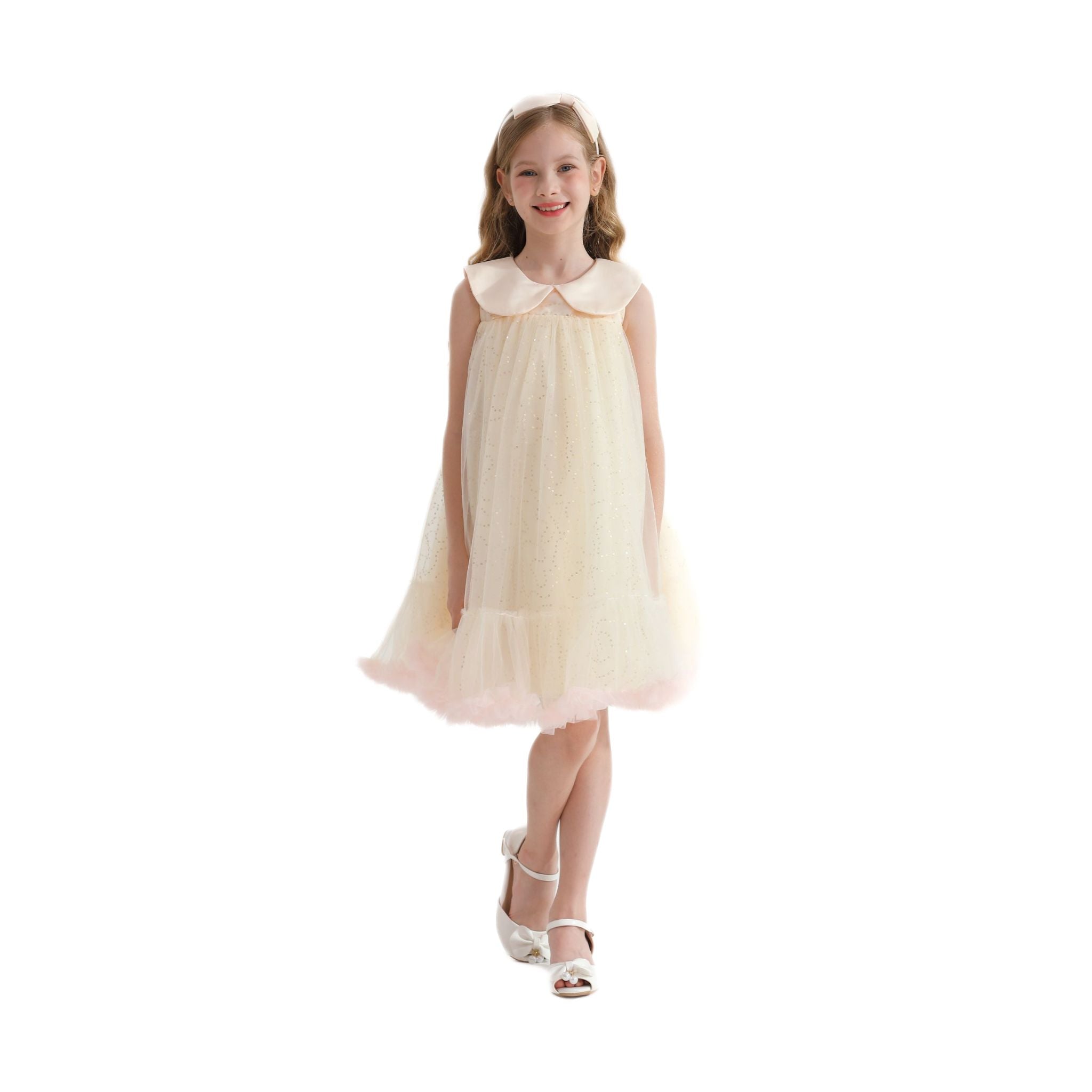 The Champagne Caledonia Pleated Dress for kid and baby girls from Tulleen is a beautiful and elegant choice for any special occasion. This dress features a sleeveless balloon silhouette in a charming champagne beige color, creating a sophisticated and stylish look. Firstly, the dress includes a classic Peter Pan collar, adding a touch of vintage elegance.