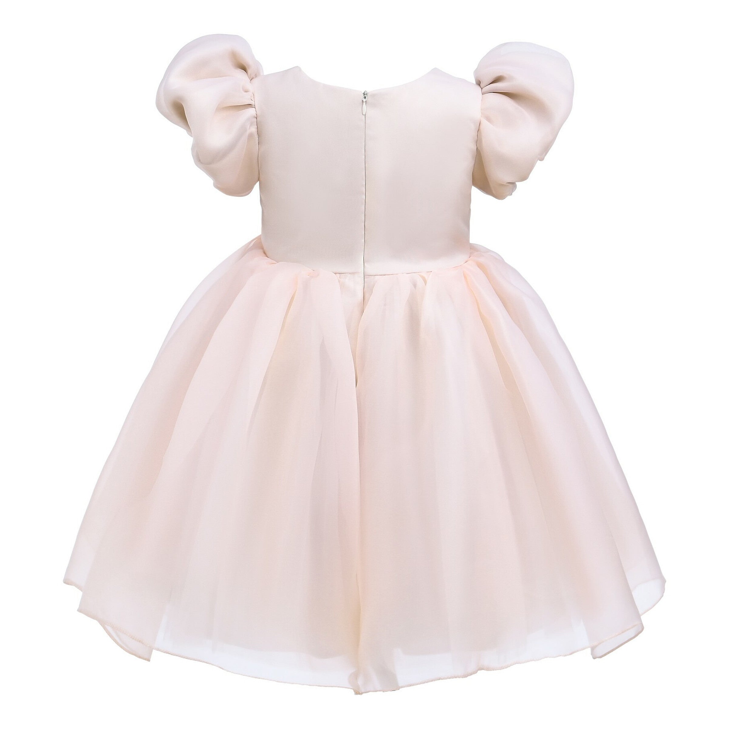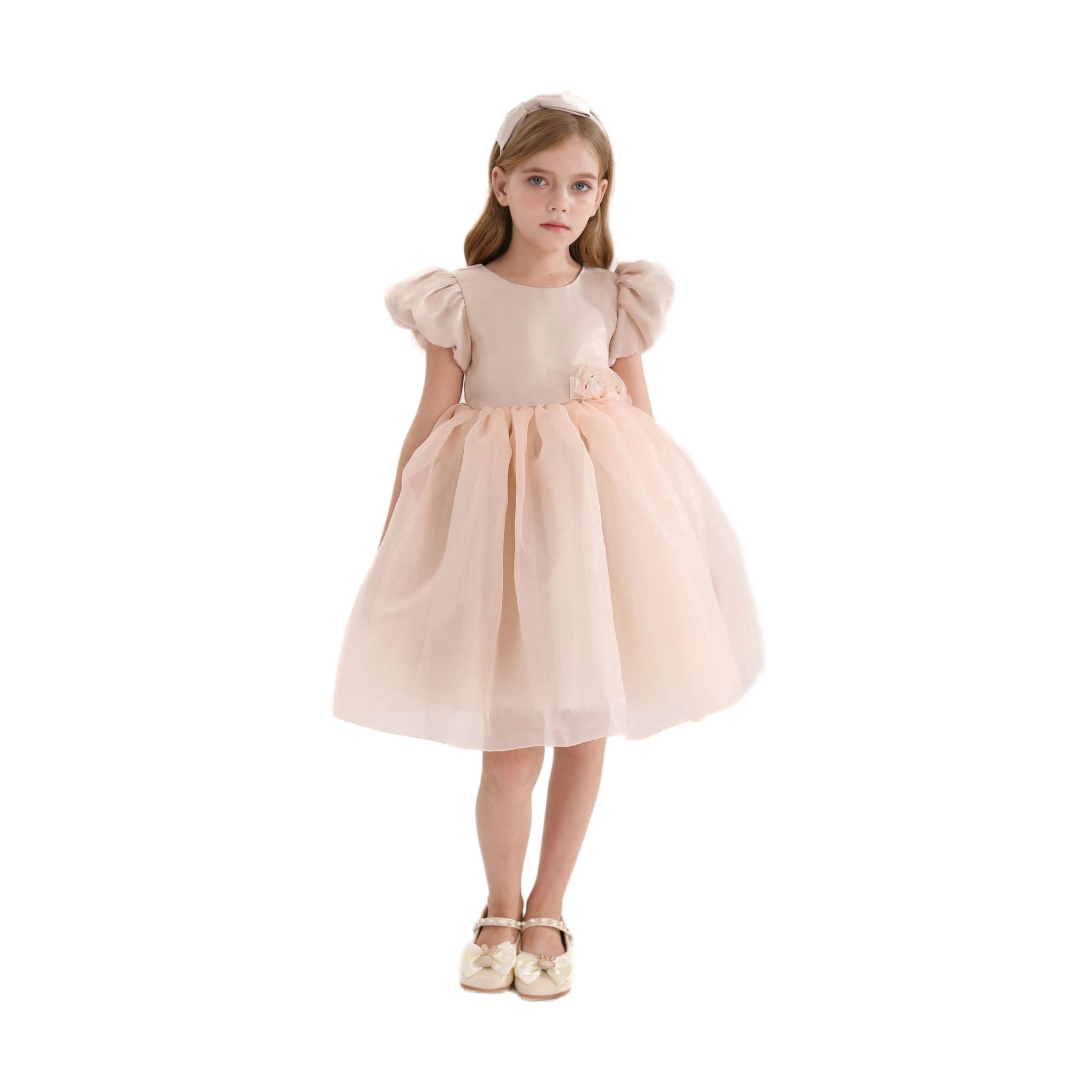 The Champagne D'Amico Floral Teacup Dress for kid girls from Tulleen is a stunning and elegant choice for any special occasion. This dress features a puff shoulder bodice, giving it a timeless and stylish look. Firstly, the floral embellishment at the hip adds a touch of charm and sophistication.