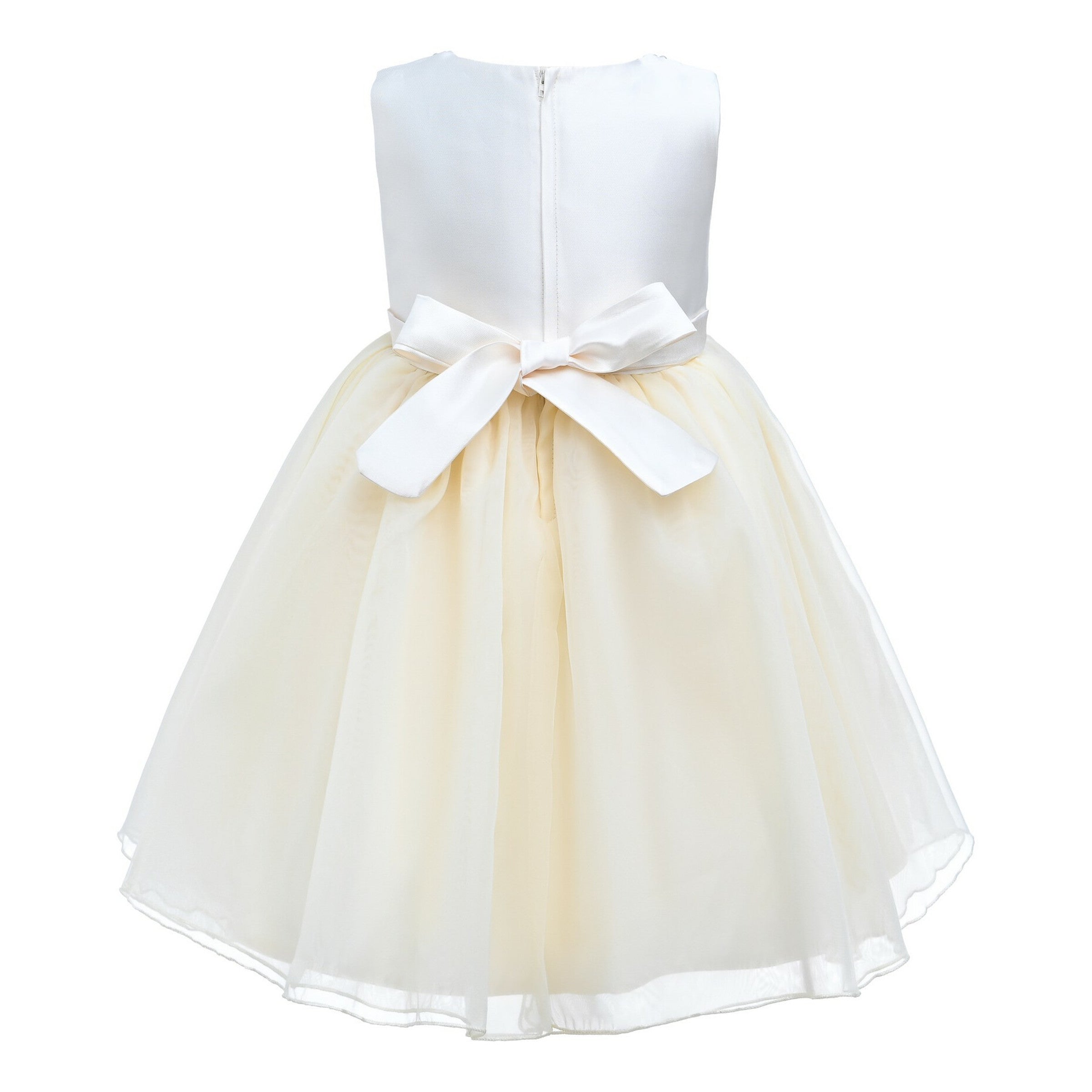 The zip closure at the back allows for easy dressing and a secure fit. Designed to be dry cleaned only, this dress maintains its quality and luxurious appearance over time. Overall, the Champagne Felice Tulle Bow Dress combines elegance, comfort, and stylish design elements, making it a perfect addition to any young girl's wardrobe. This dress ensures your child looks and feels special at any event.