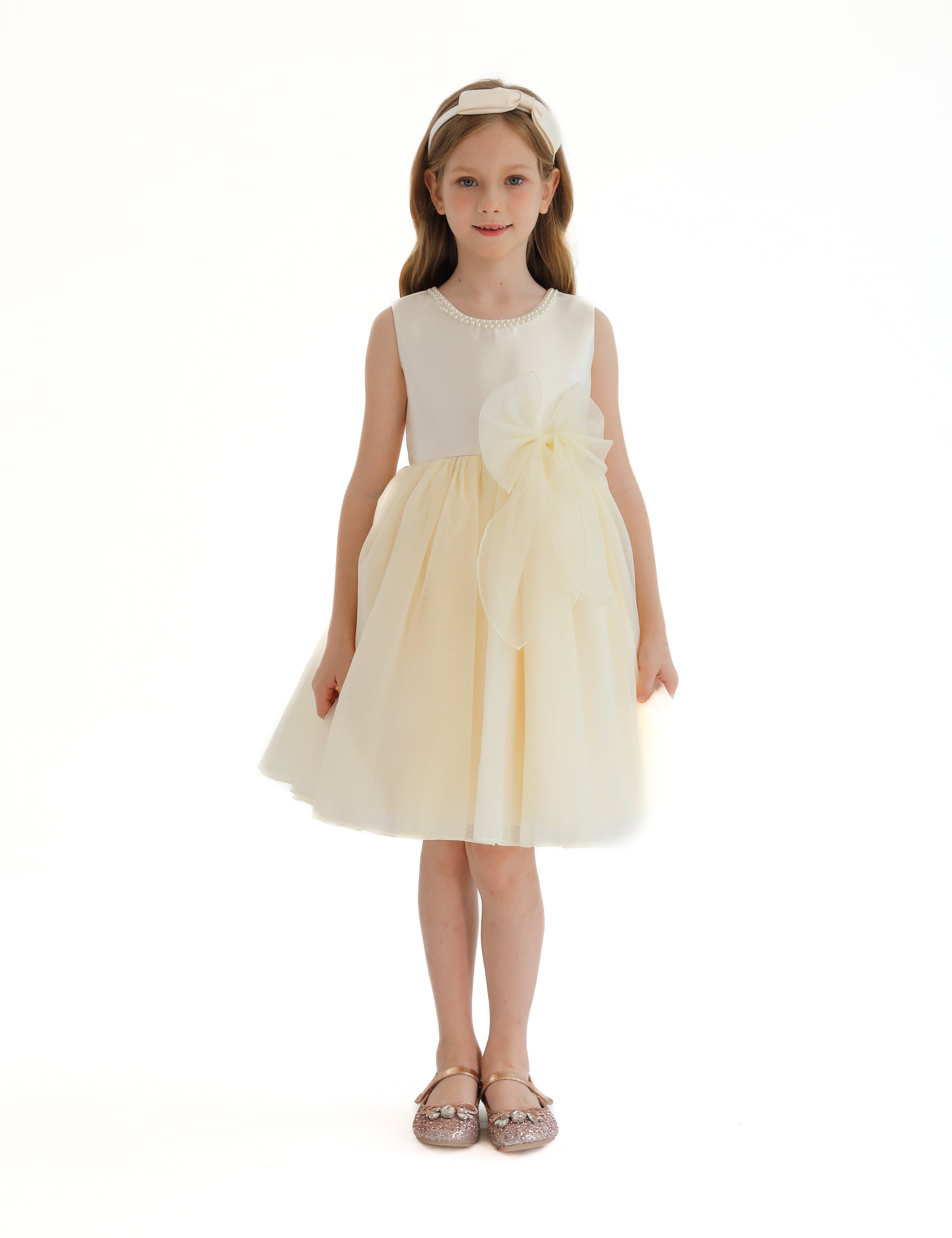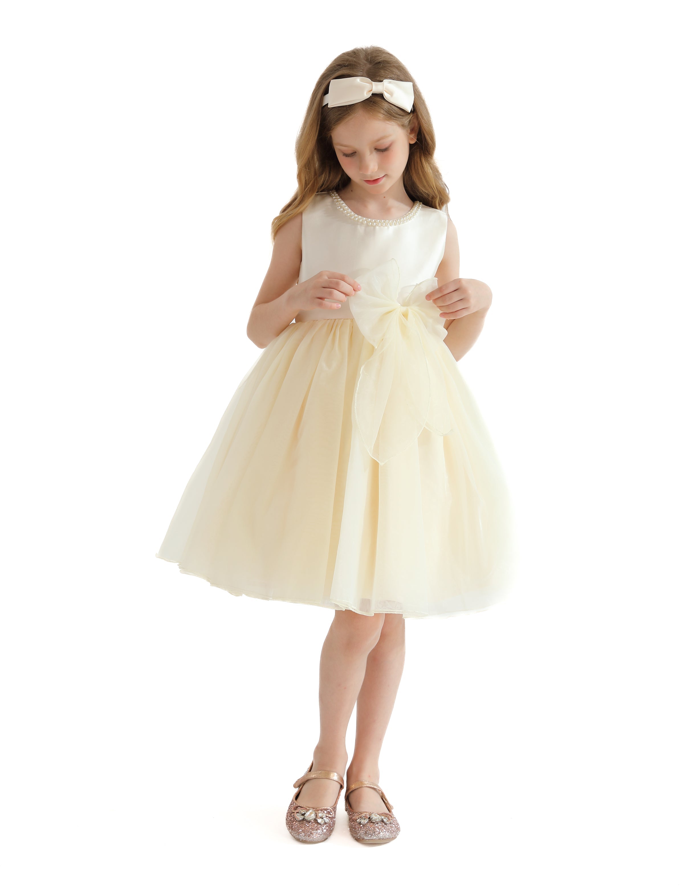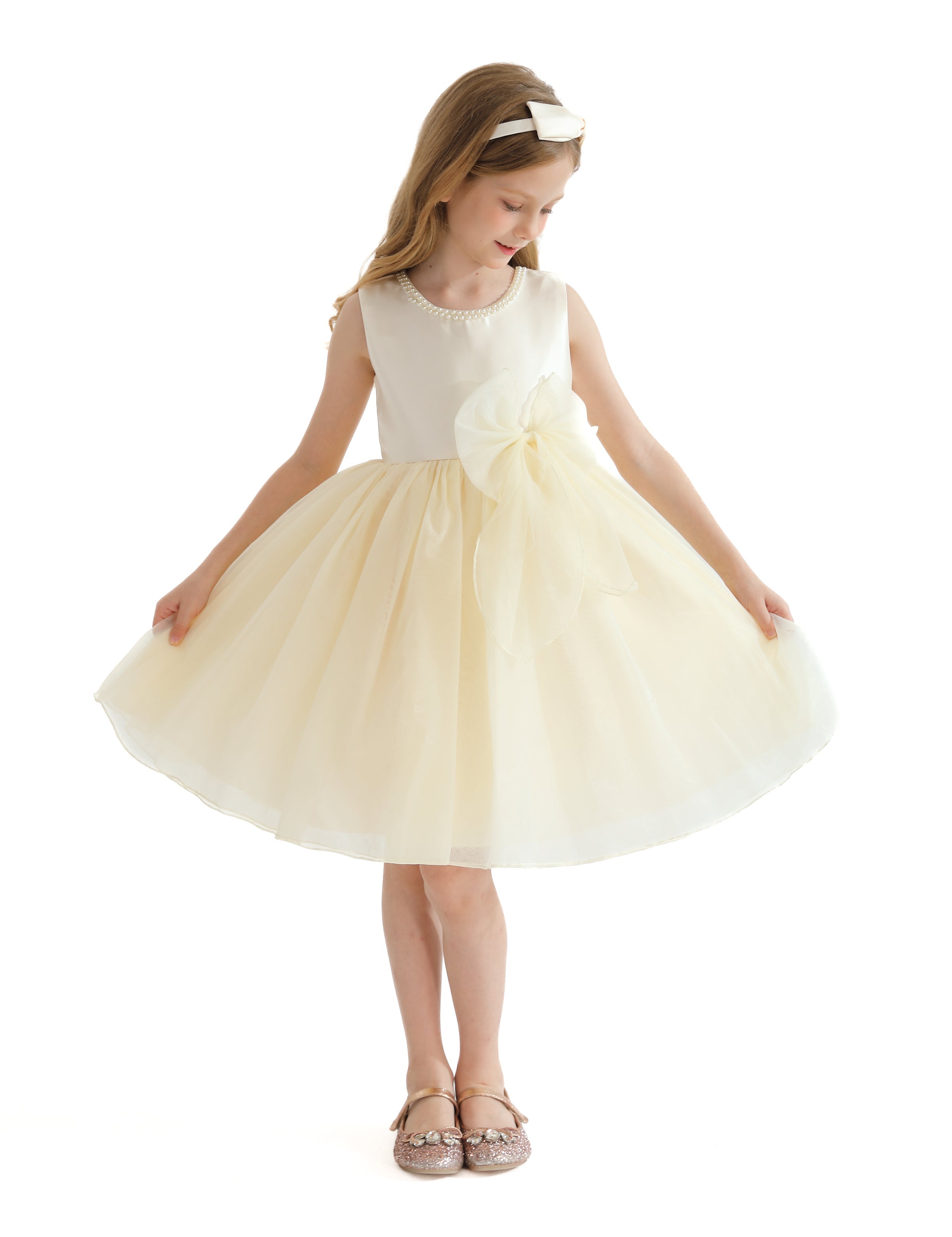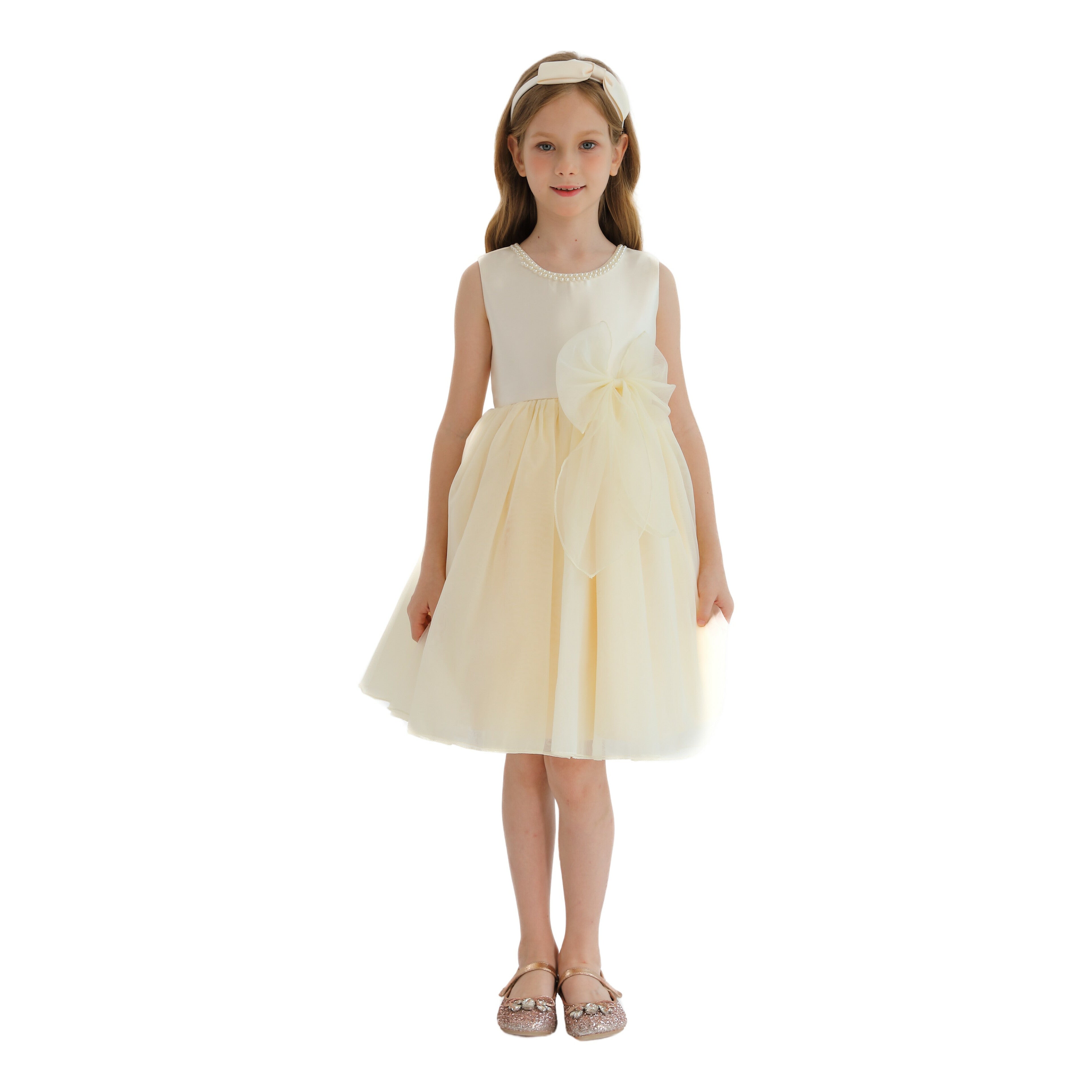 The Champagne Felice Tulle Bow Dress for kid girls from Tulleen is a stunning and elegant choice for any special occasion. This dress features a sleeveless glimmer bodice, adding a touch of sparkle and sophistication. Firstly, the round neck and pearl trim enhance the classic and refined look.