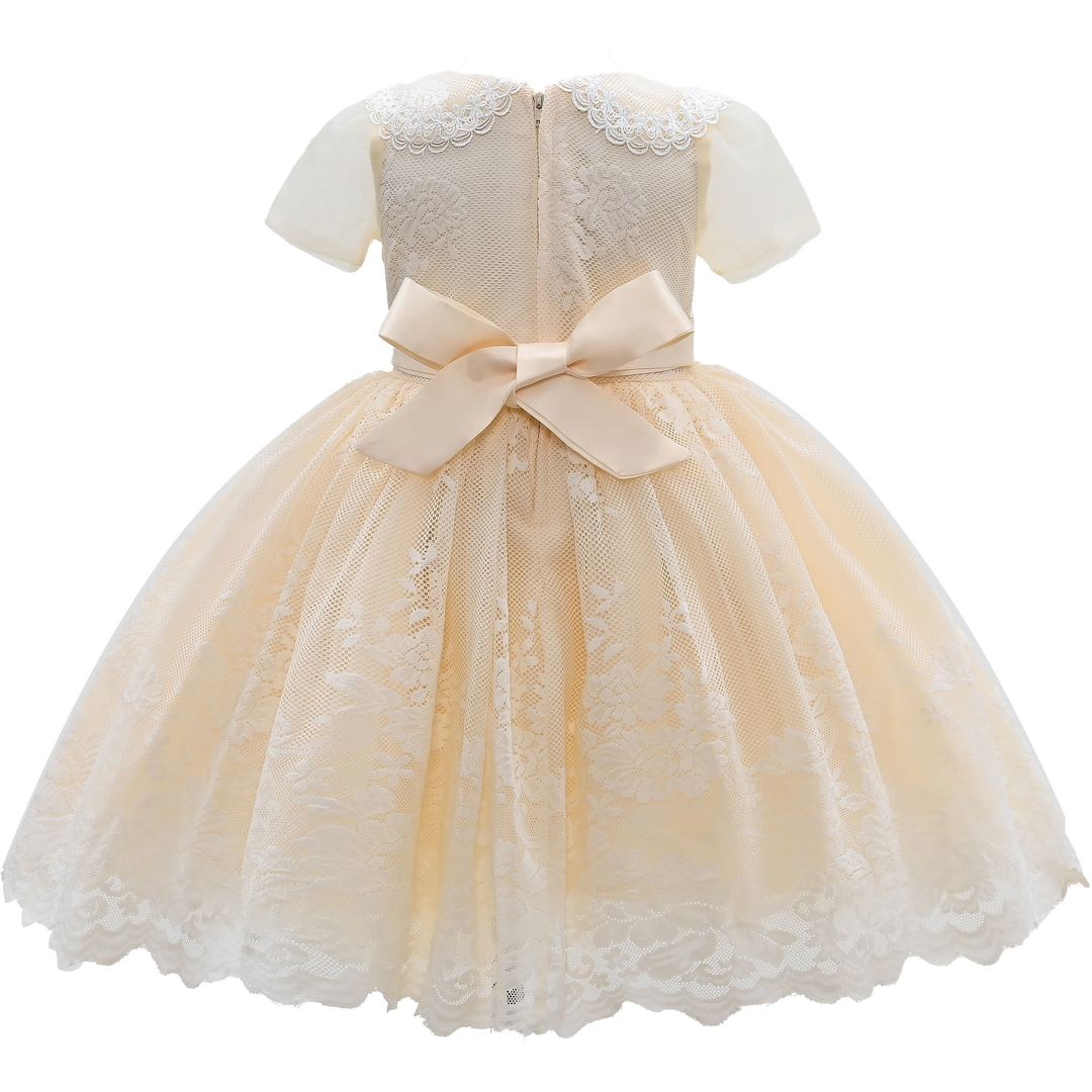 Overall, the Champagne Gold Dolly Lace Embroidered Dress combines elegance, comfort, and enchanting design elements, making it a perfect addition to any young girl's wardrobe. This dress ensures your child looks and feels special at any event.