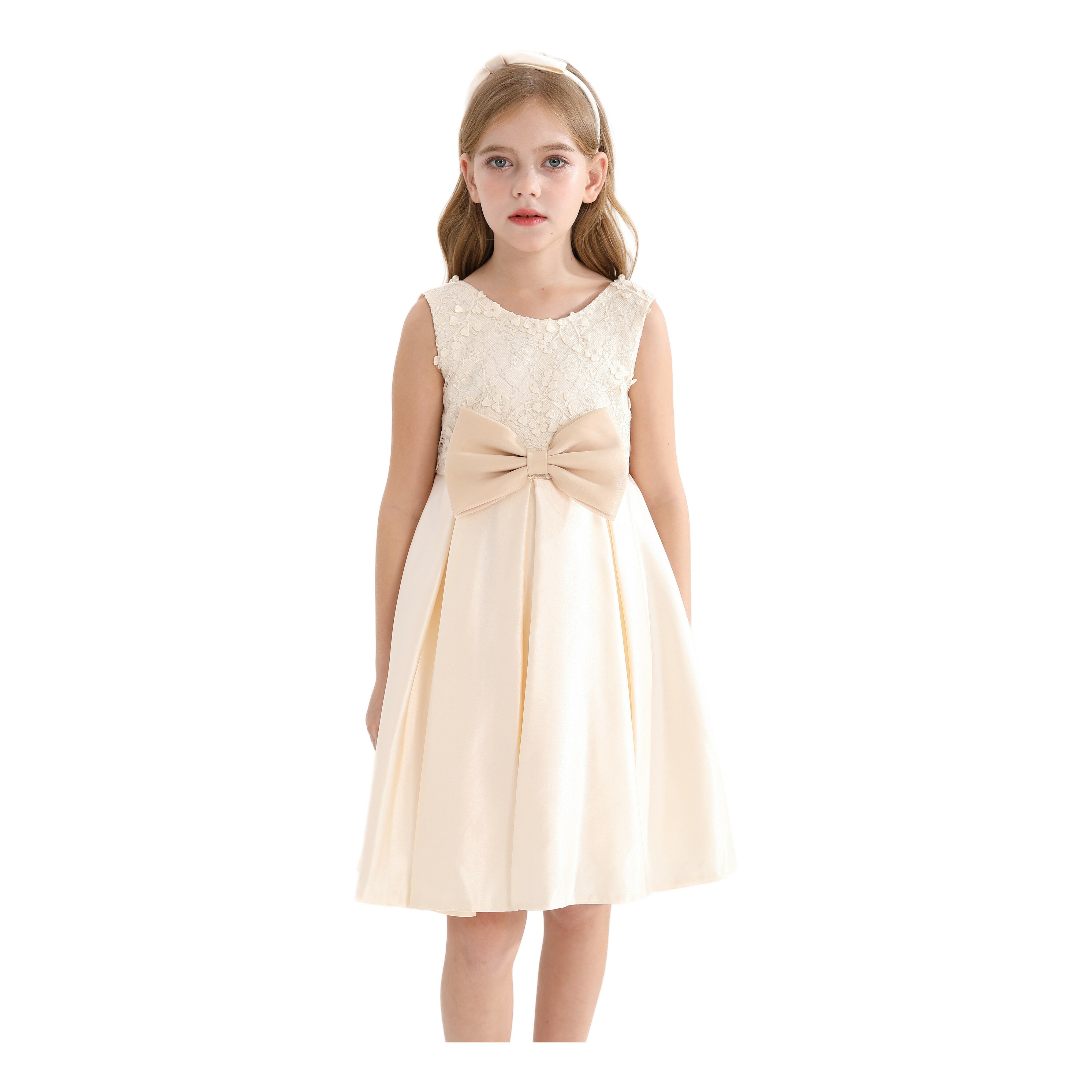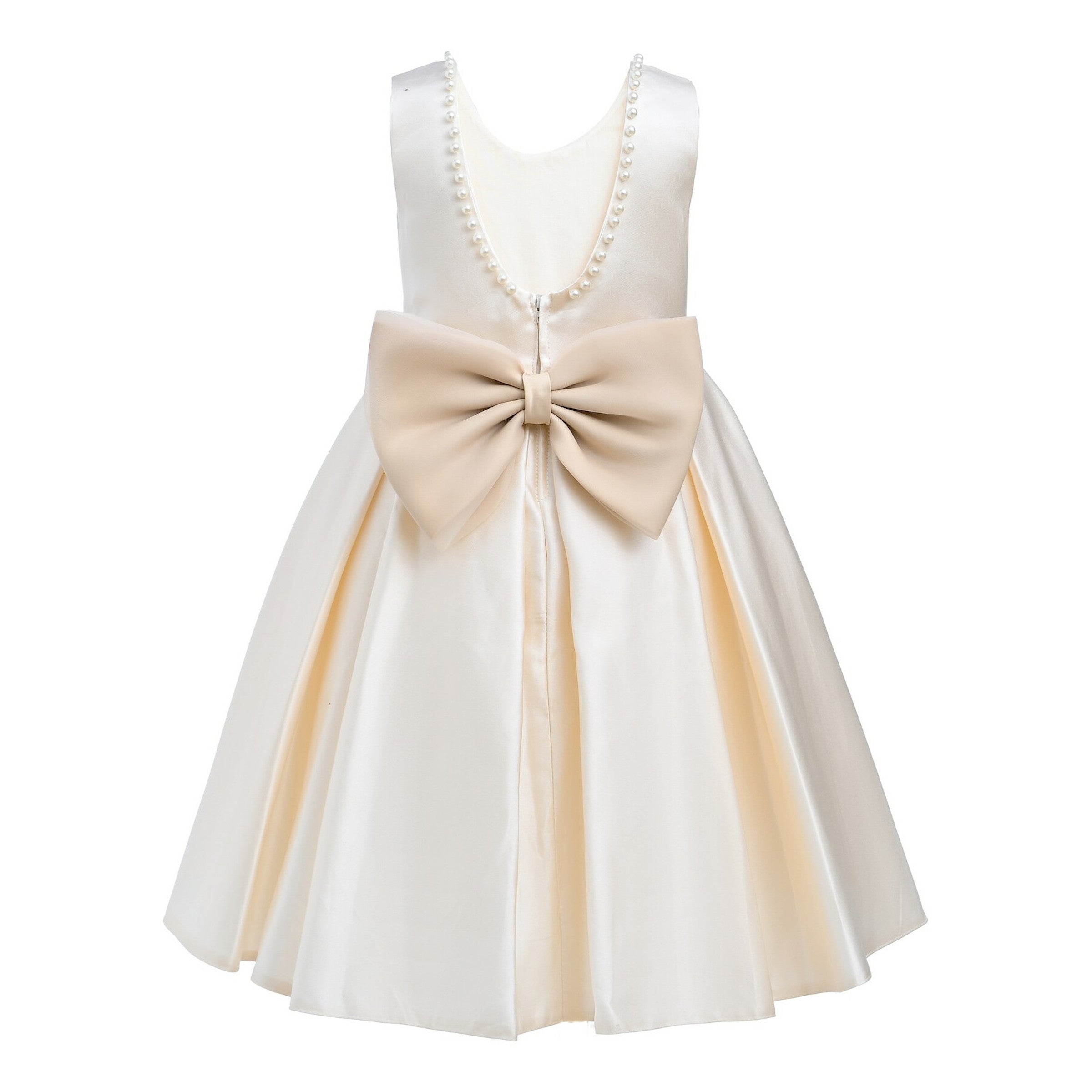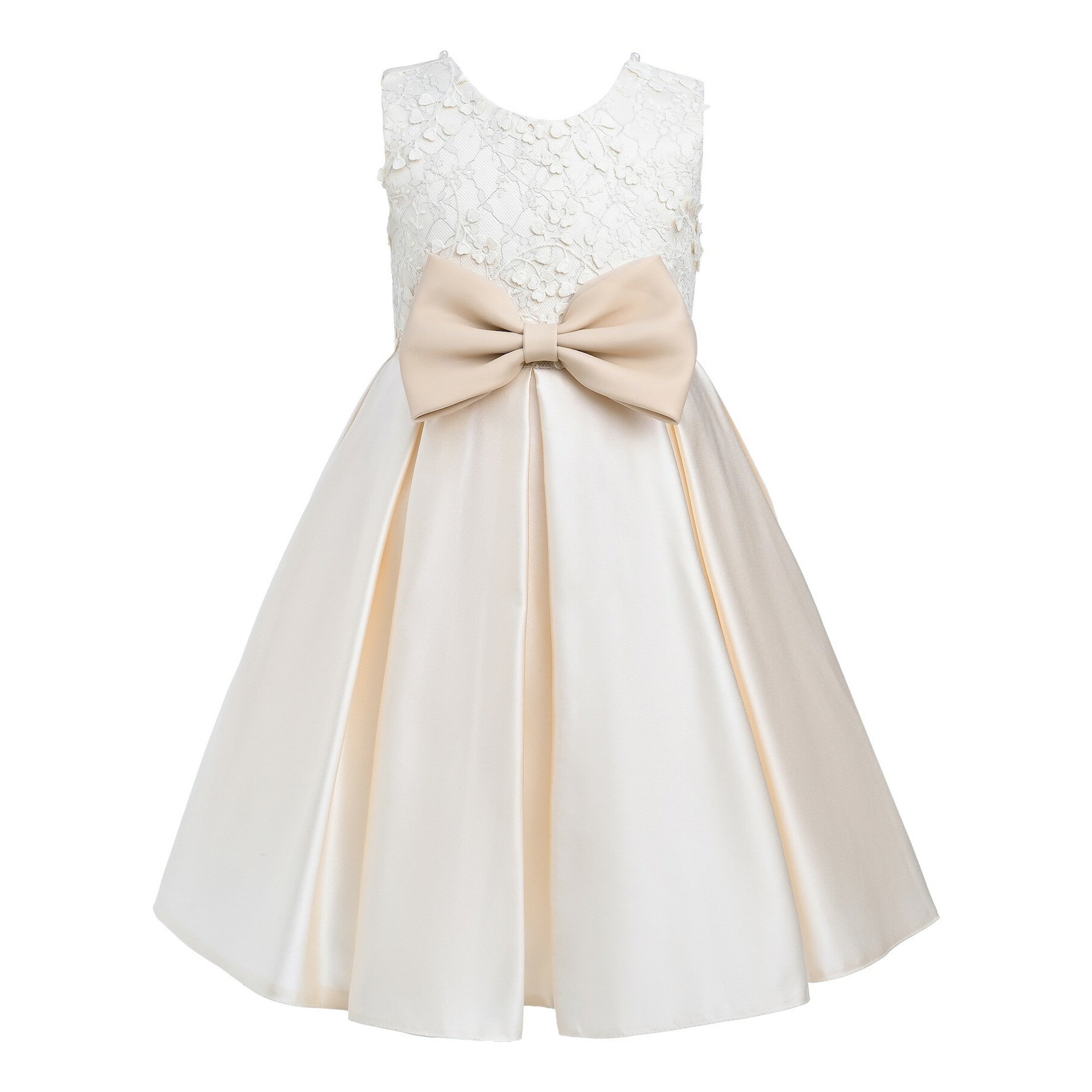 The Champagne Hampton Sleeveless Double Bow Dress for kid girls from Tulleen is a beautiful and elegant choice for any special occasion. This dress features a sleeveless floral embroidered bodice, adding a touch of sophistication and charm. Firstly, the large bows in the front and back enhance the dress's elegance and create a stunning silhouette.