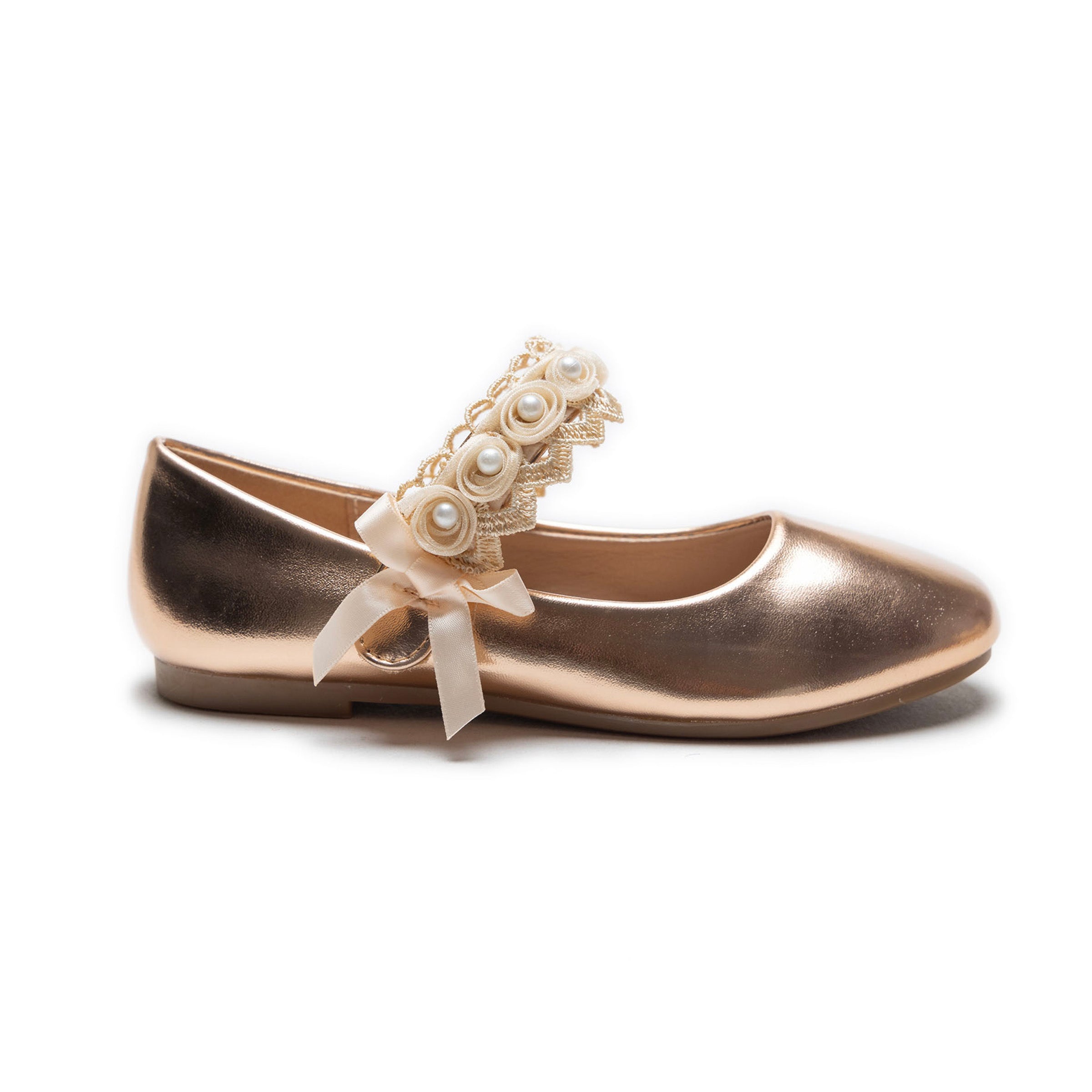 The Champagne Patent Rose Pearl Doily Flats by Tulleen are crafted for comfort and style, offering a chic look with every step. Perfect for parties, celebrations, or everyday wear, these flats add an elegant touch to any outfit, making them a must-have accessory for any young girl's wardrobe.