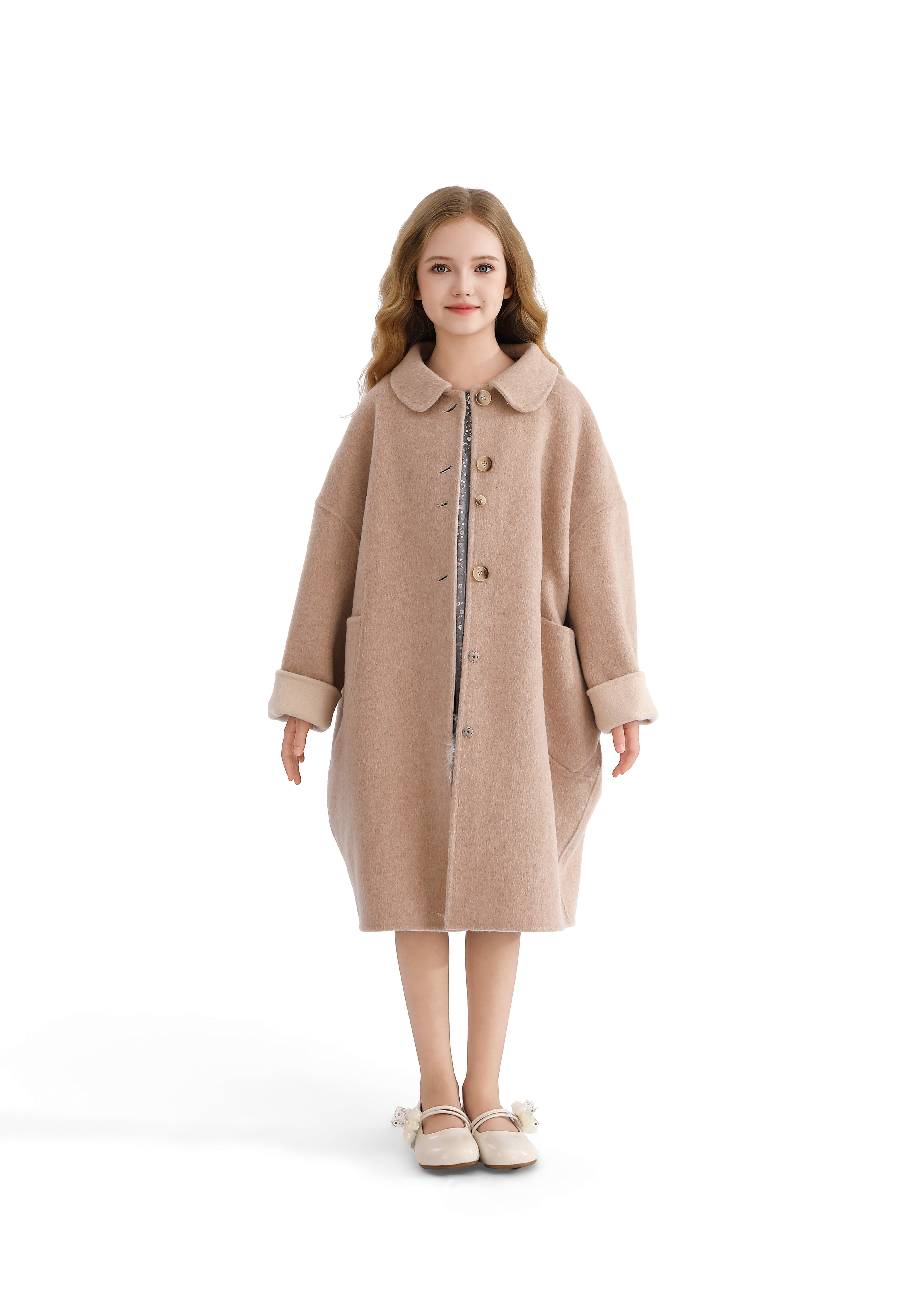 A timeless layer for cooler days, this champagne wool coat blends classic charm with cozy comfort. Its oversized silhouette and soft texture make it a standout for stylish strolls and seasonal outings.