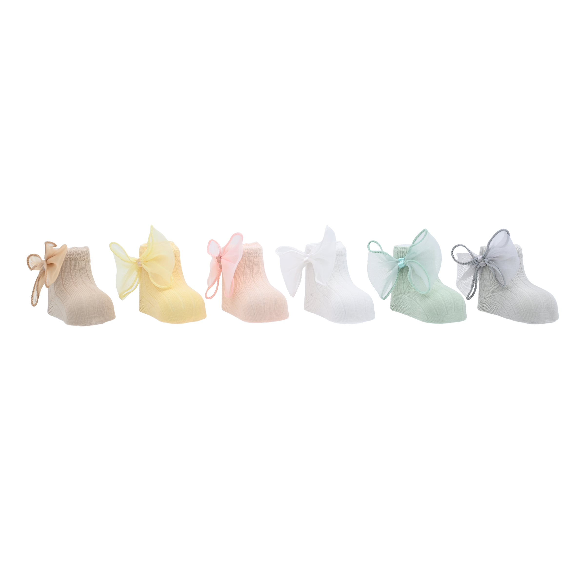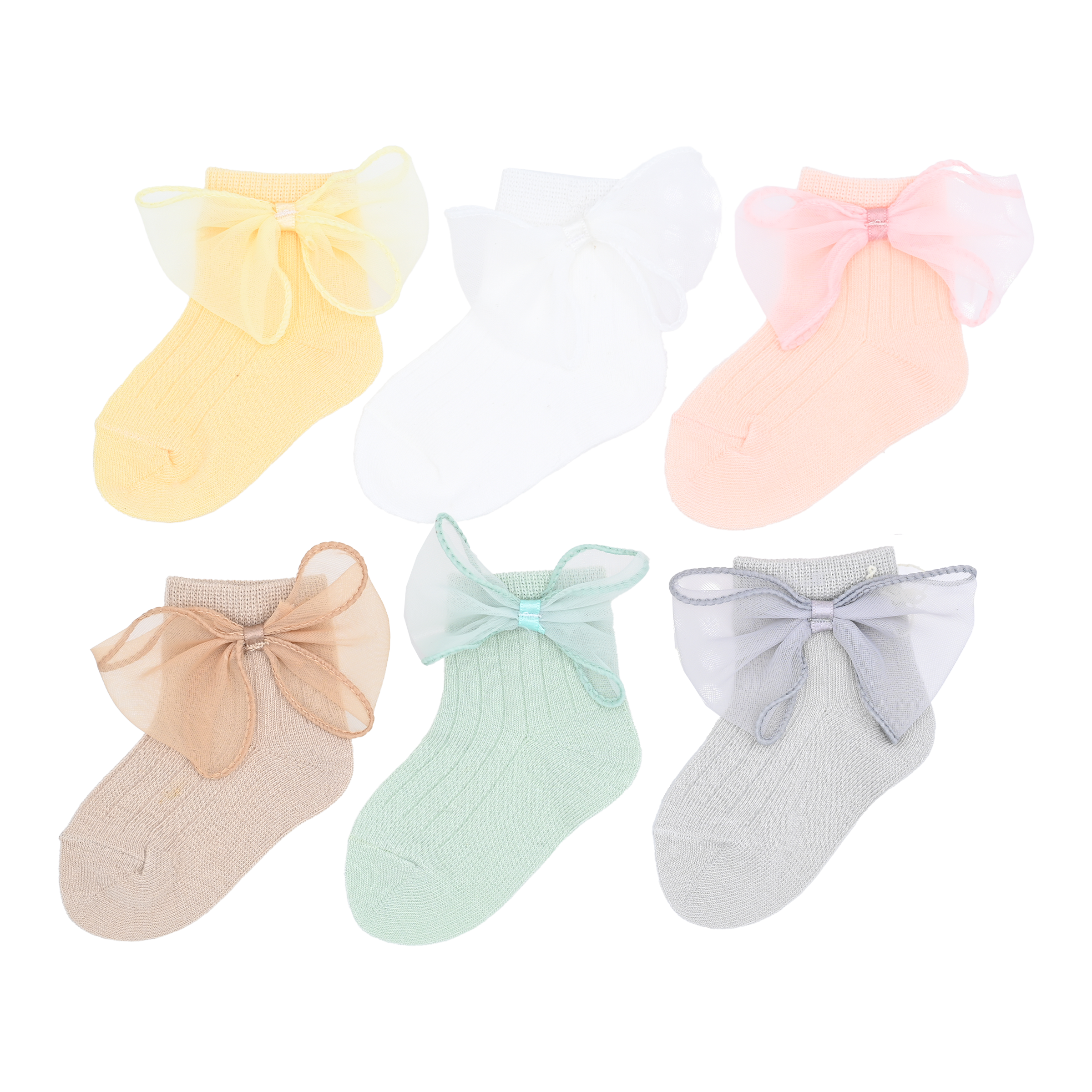 Each pair is adorned with a delicate tulle bow, adding a whimsical touch of elegance to their design. The collection boasts an array of beautiful colors, including yellow, pink, gray, green, white, and beige, offering plenty of options to match different outfits and moods.