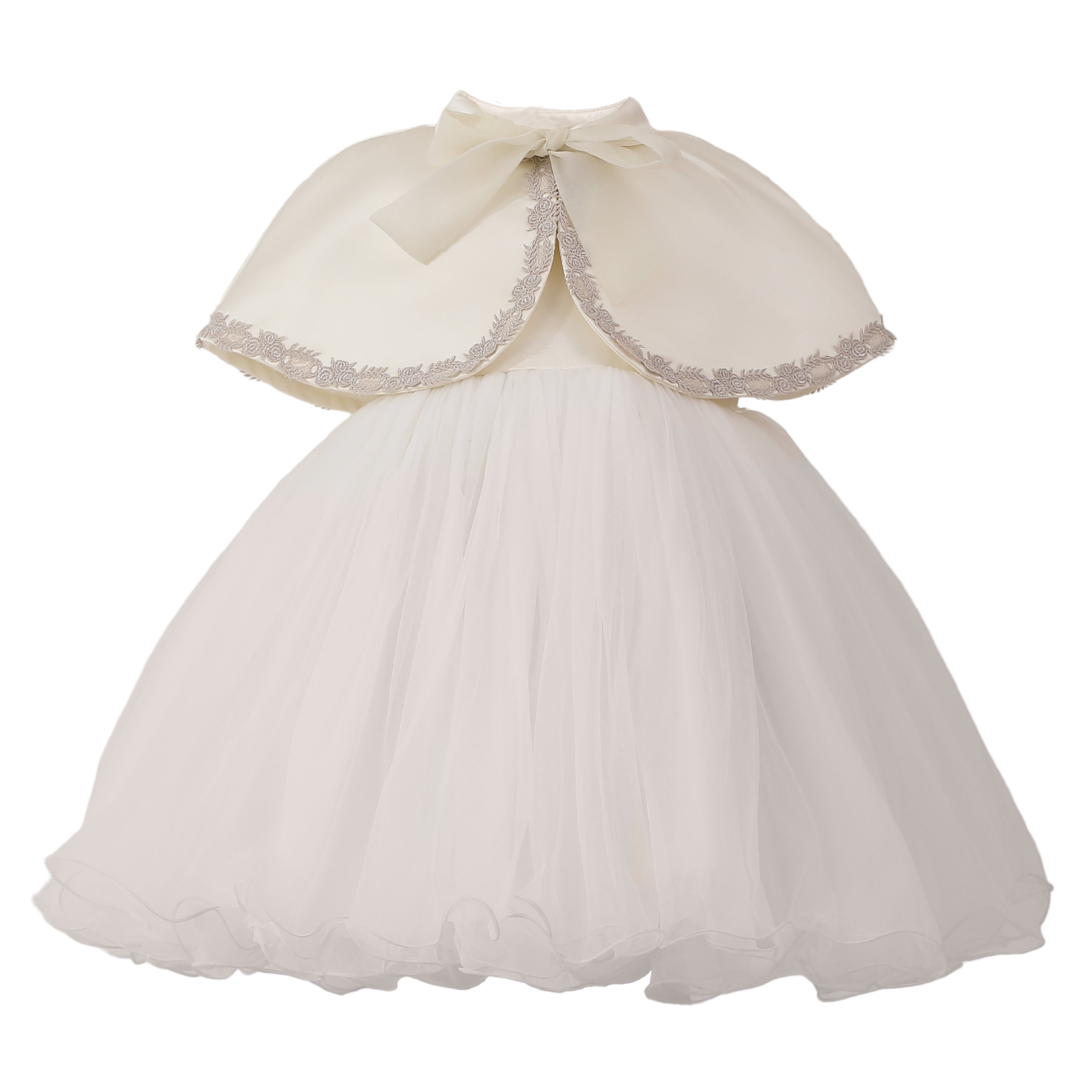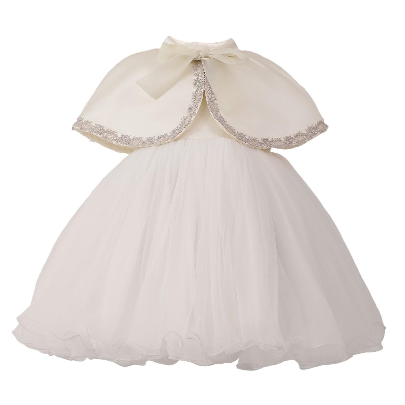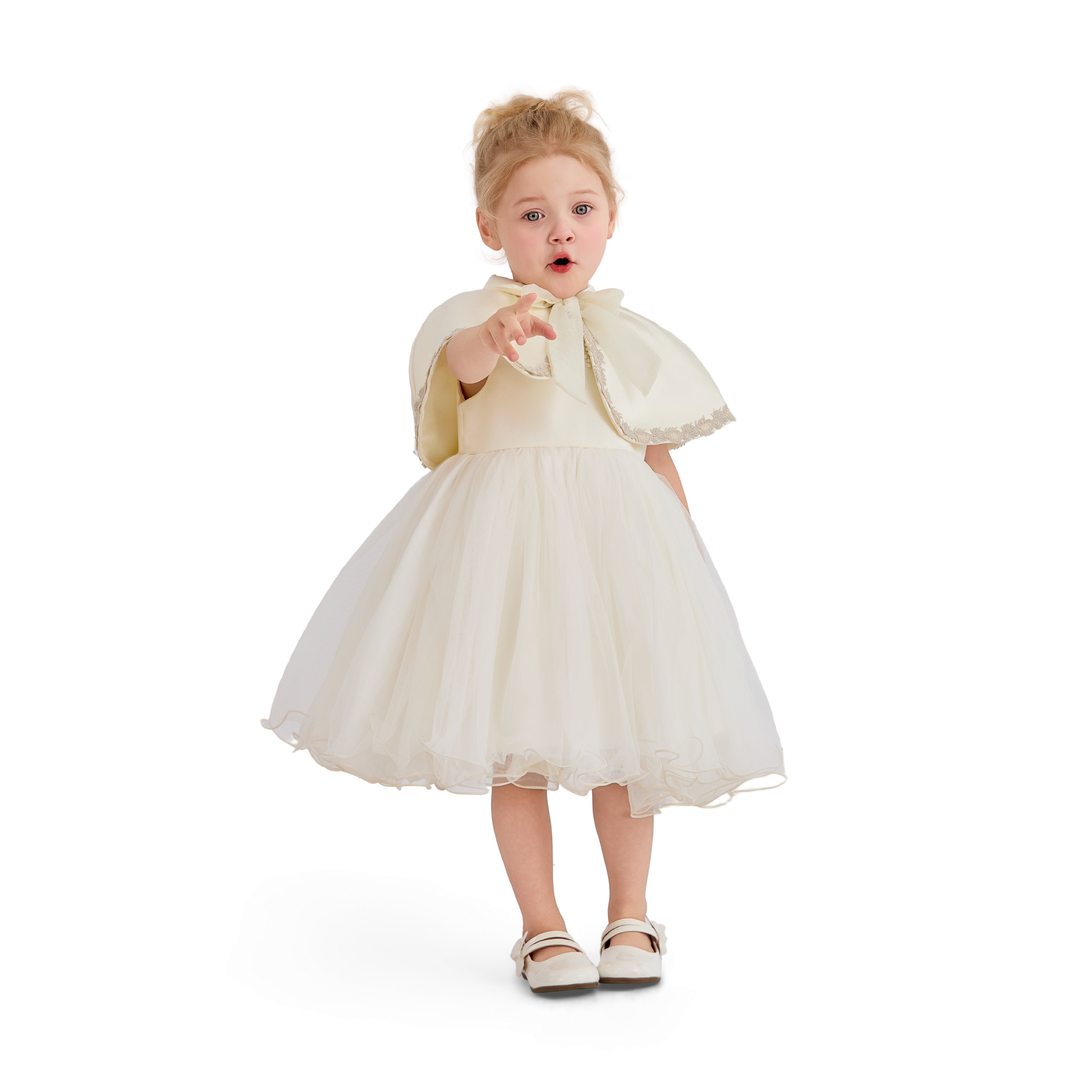 A charming dress for a child that balances classic refinement with a playful statement bow; the structured bodice and full, flared skirt create a polished silhouette perfect for weddings, christenings, and formal celebrations.