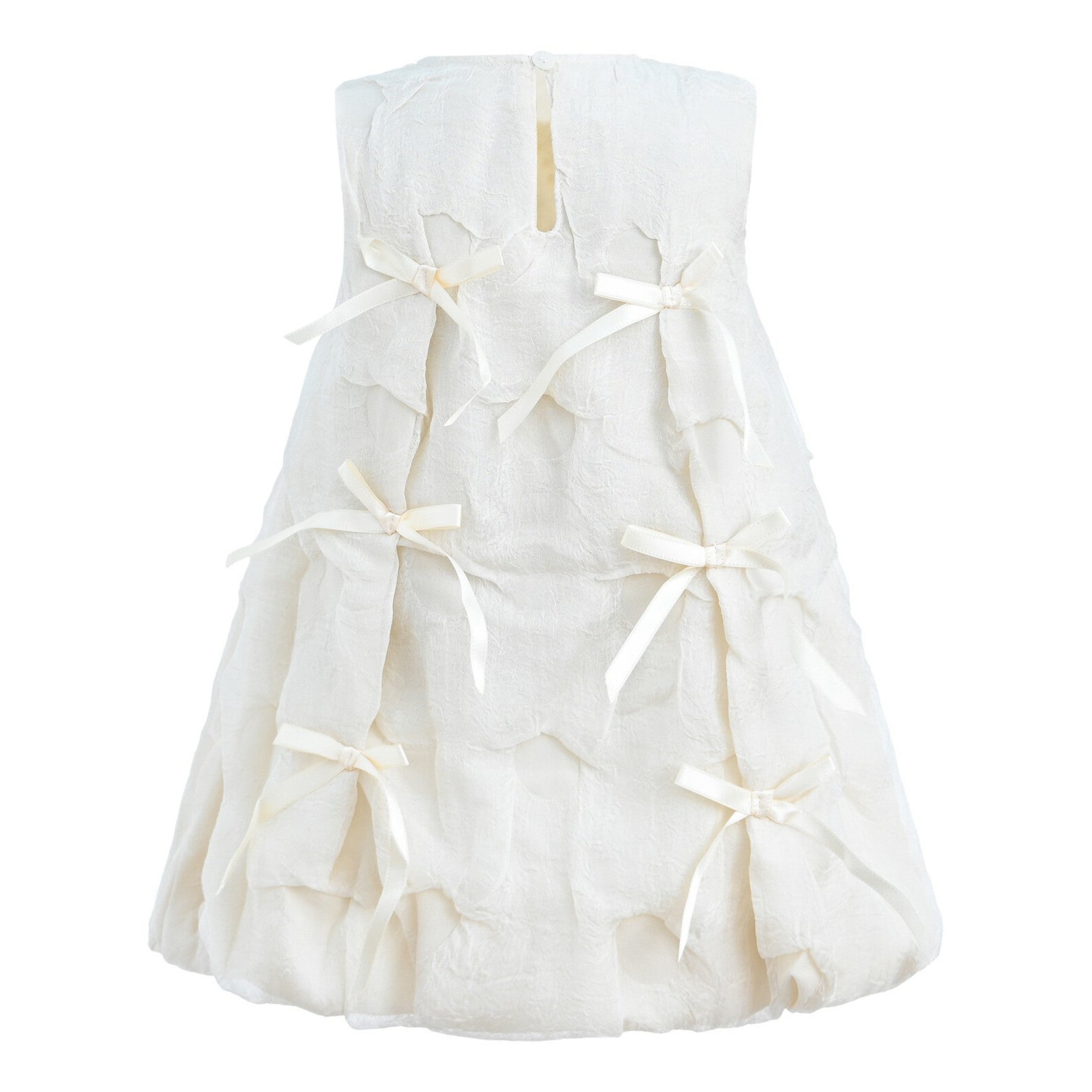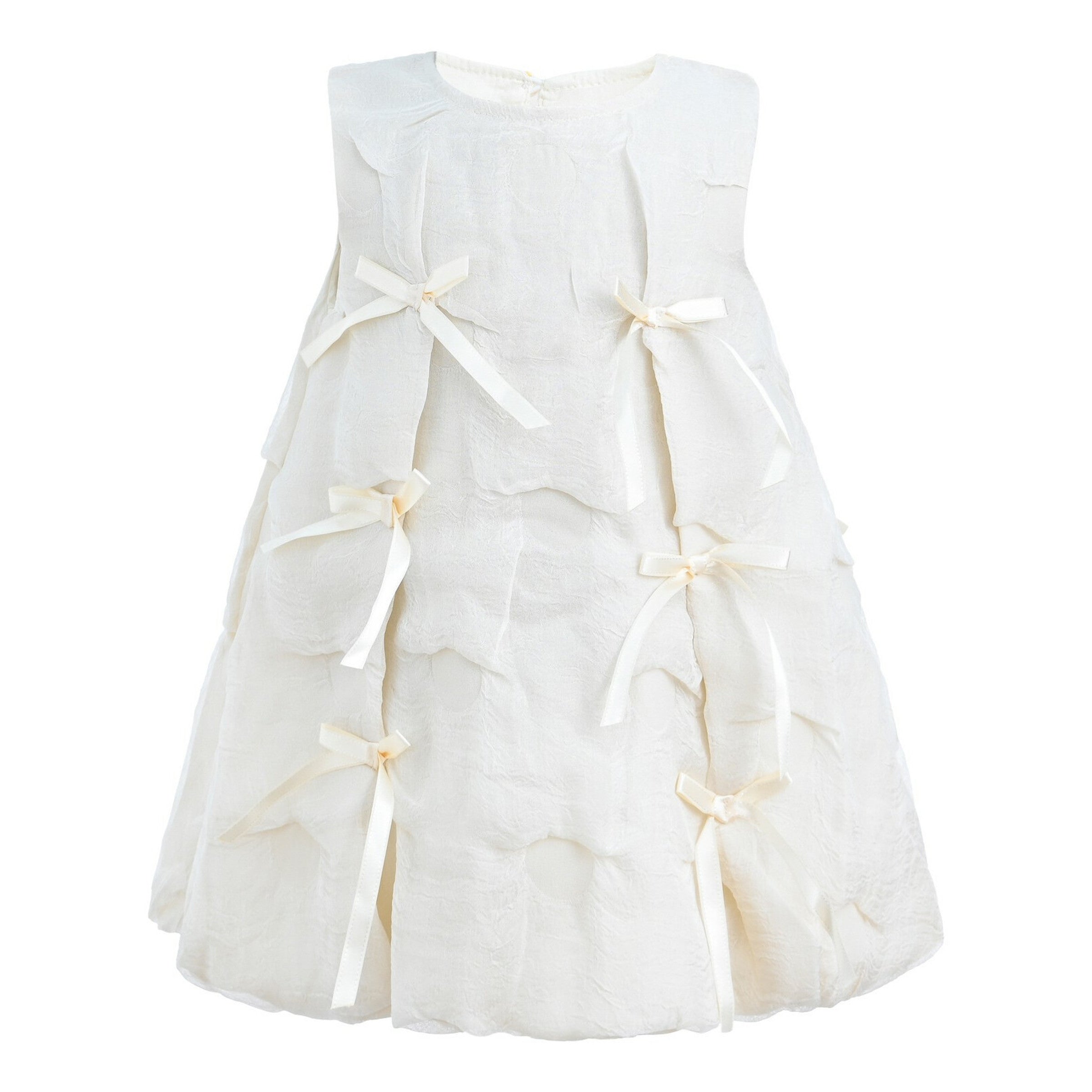 Cream bow appliques trapeze dress for kid and baby girls from Mimi Tutu. Featuring a sleeveless cut, all over satin bow decoration with button closure.