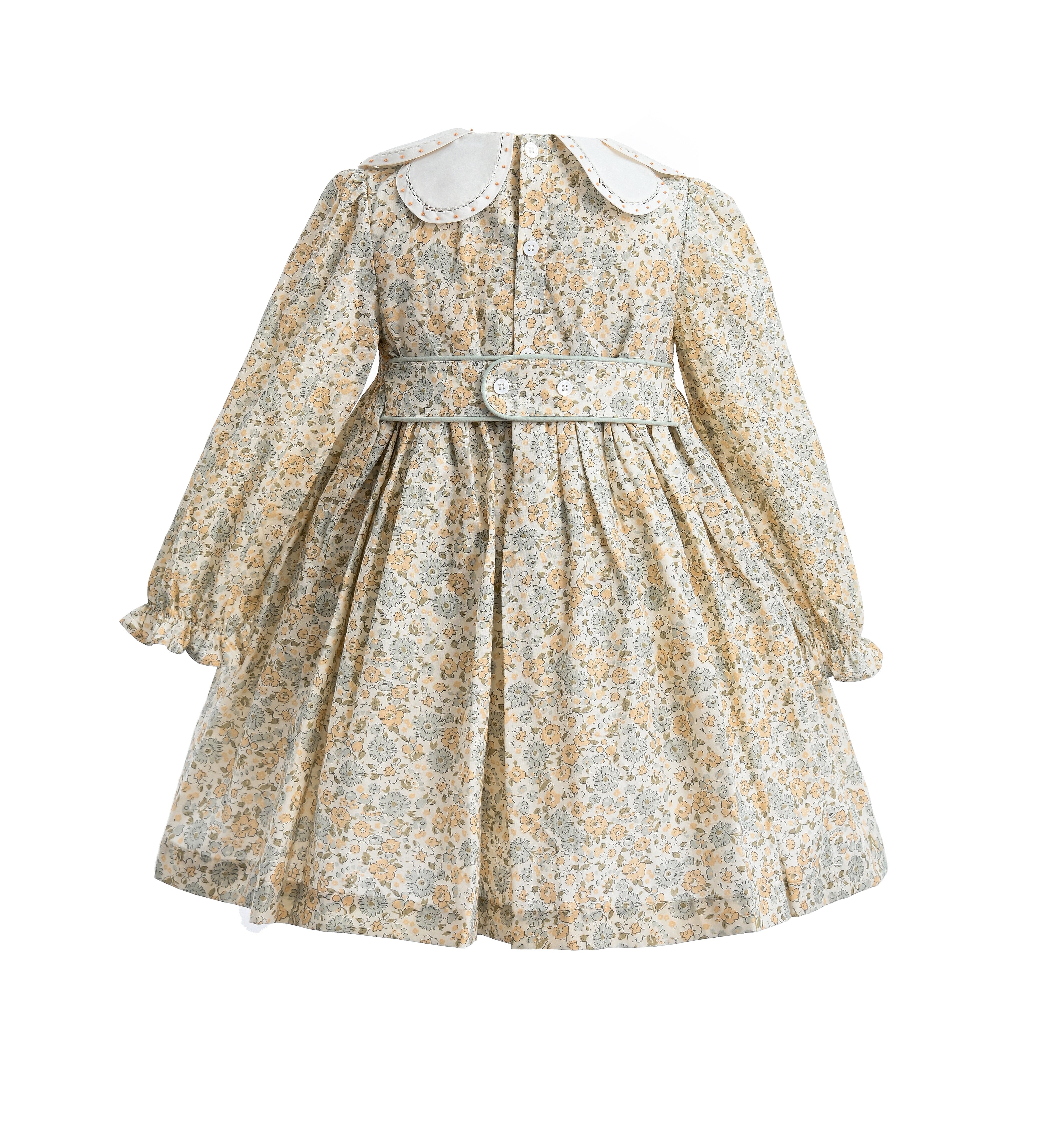 A vintage-inspired floral dress in soft cream tones, featuring delicate smocking and a full flared skirt. The scalloped Peter Pan collar and puffed long sleeves add timeless charm, perfect for formal outings or seasonal portraits.