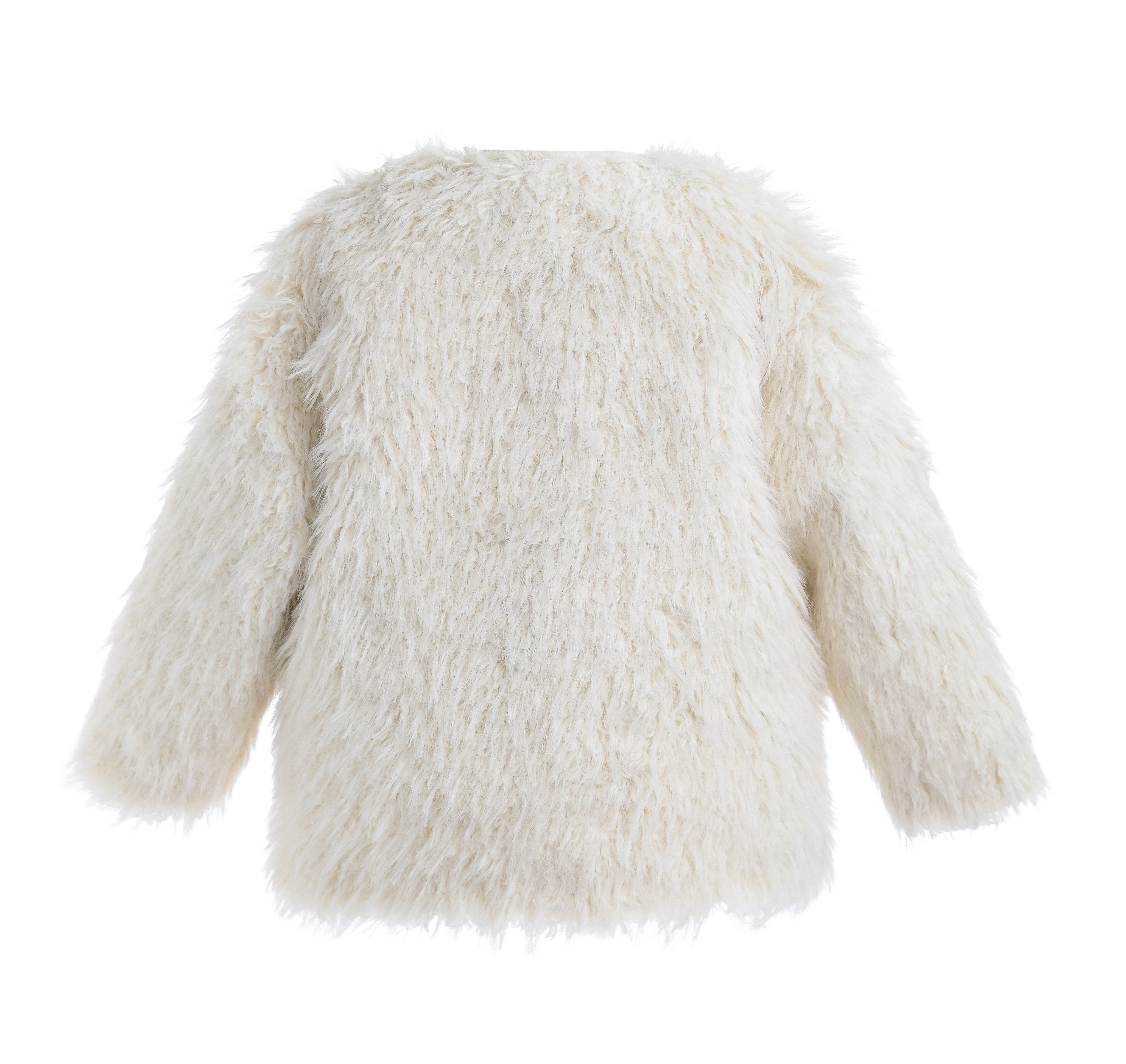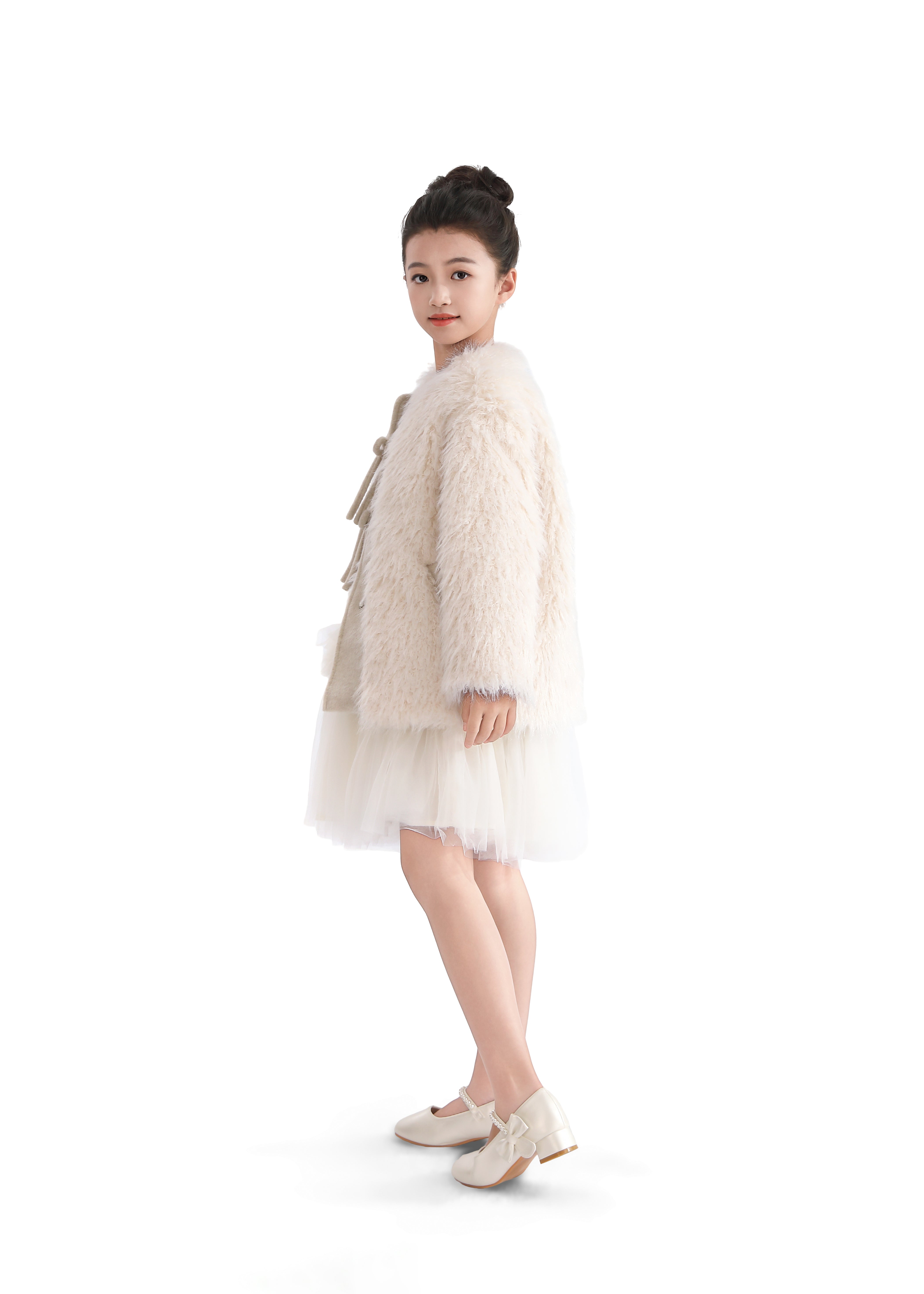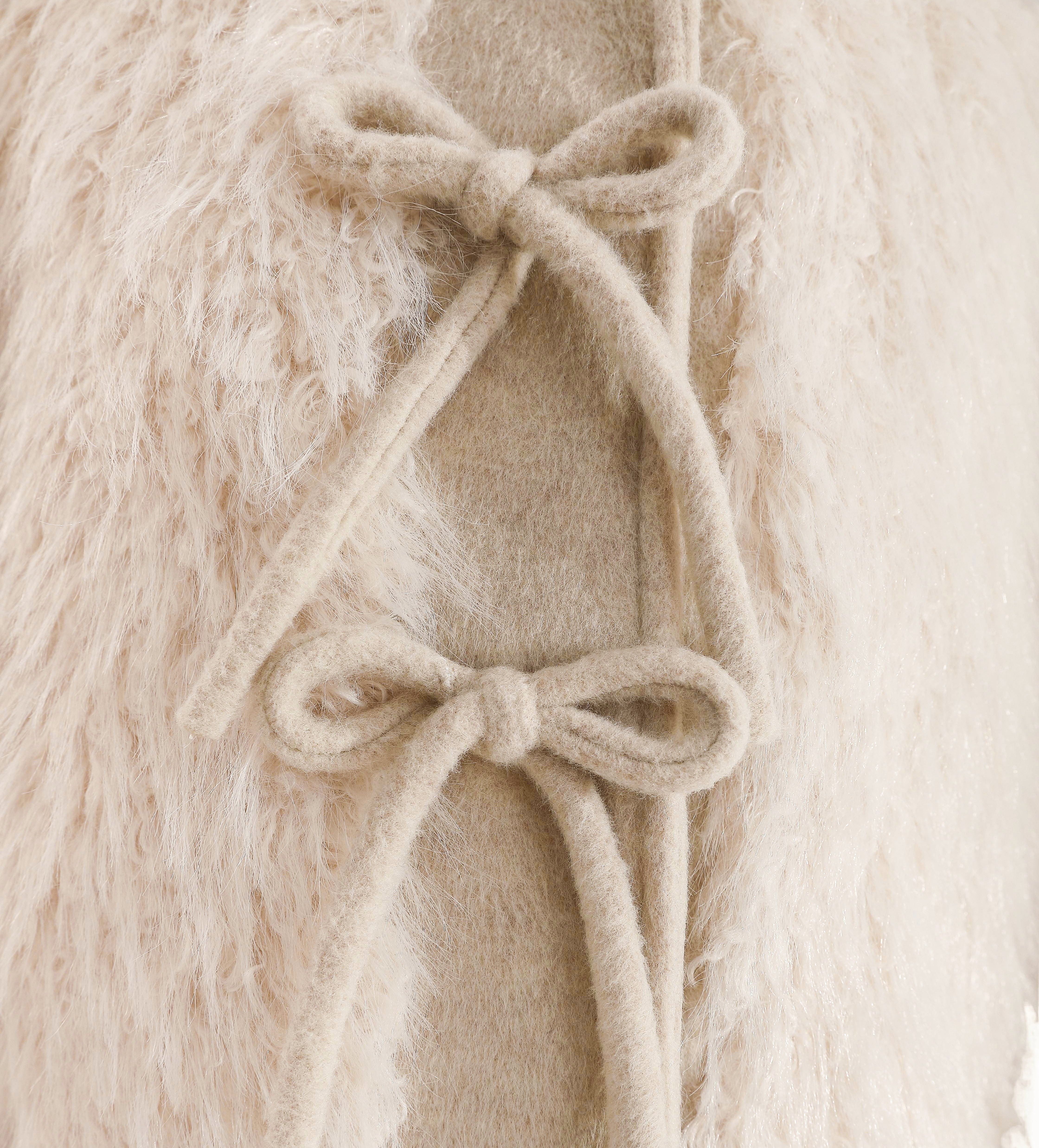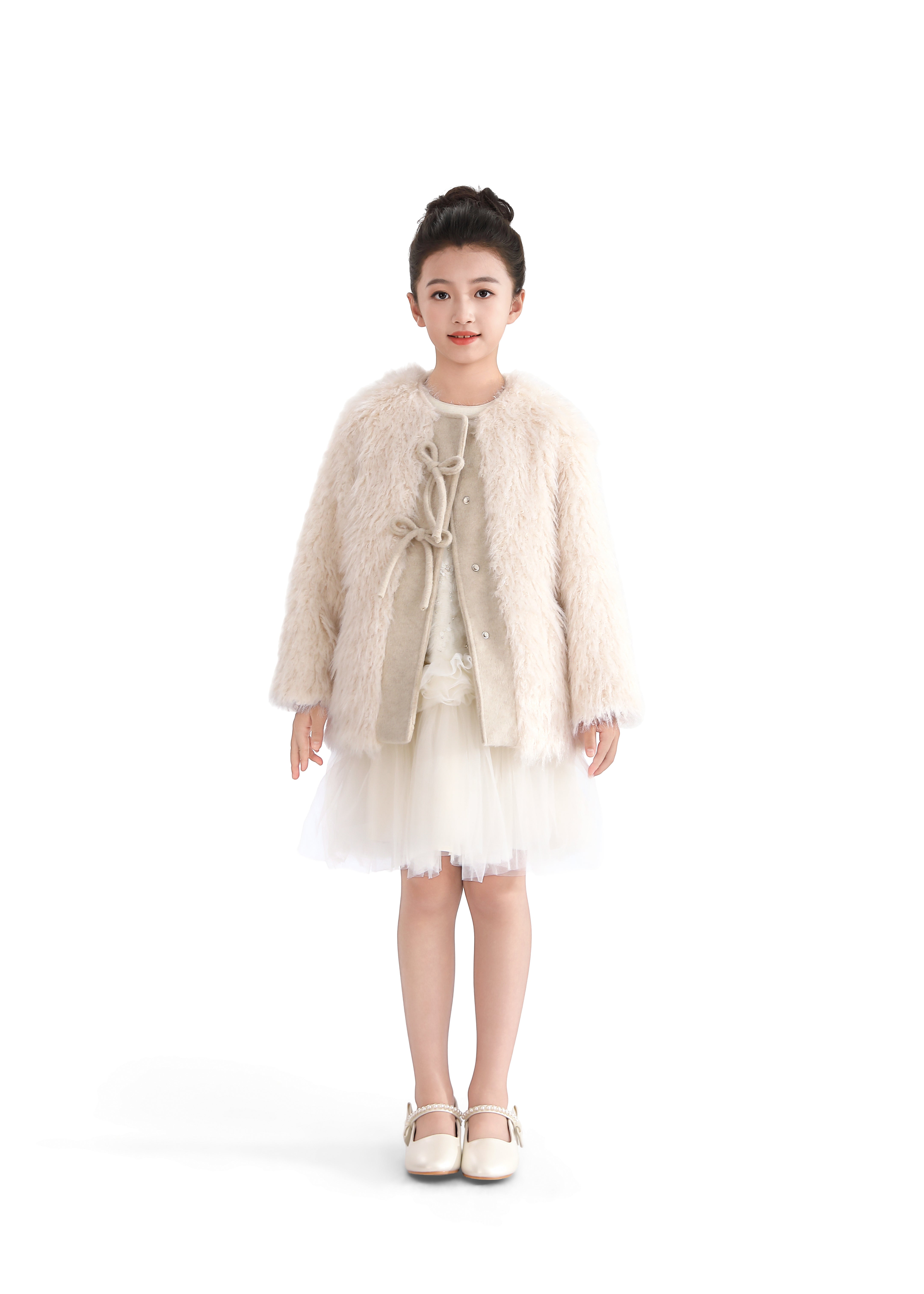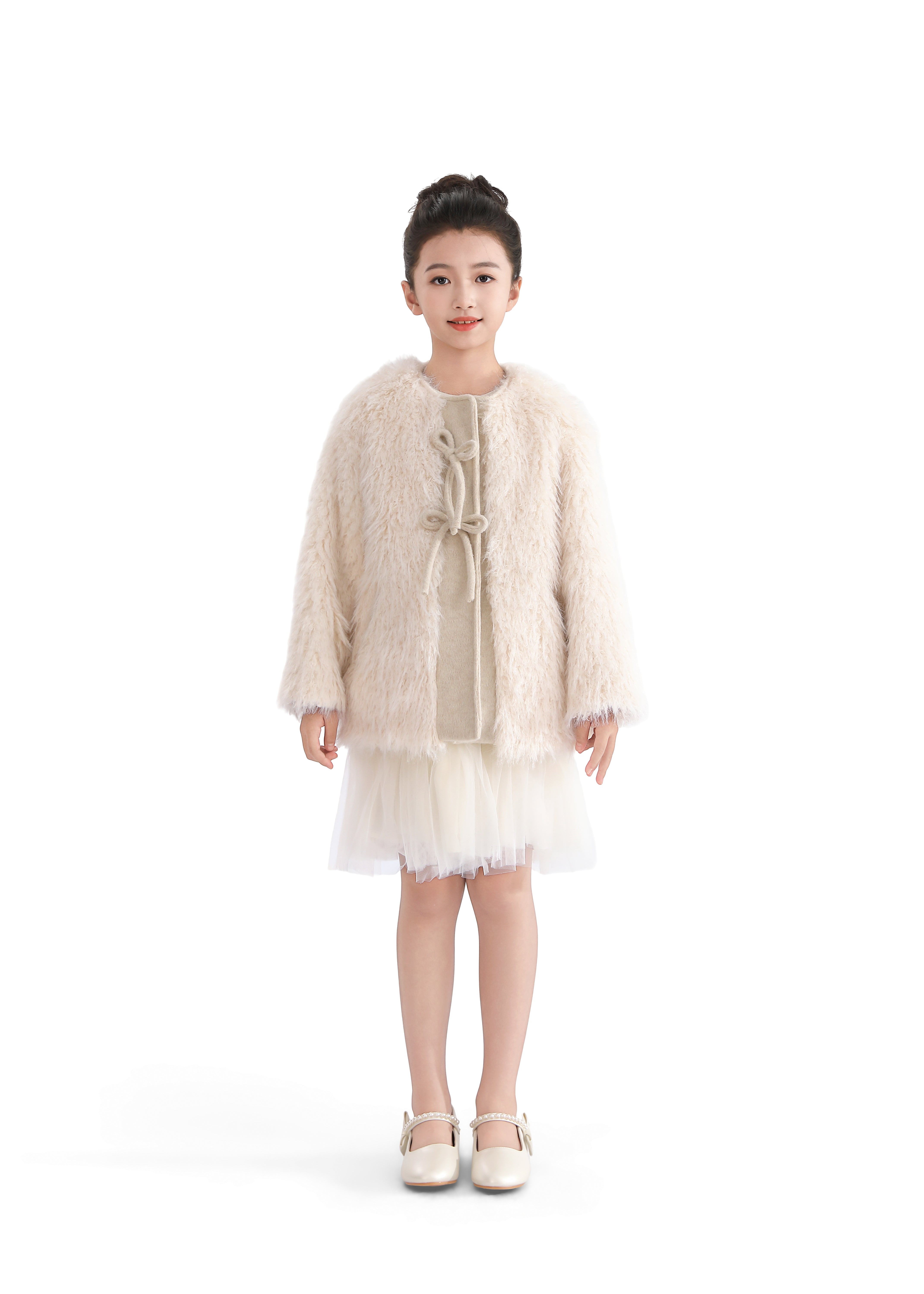 A charming blend of plush texture and tailored detail, this coat wraps little ones in warmth and elegance. The creamy faux fur exterior pairs beautifully with a soft wool-like panel, finished with two sweet bow-tied closures for a refined, playful touch.