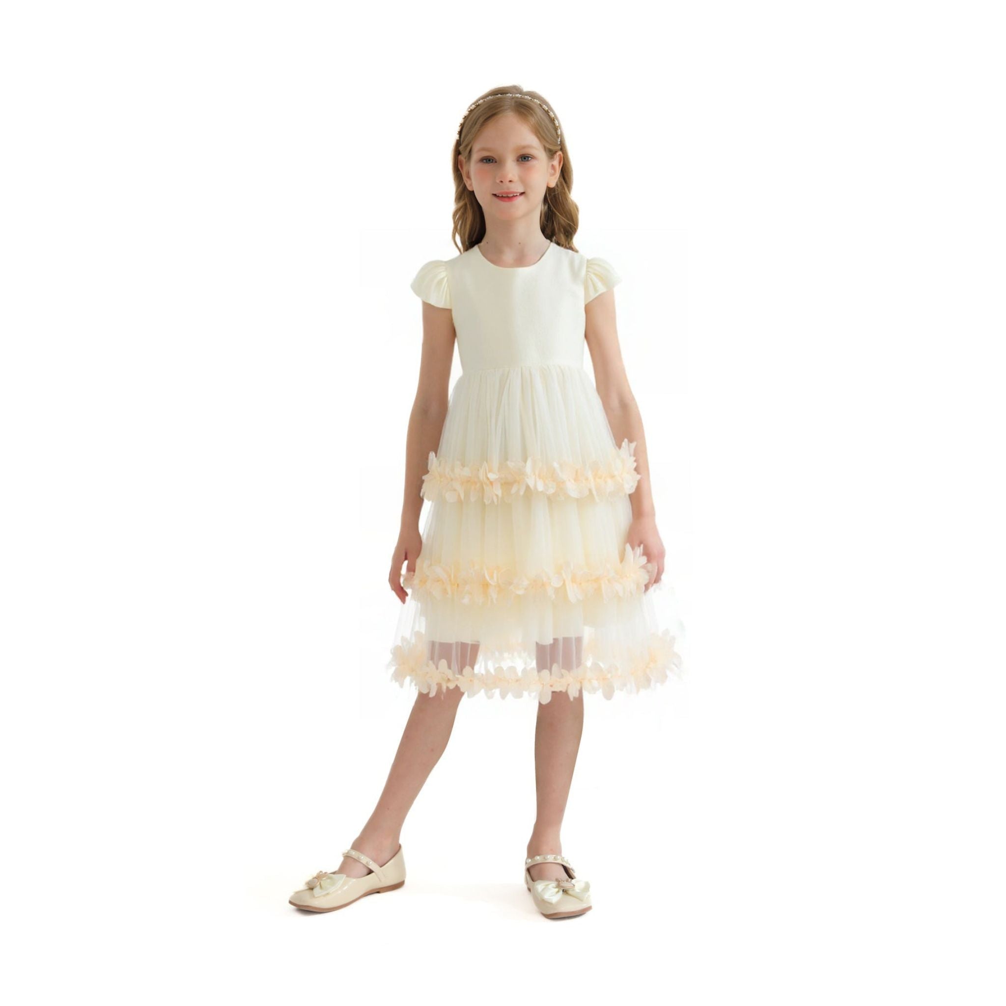 Crafted from breathable, lightweight fabric, the Cream Ferara Tiered Ruffle Dress ensures lasting comfort without compromising on elegance. Children can move freely, dance joyfully, and feel confident throughout the day. The ruffled tiers add just the right amount of volume and texture, while the structured flow keeps the silhouette picture-perfect from every angle.